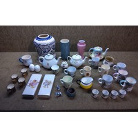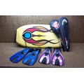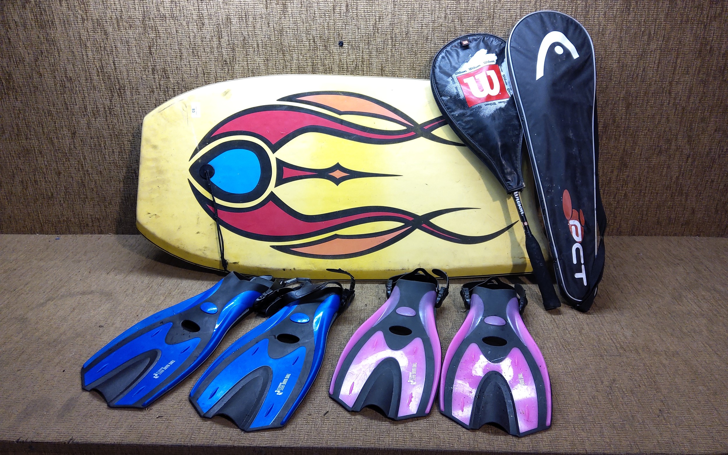 A body surf board, two sets of flippers, a Wilson badminton racket and a squash racket.