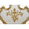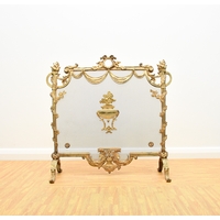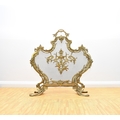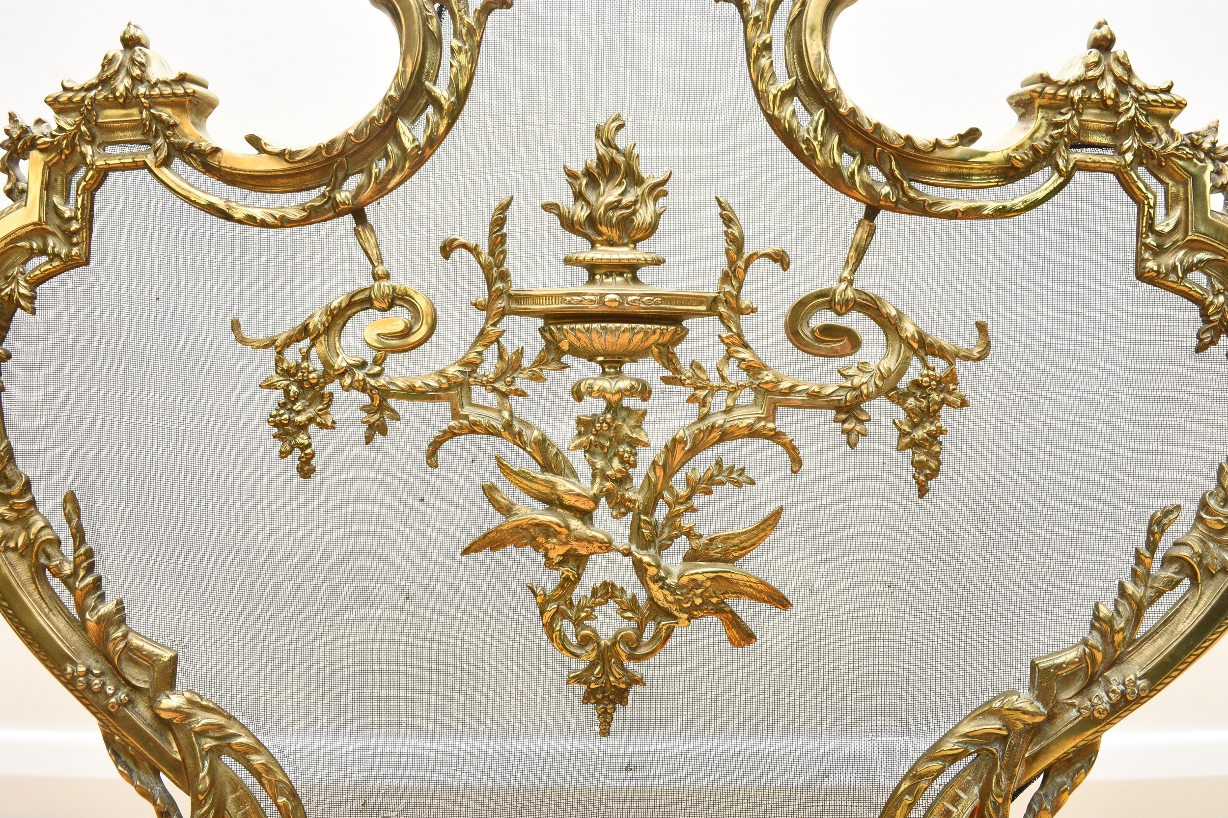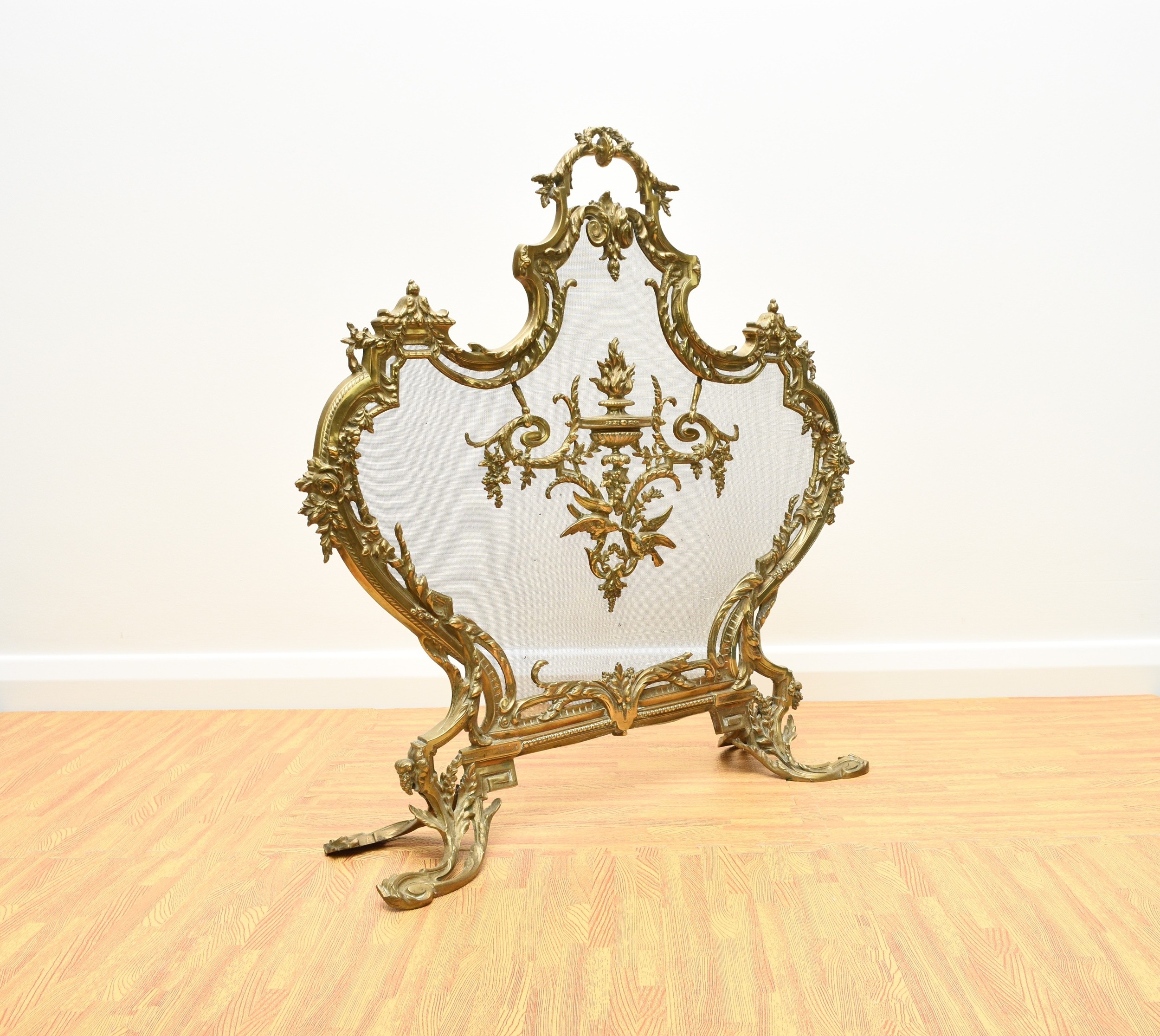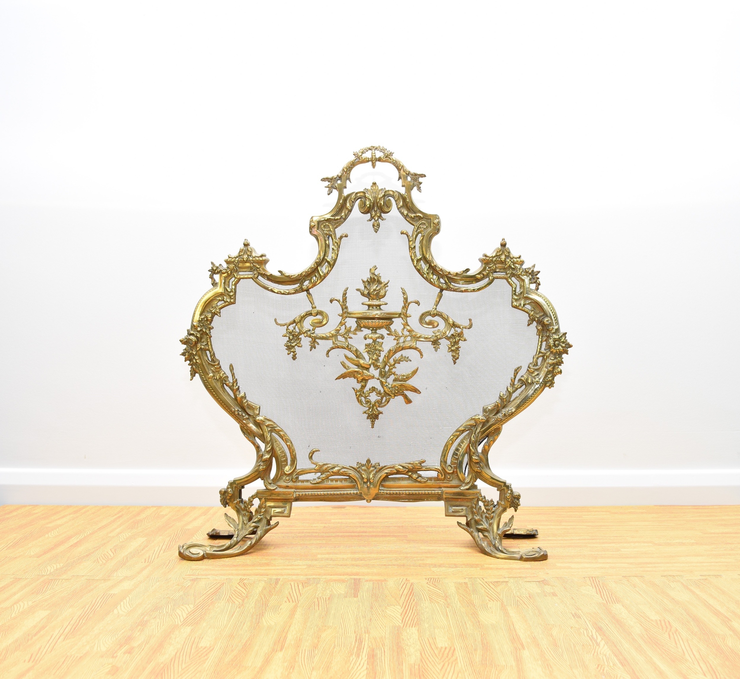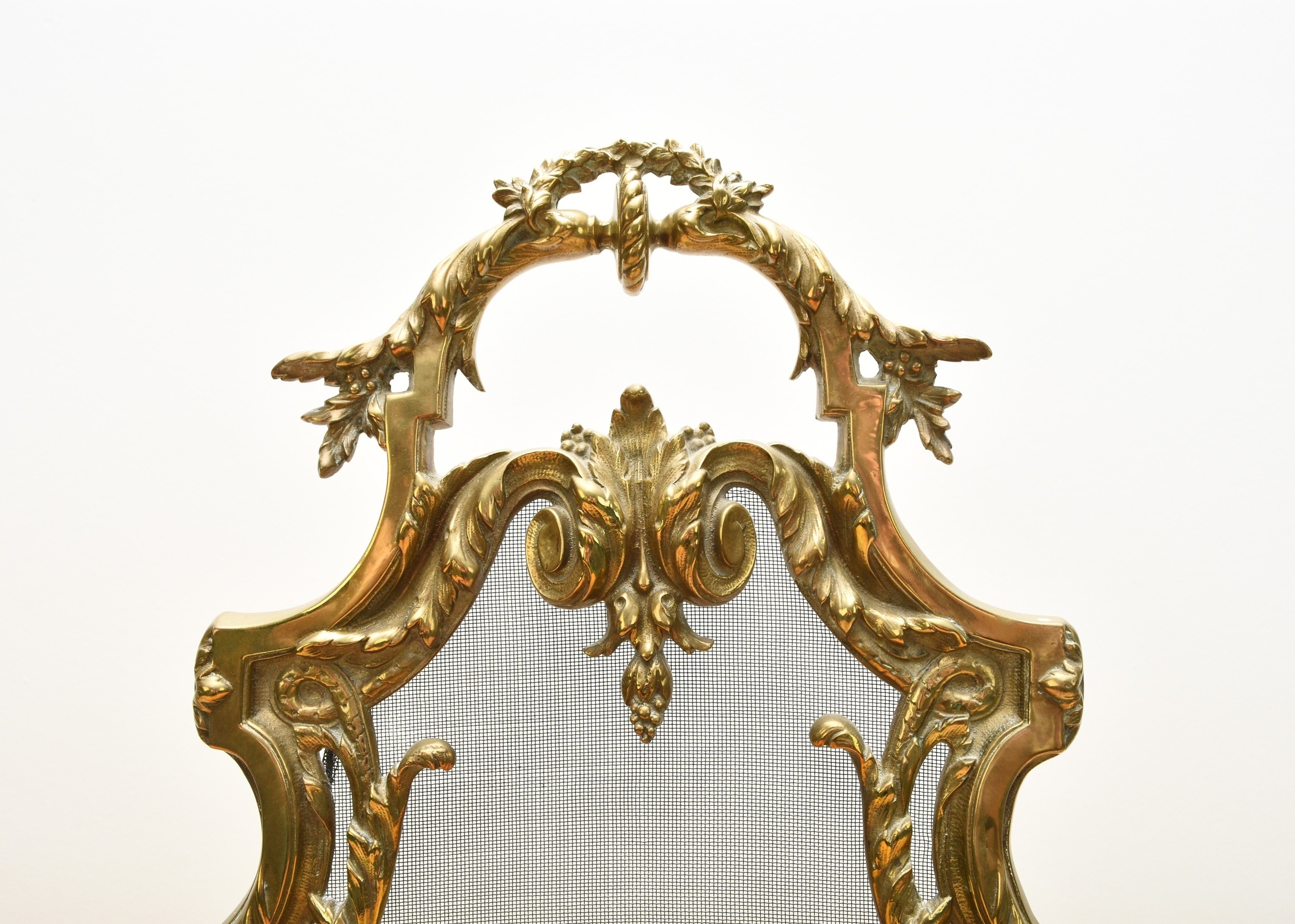 A rococo revival cast brass fire screen Of shield form and cast in relief with scrolling foliage and a central urn, with steel mesh backing. 74cm wide x 77cm high Condition:Good overall.