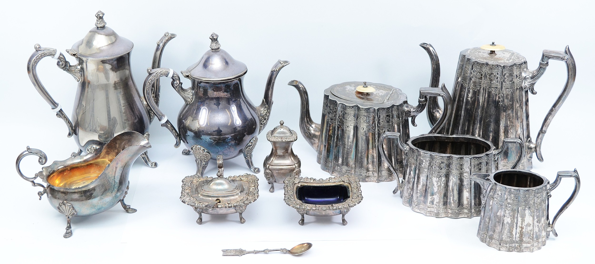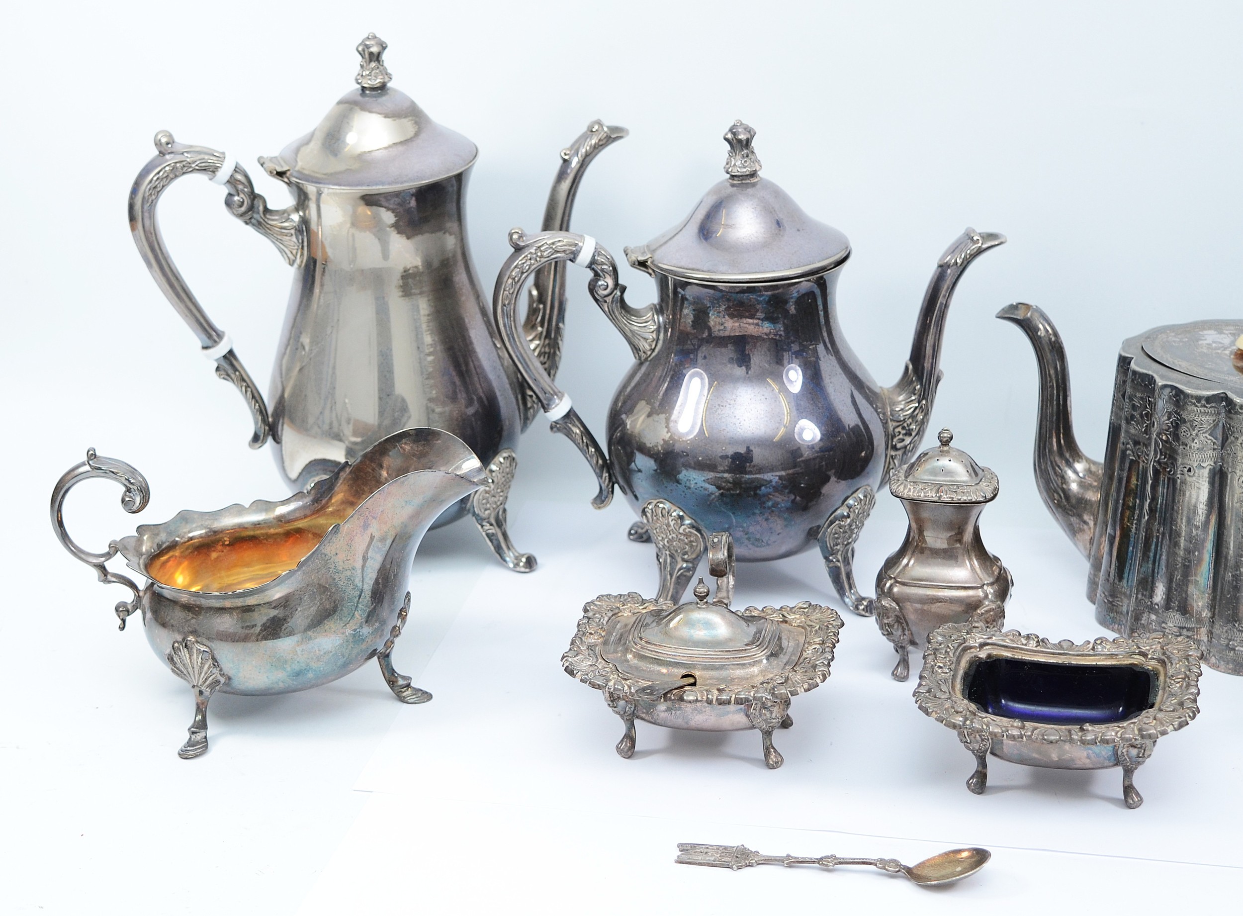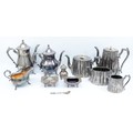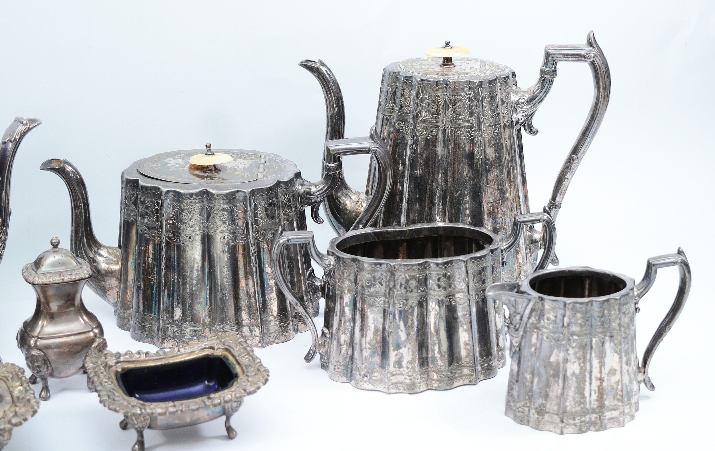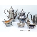 A four piece silver tea set, compromising of a teapot, coffee pot, milk jug and twin handled sugar bowl, all with bright cut floral decoration, by Thomas Otley & Sons, together with another plated tea pot and matching coffee pot, a plates open salt with glass liner, a plated condiment jar with glass liner, and a plated sauce boat. (1 box)