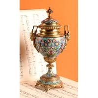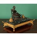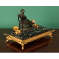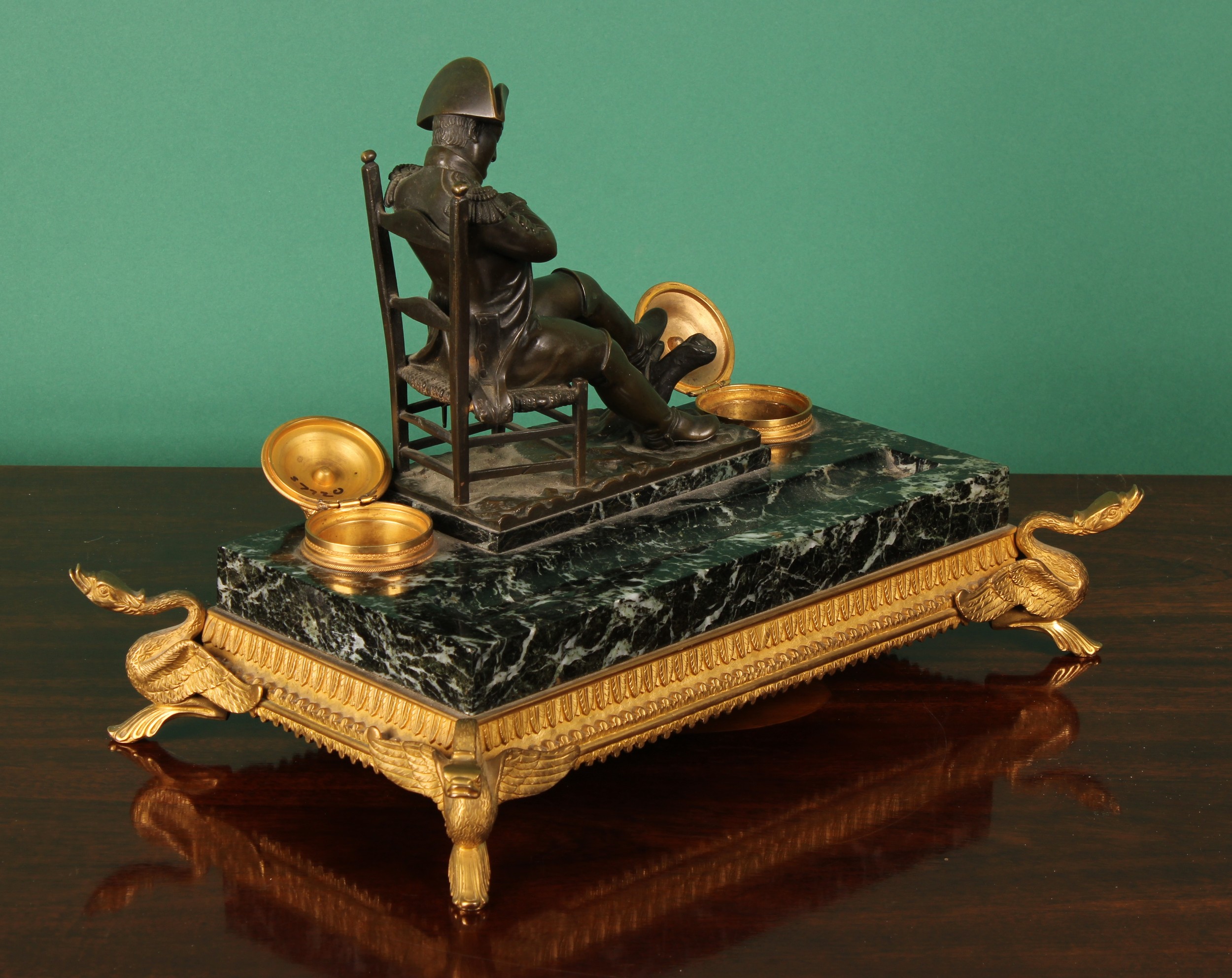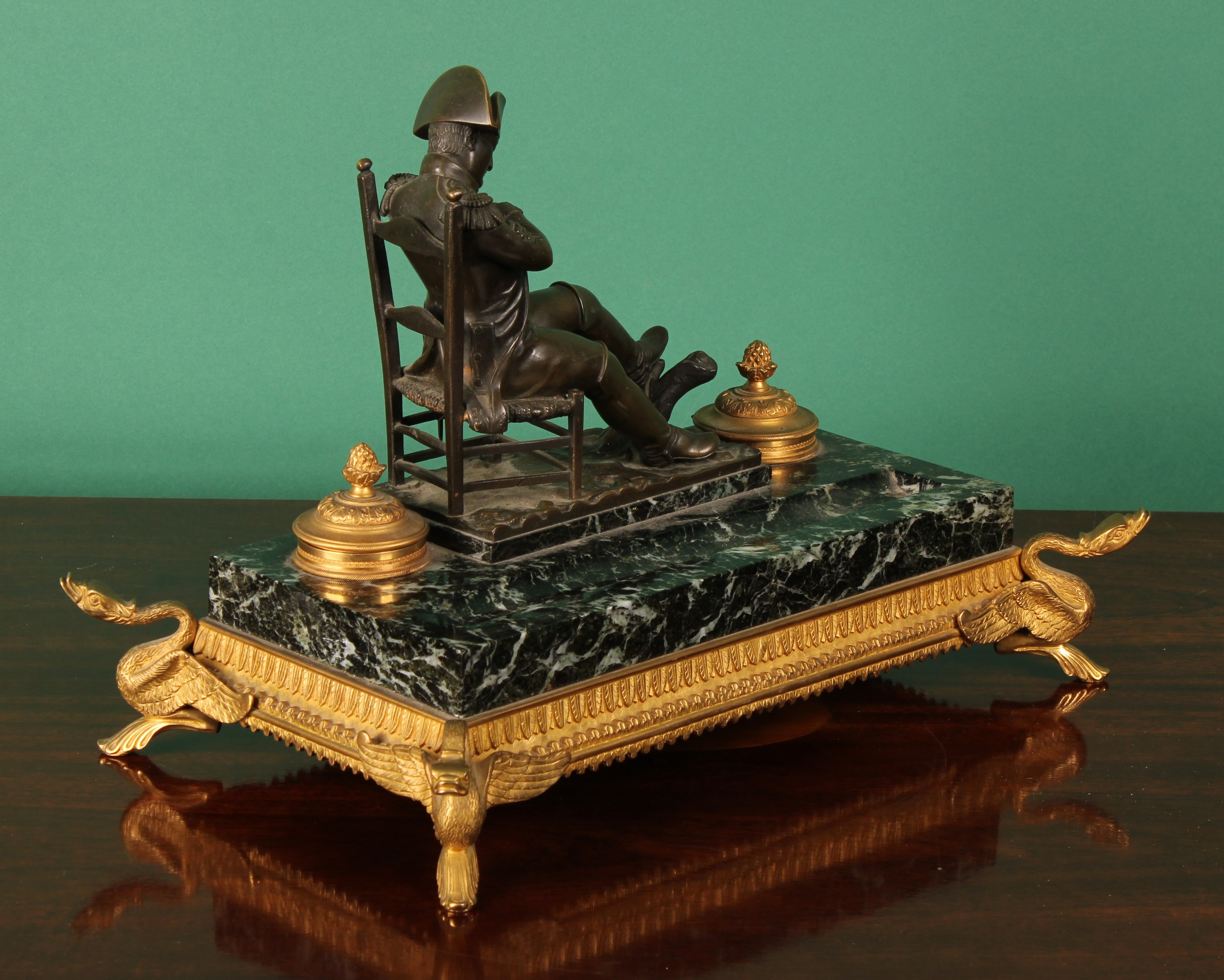 A 19th century French bronze mounted green marble inkstand, in the Empire taste, surmounted by the figure of Napoleon Bonaparte, flanked by a pair of ormolu cylindrical wells, the hinged covers with pineapple finials, pen recess, ormolu skirted base moulded with stiff leaves, the feet cast as swans, 37cm wide,