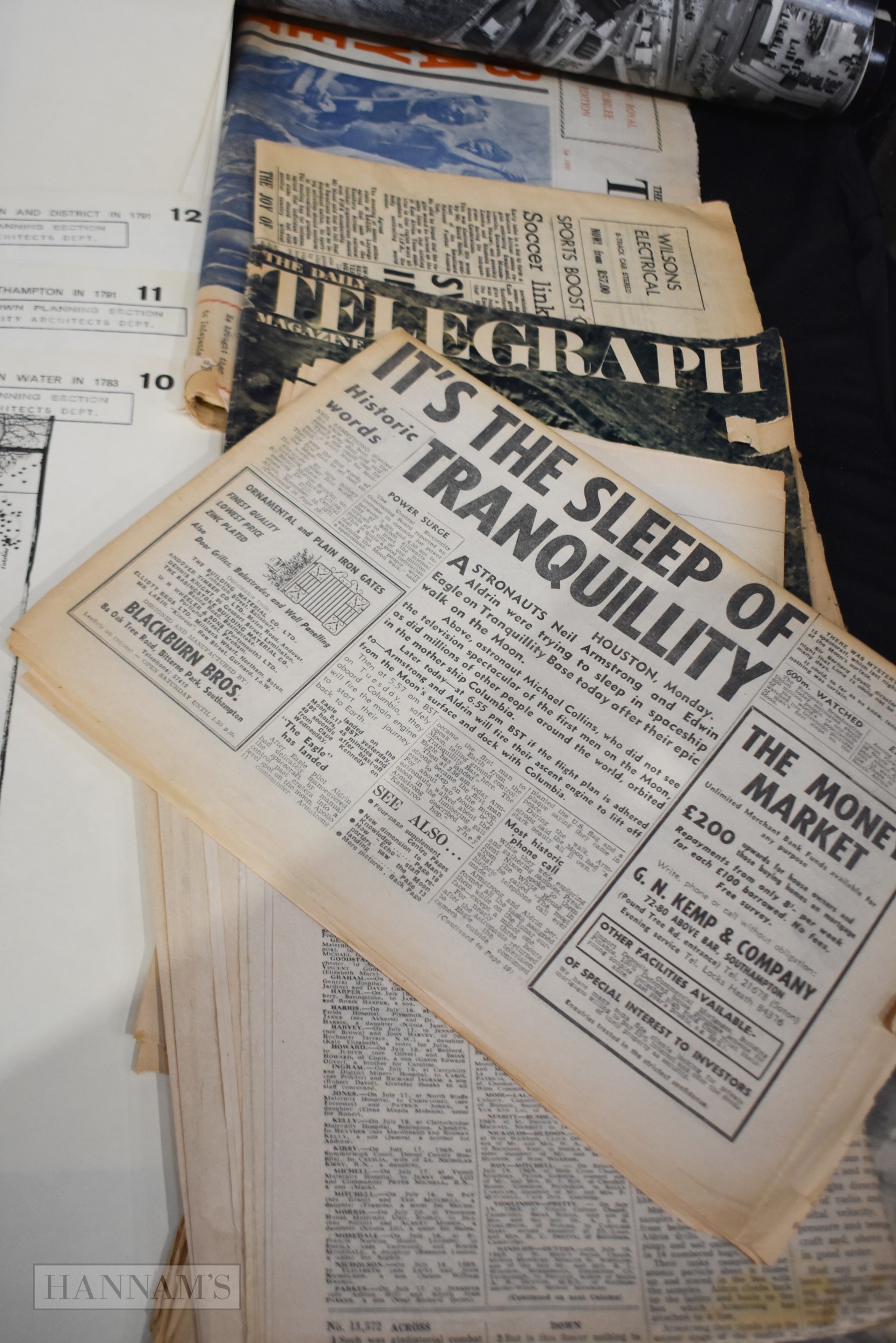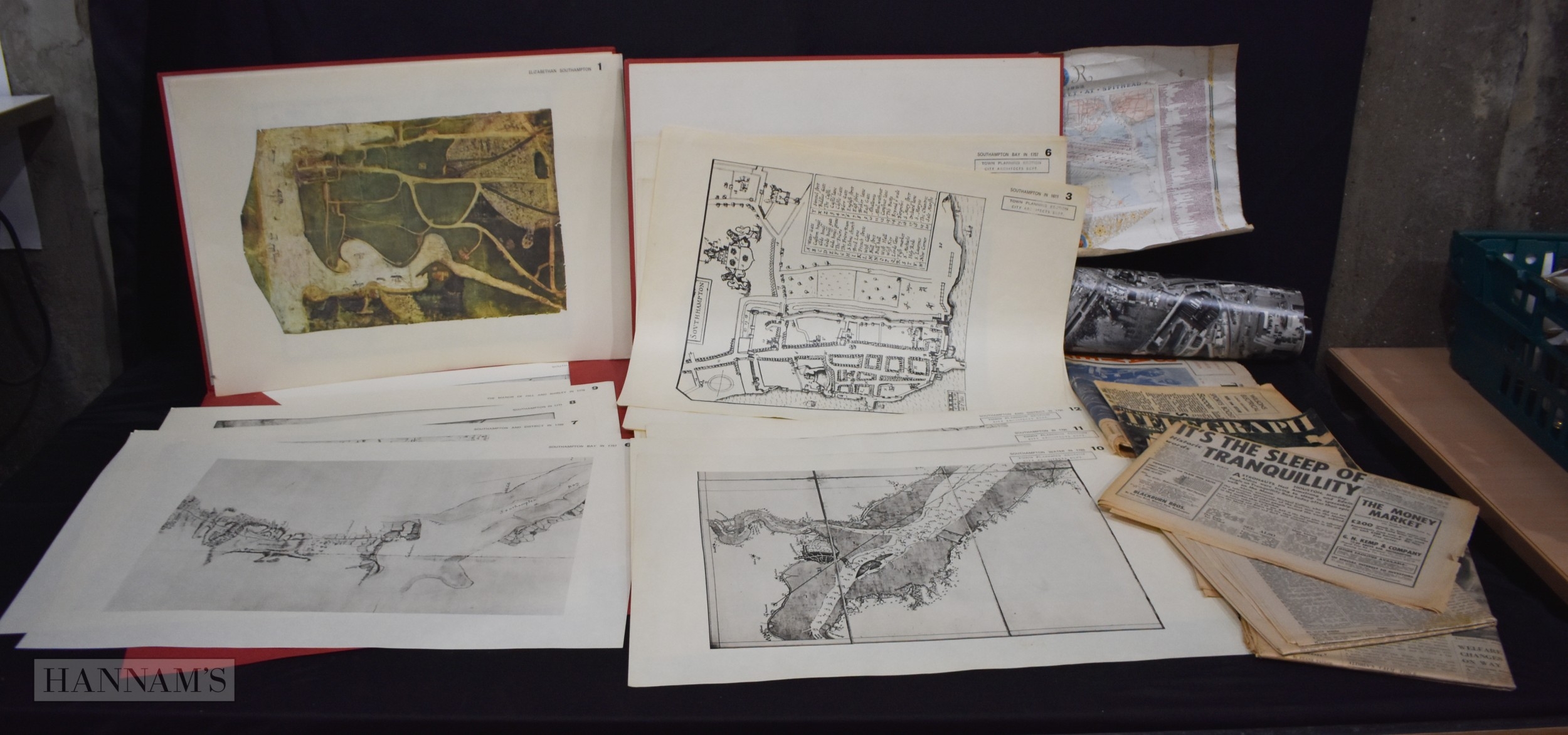 A collection of 1960's newspapers, some relating to the Moon landings, aerial photographs of Southampton , 1953 Fleet review poster and a folio of maps of Southampton (Qty)