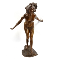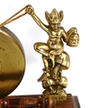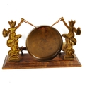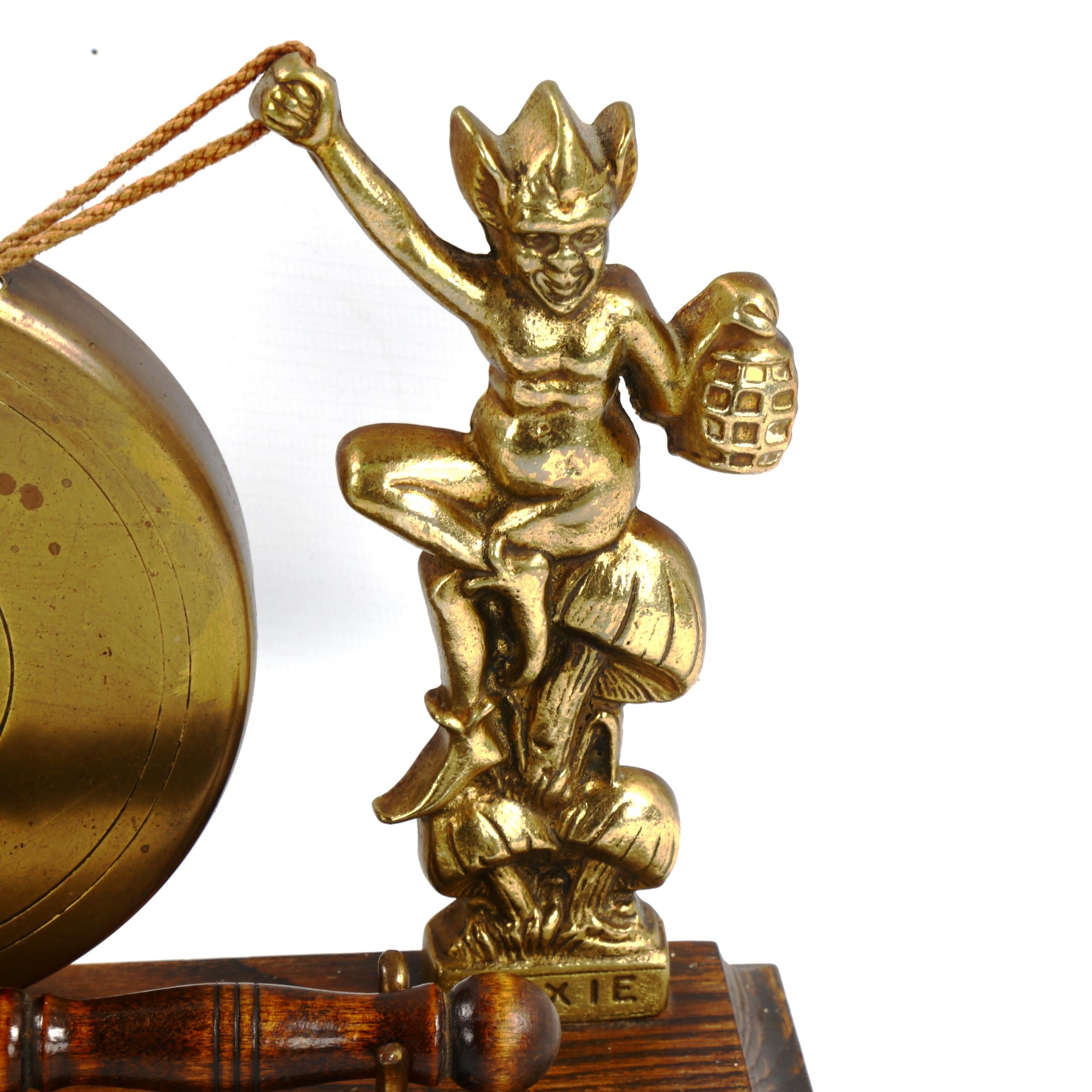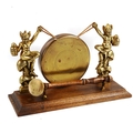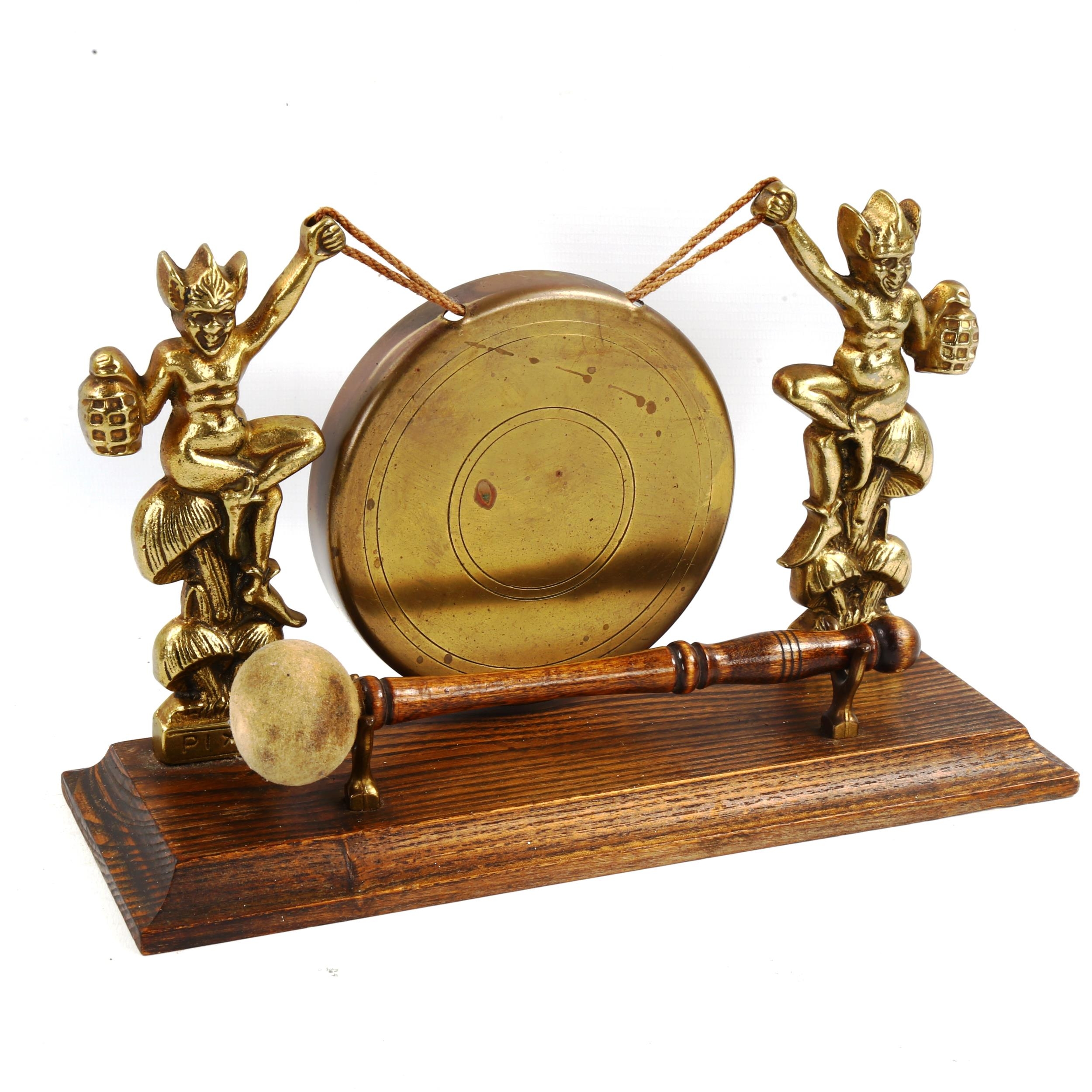 A brass gong supported by imp figures, on oak base, length 28cm