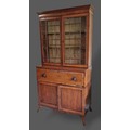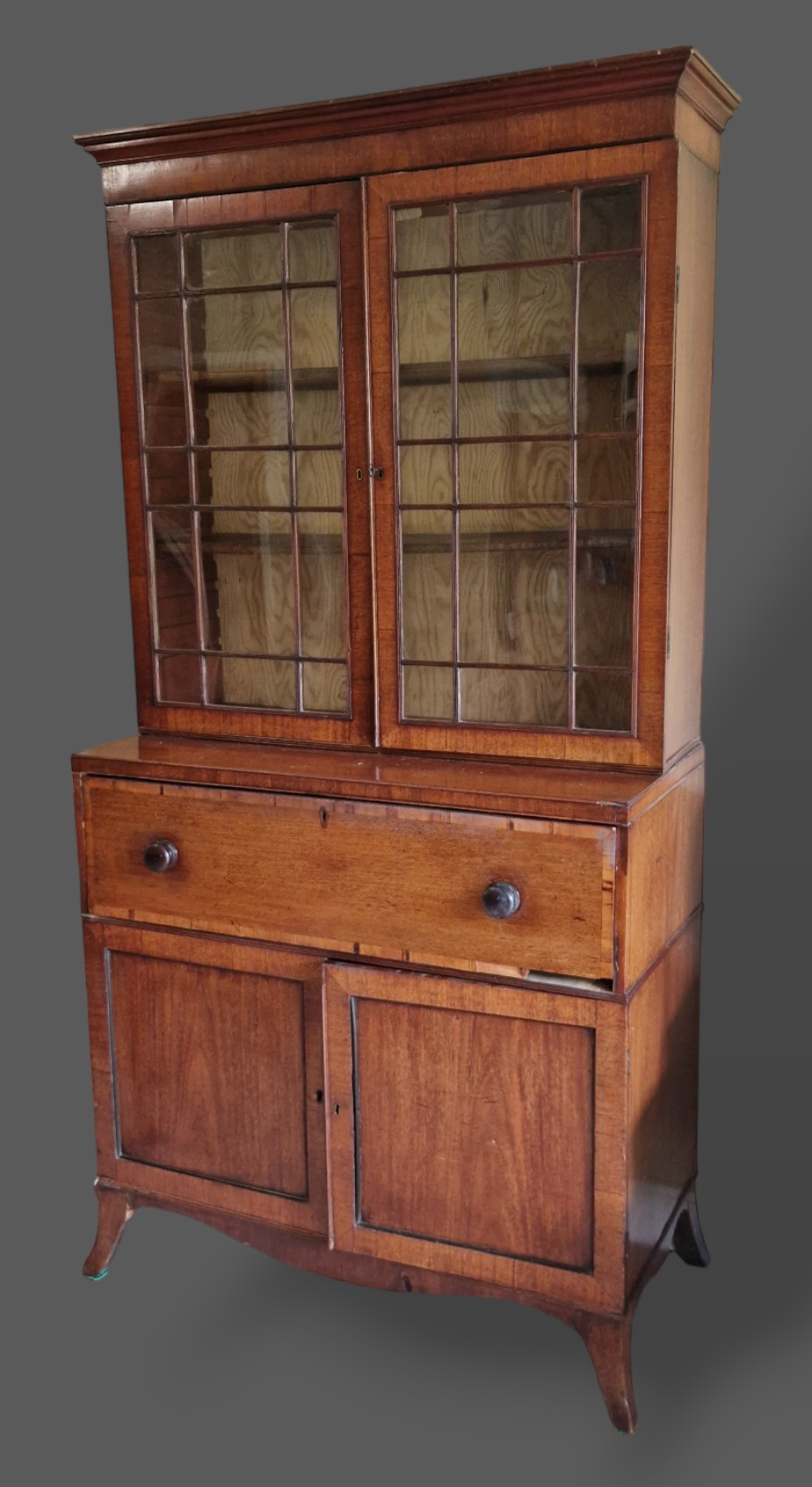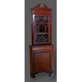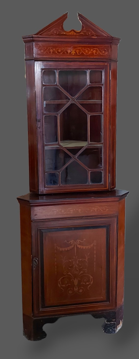 A 19th Century mahogany secretaire bookcase with a moulded cornice above two astragal glazed doors, the lower section with a fitted secretaire drawer above two cupboard doors raised upon out swept legs with shaped apron, 109cms wide, 53cms deep and 215cms tall, together with an Edwardian mahogany marquetry inlaid standing corner cabinet