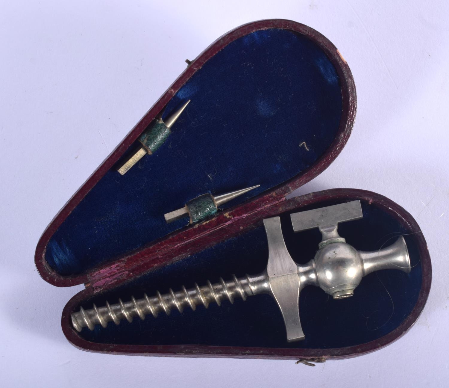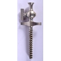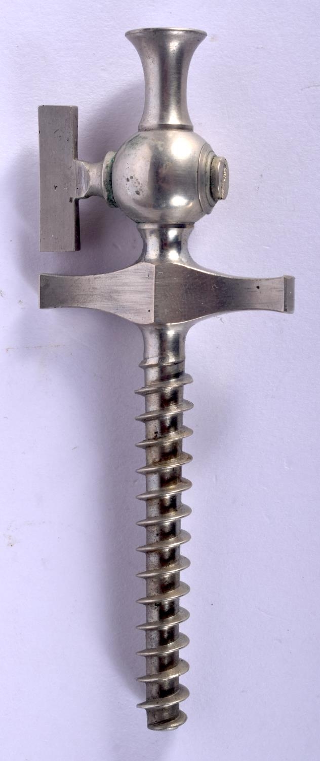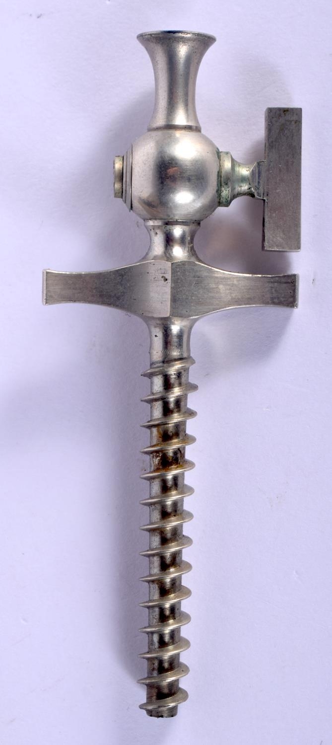 A RARE ANTIQUE EUROPEAN SILVER PLATED CHAMPAGNE CORKSCREW TAP within a leather case. 9.25 cm long.