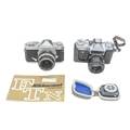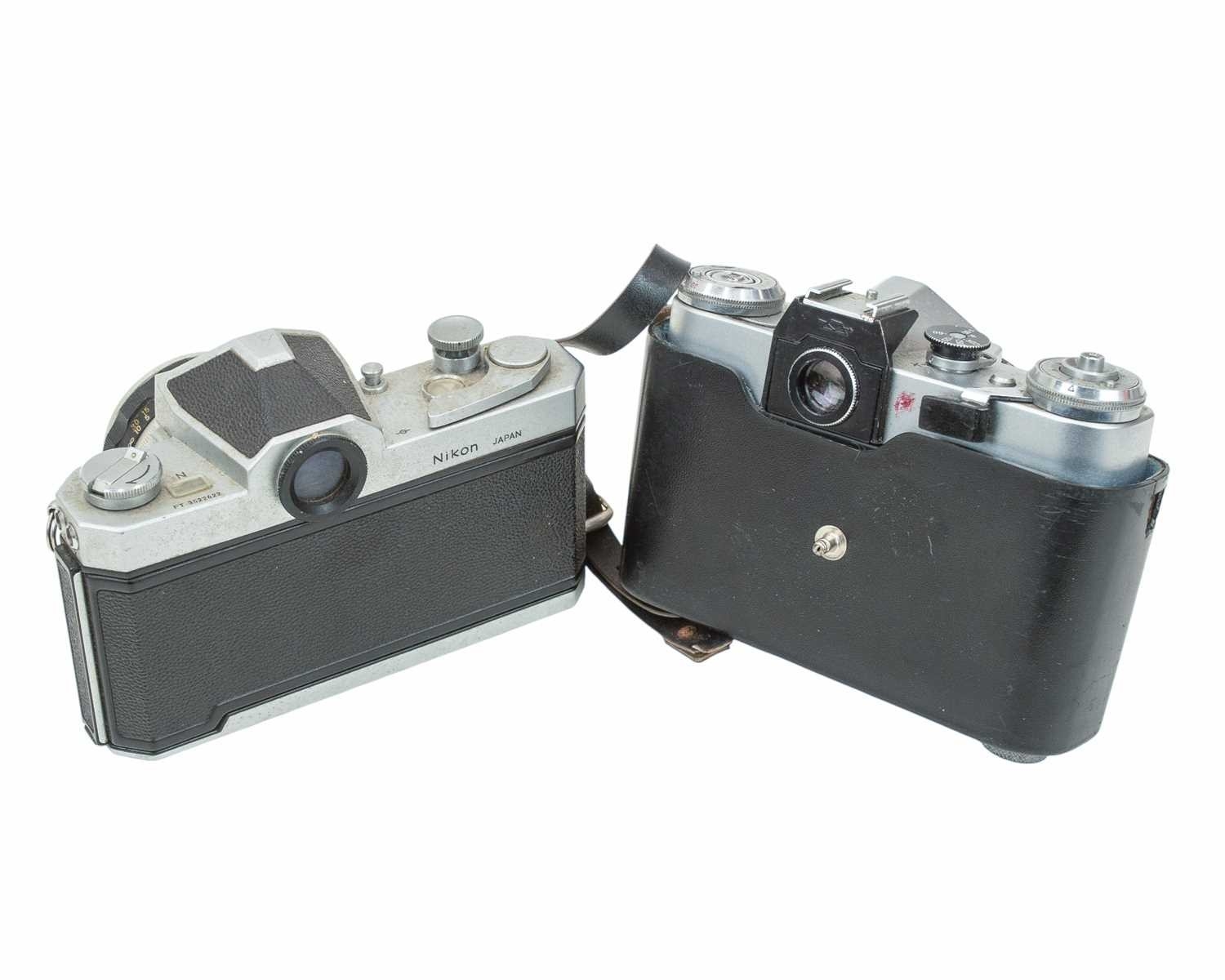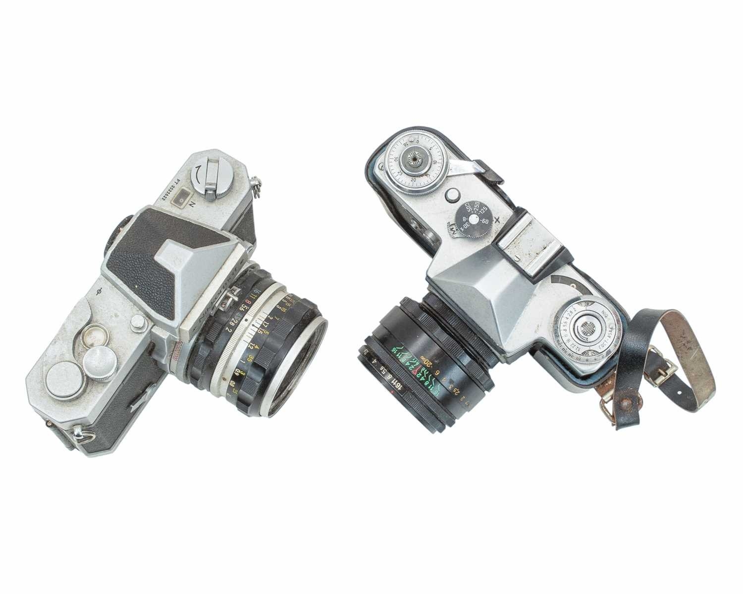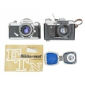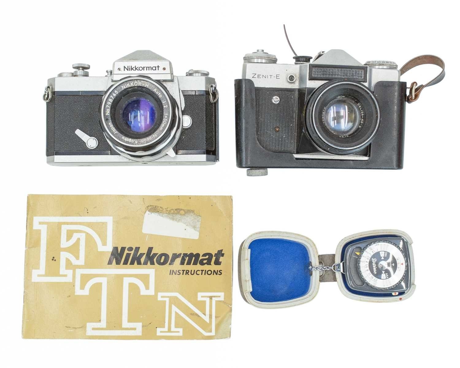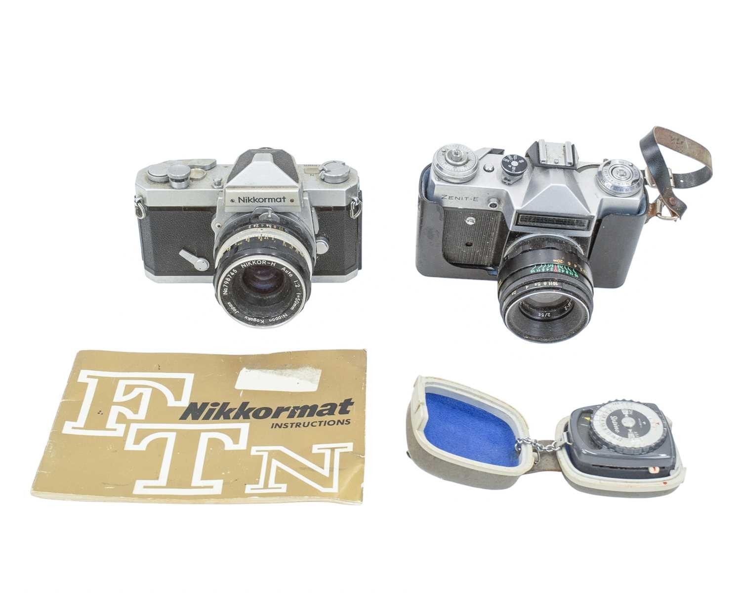 A Nikon FTN Nikkormat SLR camera. Serial number FT 3522622, with a Nikkor-H 1:2 f=50mm lens, together with a Zenit-E camera.