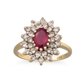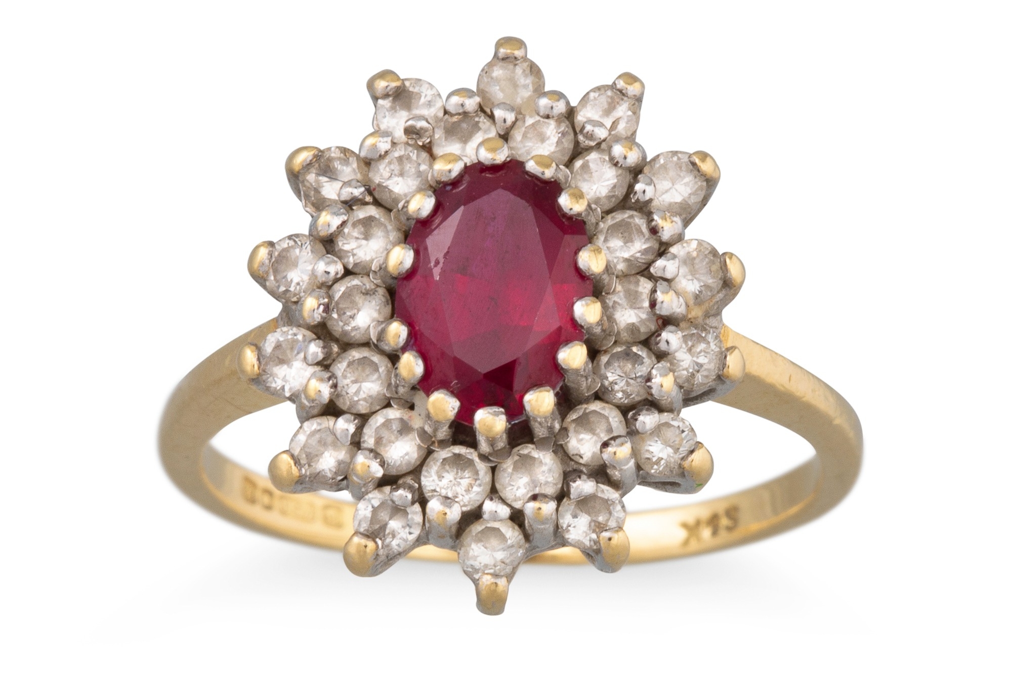A GEM SET DIAMOND CLUSTER RING, the oval gem set to diamond surround, mounted in 18ct yellow gold, size K