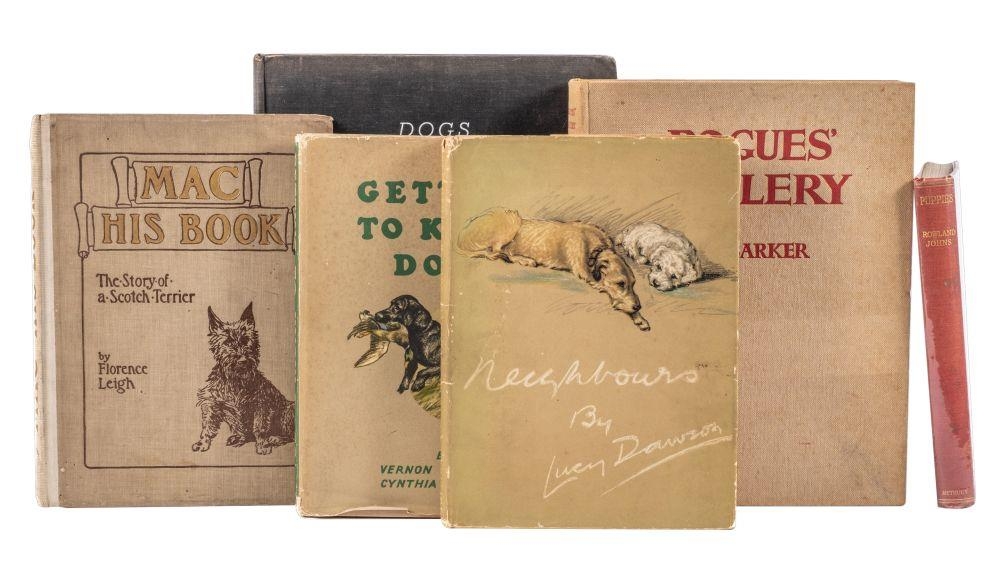 DAWSON, Lucy : (illustrator) Neighbours. 12 illustrations on tinted paper. Org. cloth in chipped d/w. Collins, first edition,1946. With - Dogs Rough and Smooth. 16 colour plates on tinted paper. lg. 4to. Collins. First. 1937. With - Leigh, Florence. Mac His Book. The Story of a Scotch Terrier. Attractive pictorial boards. Inscription on front endpaper. Printed on tinted paper. 4to. Dow & Lester. n.d. With - Barker, K. F, Rogues' Gallery. illustrated in black and white throughout. org. buckram cloth, tall 4to, Heinemann, first ed. 1939. With two other dog books. (6)
