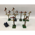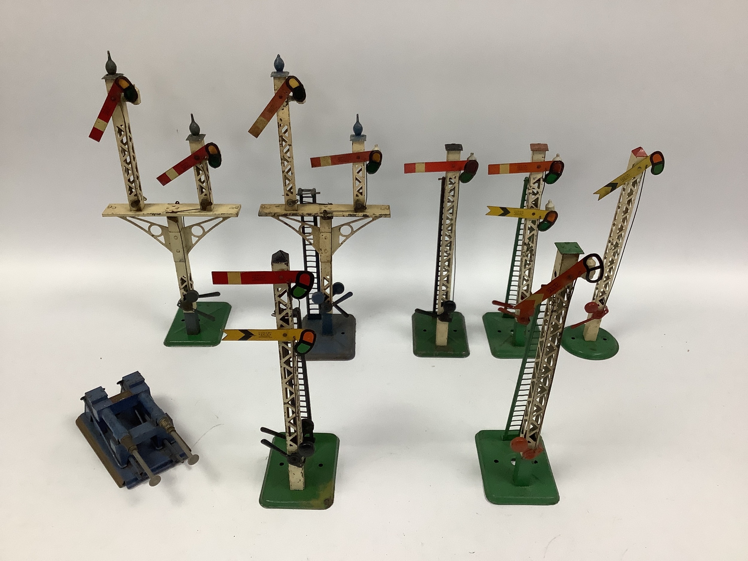 Seven Pre-War Hornby 'O' Gauge Signals, including two No 2, plus a set of spring buffers, all playworn.