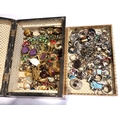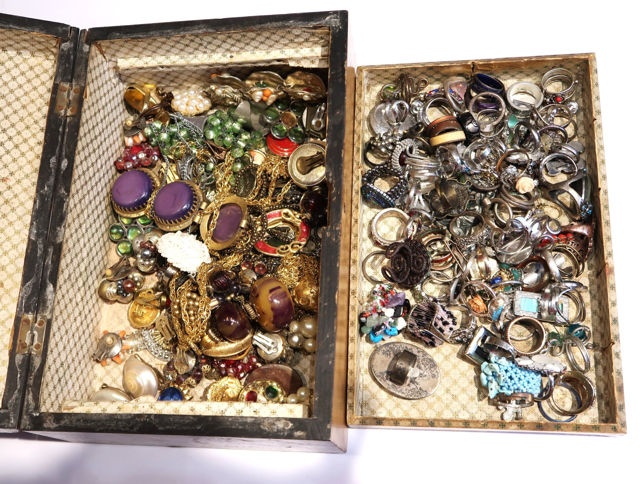 Walnut dome top jewellery box containing a quantity of various costume jewellery including rings etc