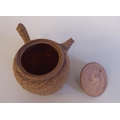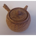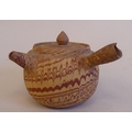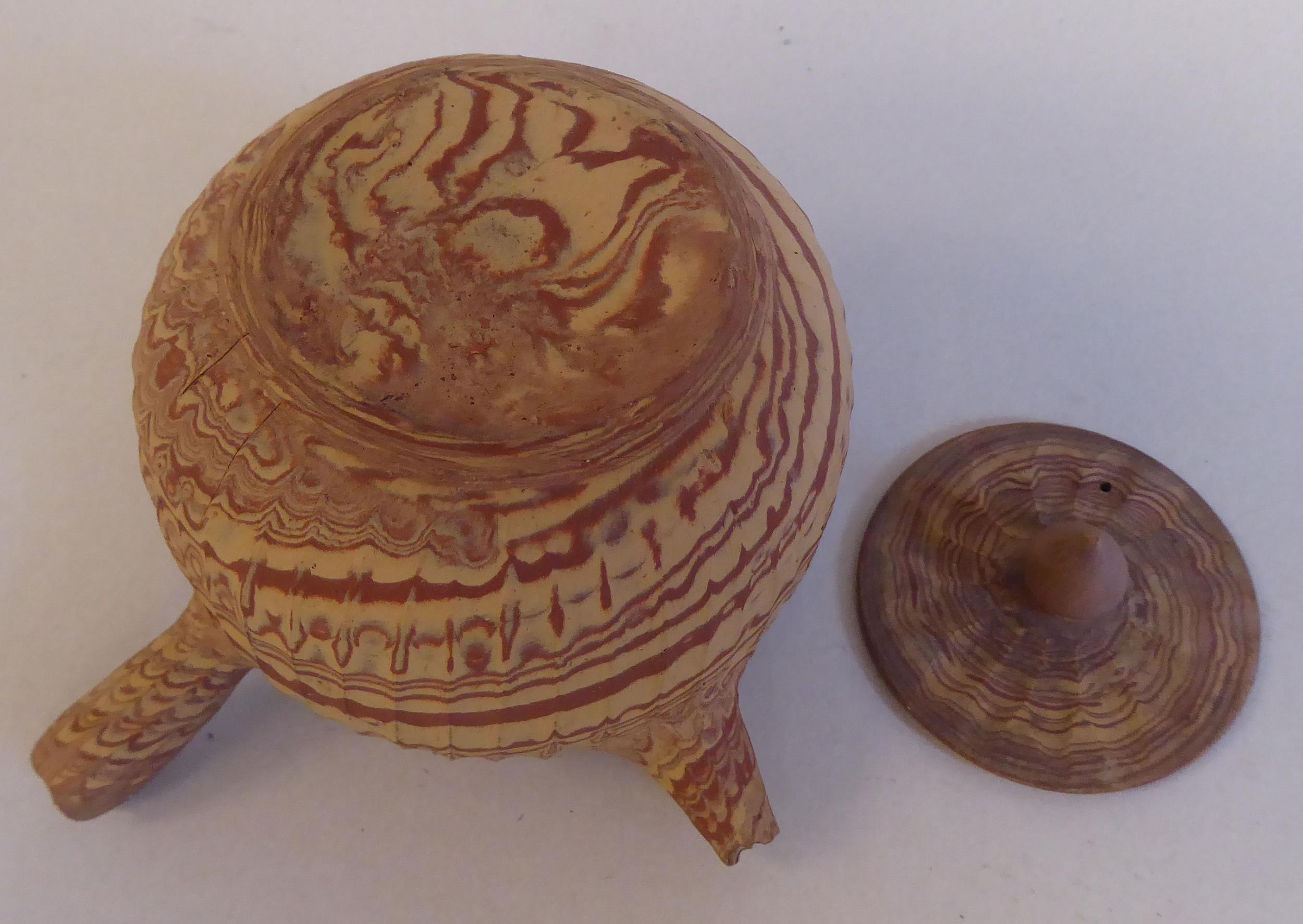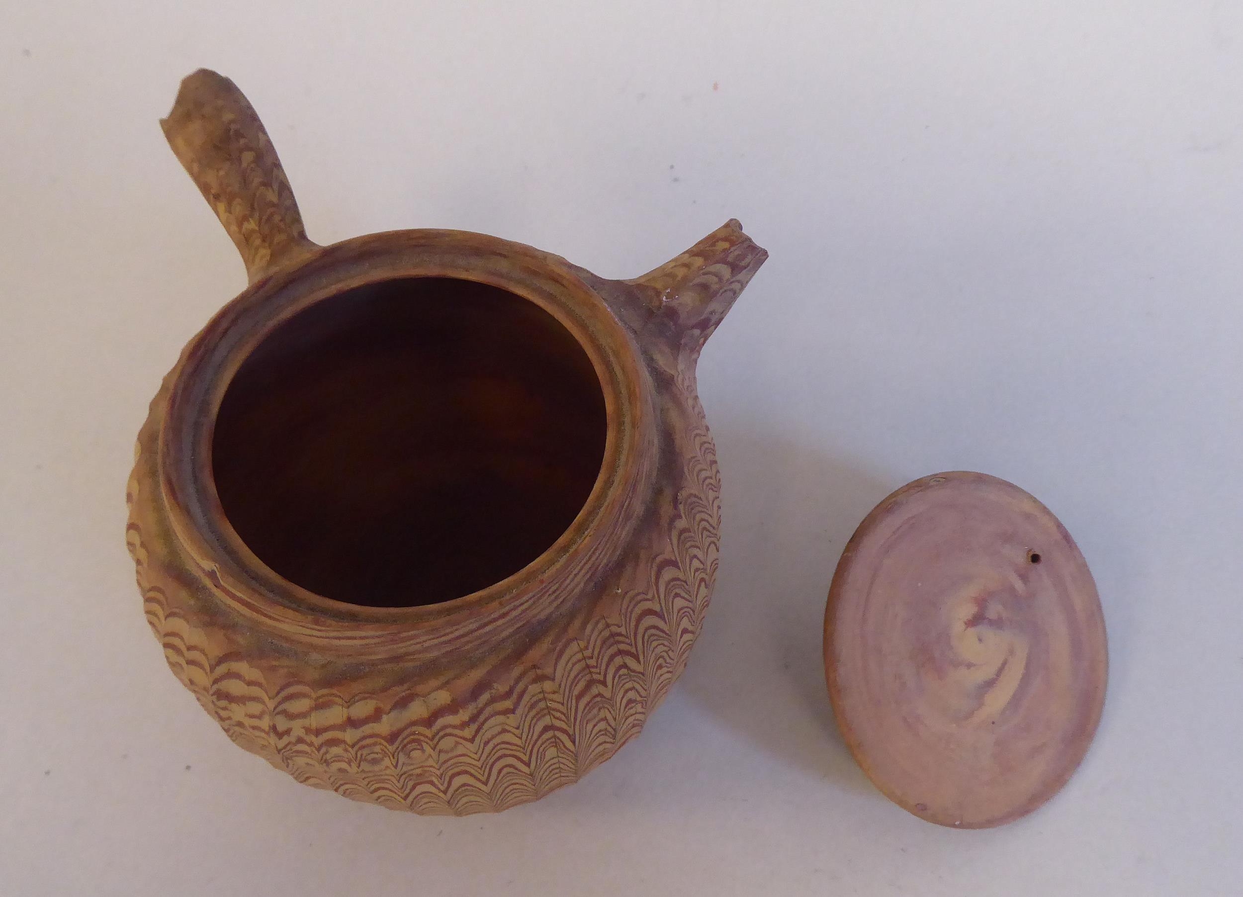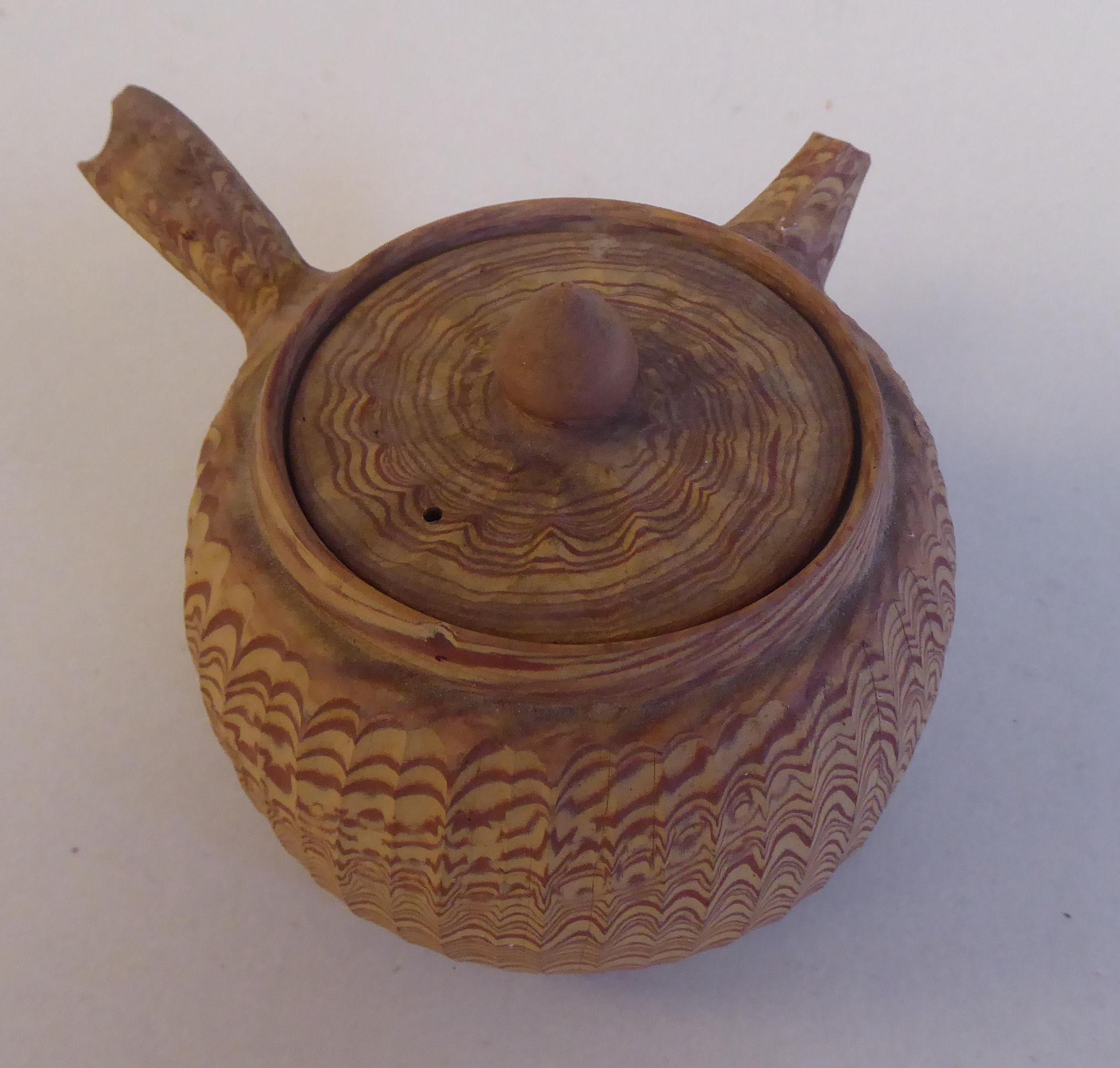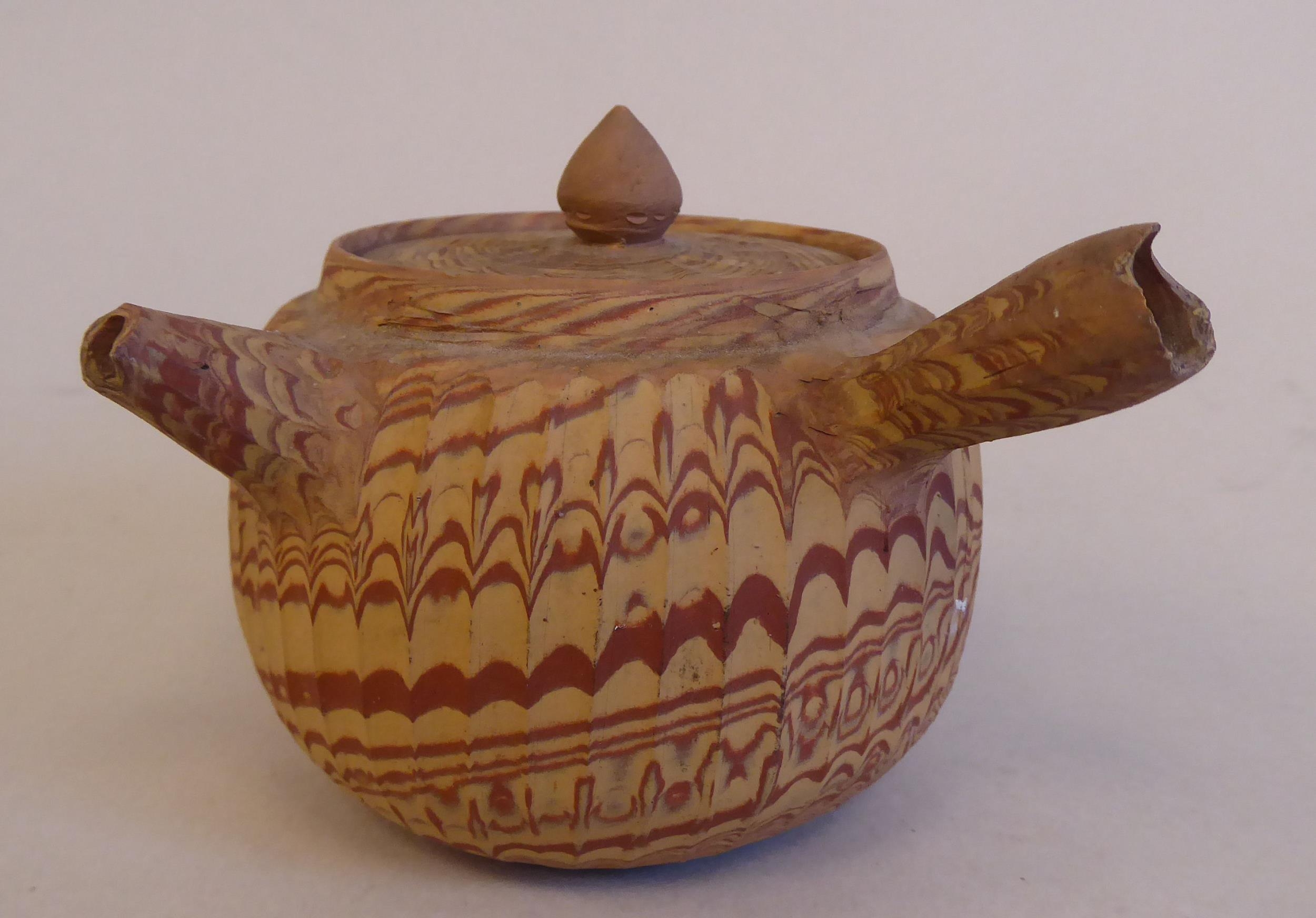 An antique Japanese agate ware Saki pot of bulbous form with a short spout, side handle and cover