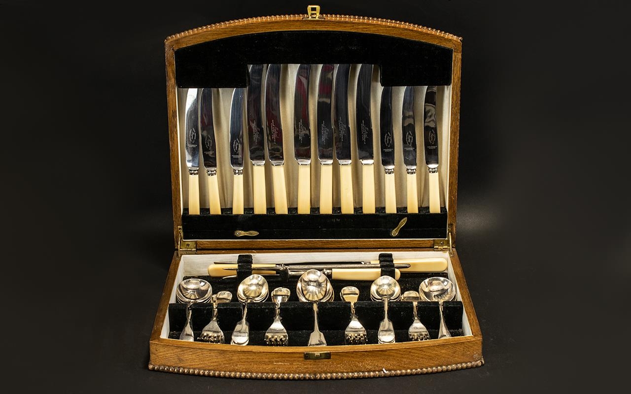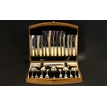 Oak Boxed Canteen Of Cutlery Hinged box with beaded border, lined to interior in black velvet, containing a full set of knives, forks, spoons, soup spoons.