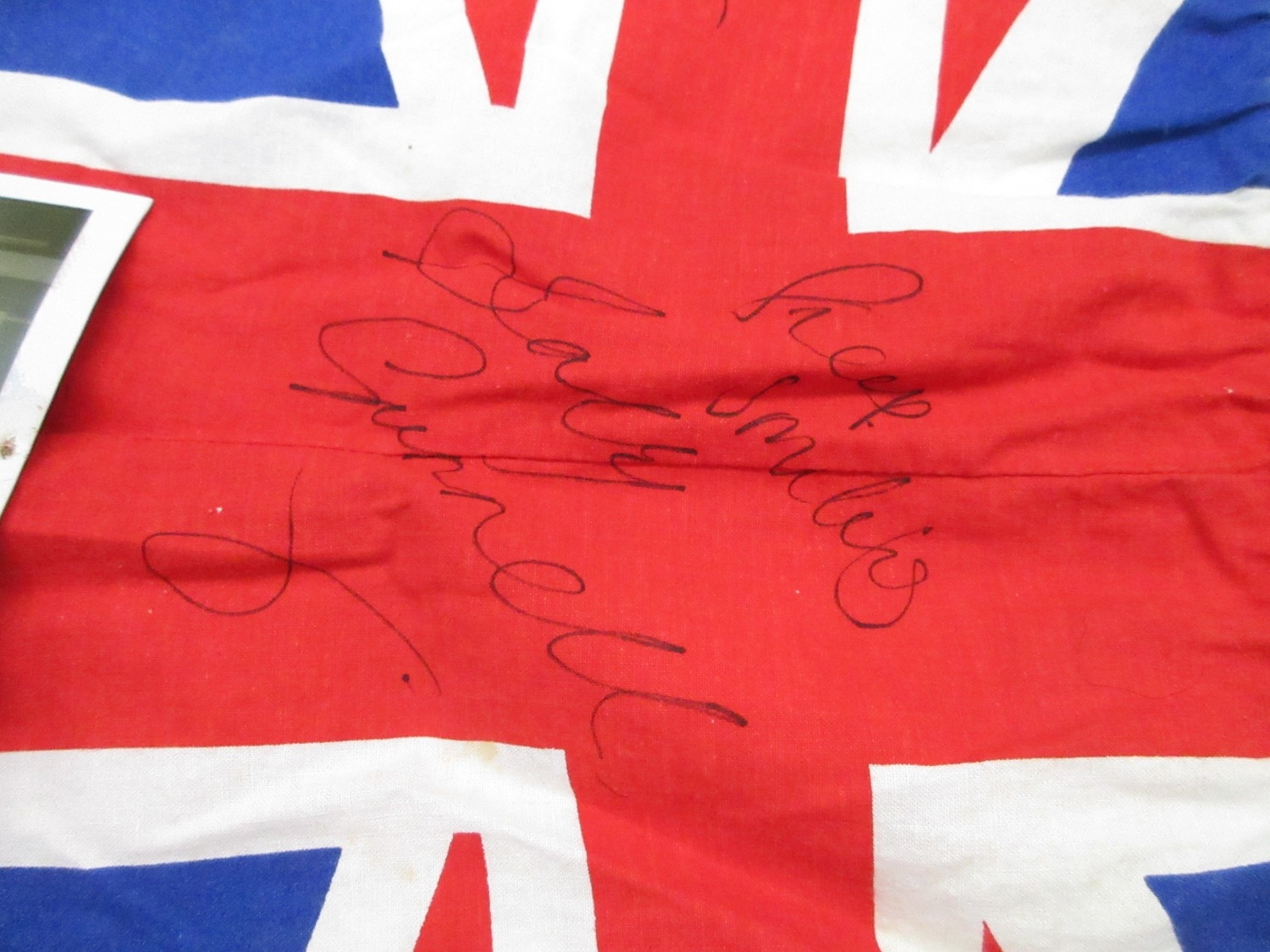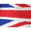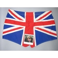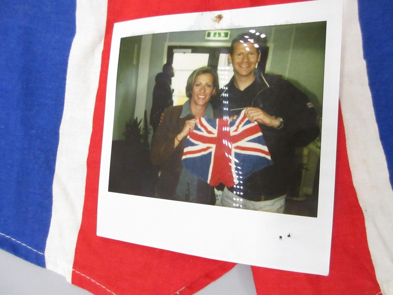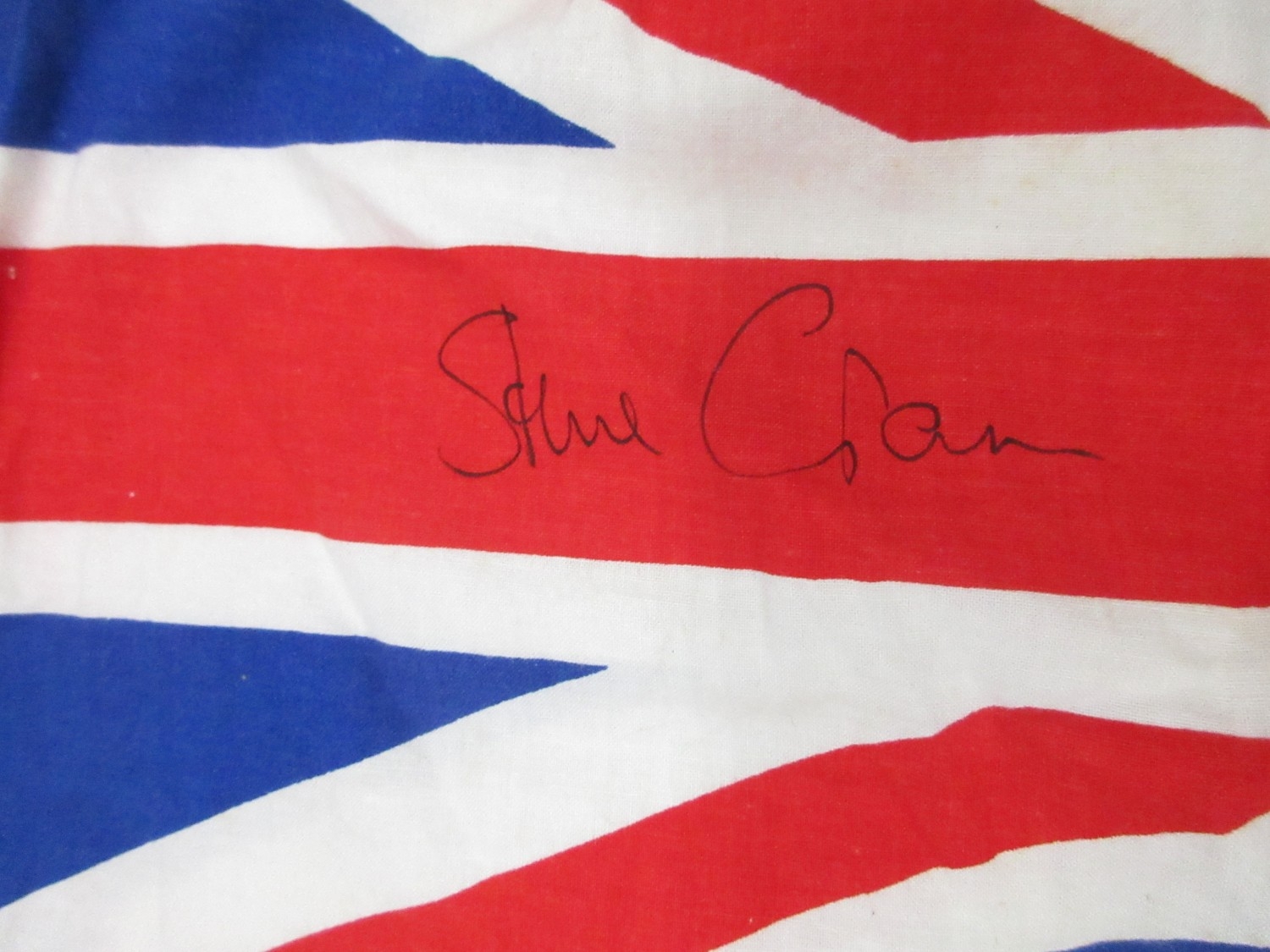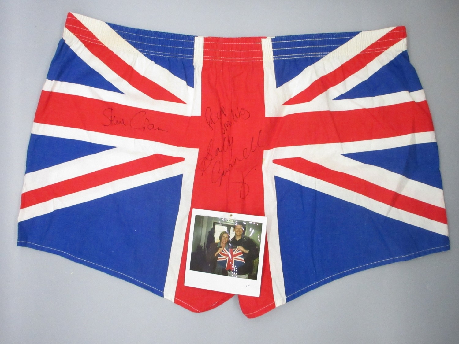 The Ricky Groves Collection - Signed Steve Cram and Sally Gunnell Union Jack shorts with photograph showing said Olympians with Shorts
