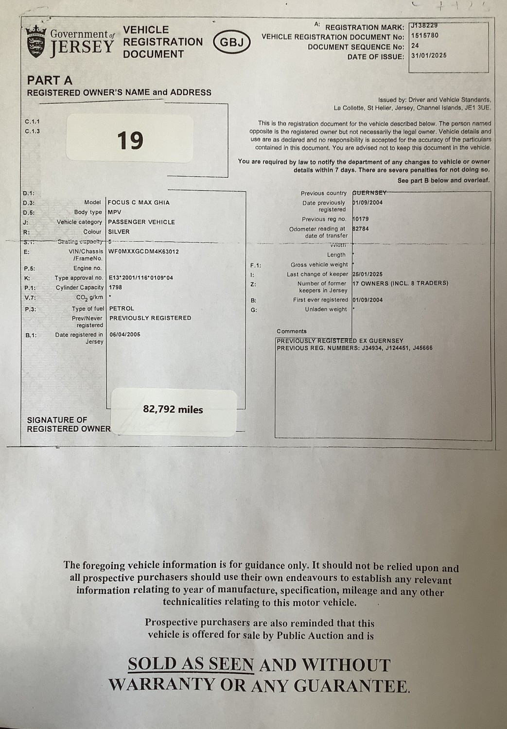 A 2004 Ford Focus C-Max Ghia 1.8 MPV J138229 (petrol/manual), odometer reading 82,792 miles