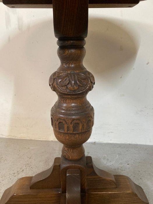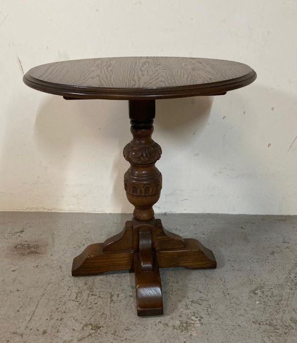 An oak side table on carved central support (H59cm Dia56cm)