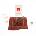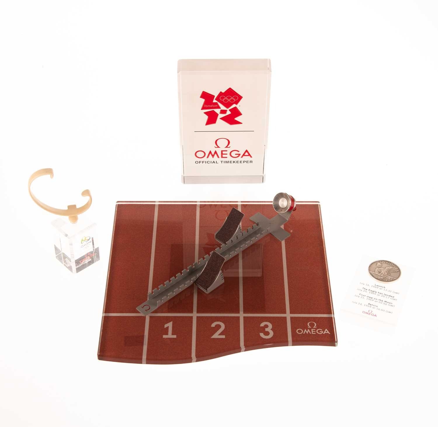 comprising an Olympic Games starting block display stand with a London 2012 plaque, a Rio 2016 Omega watch single stand and an Apollo 11 Moon Landing plaque. (5)