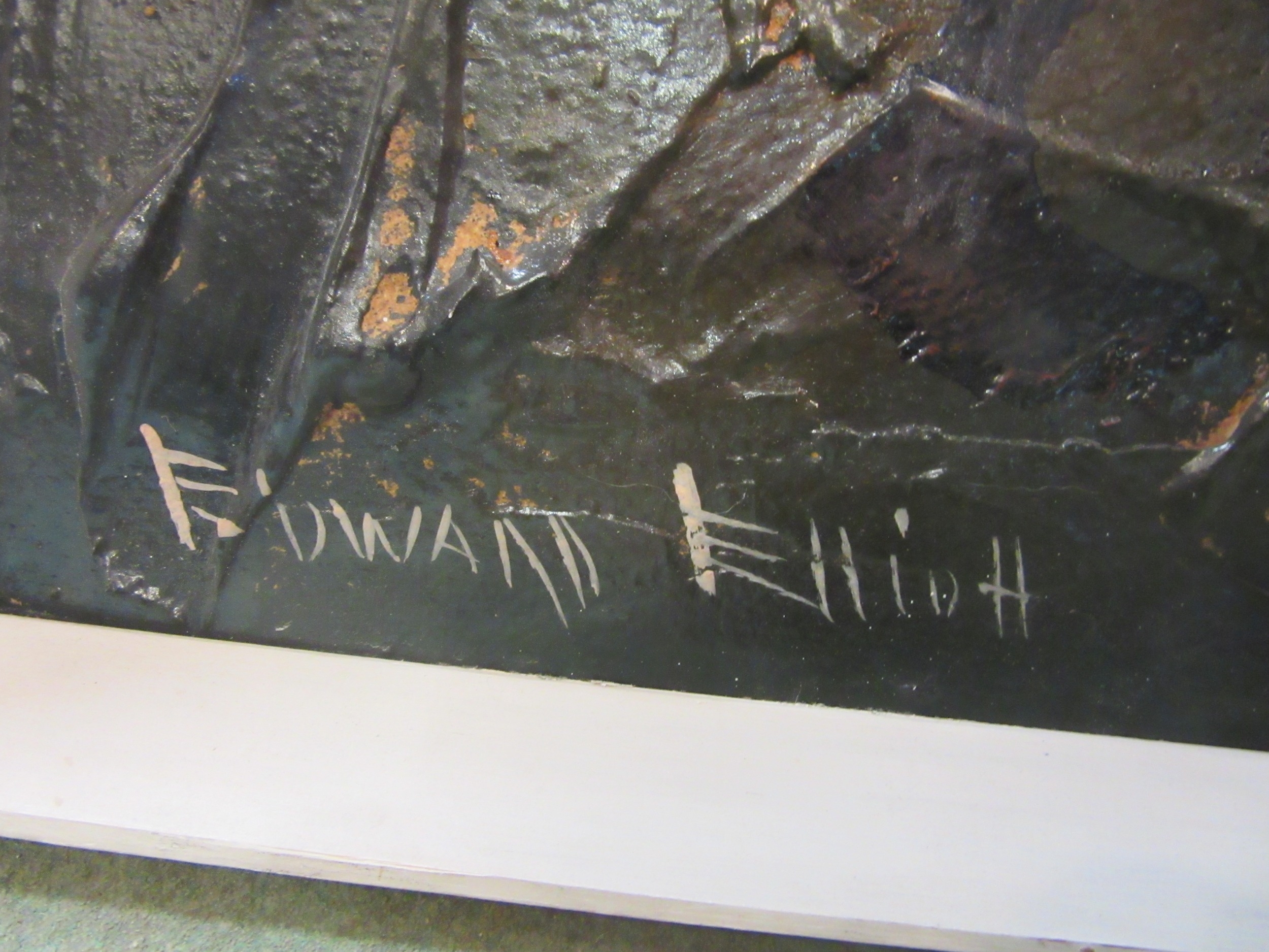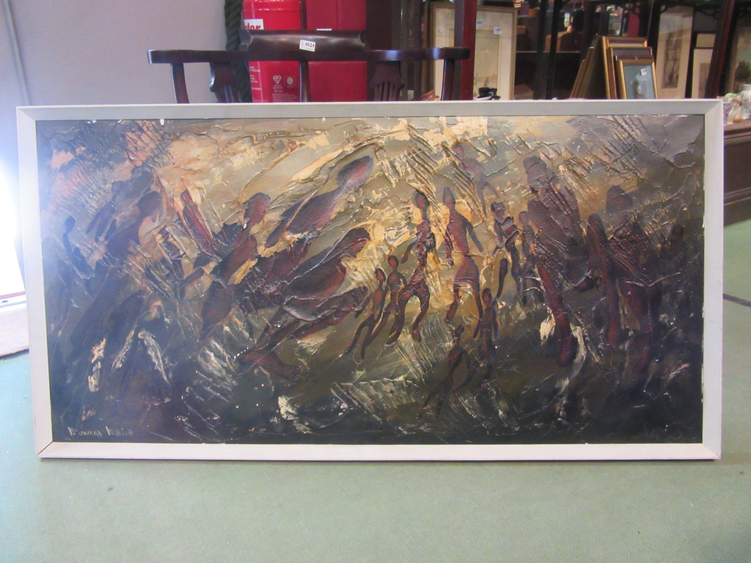 EDWARD ELLIOTT: A large palette knife oil on board depicting abstract African figural scene, signed lower left, framed, 59cm x 120cm image size