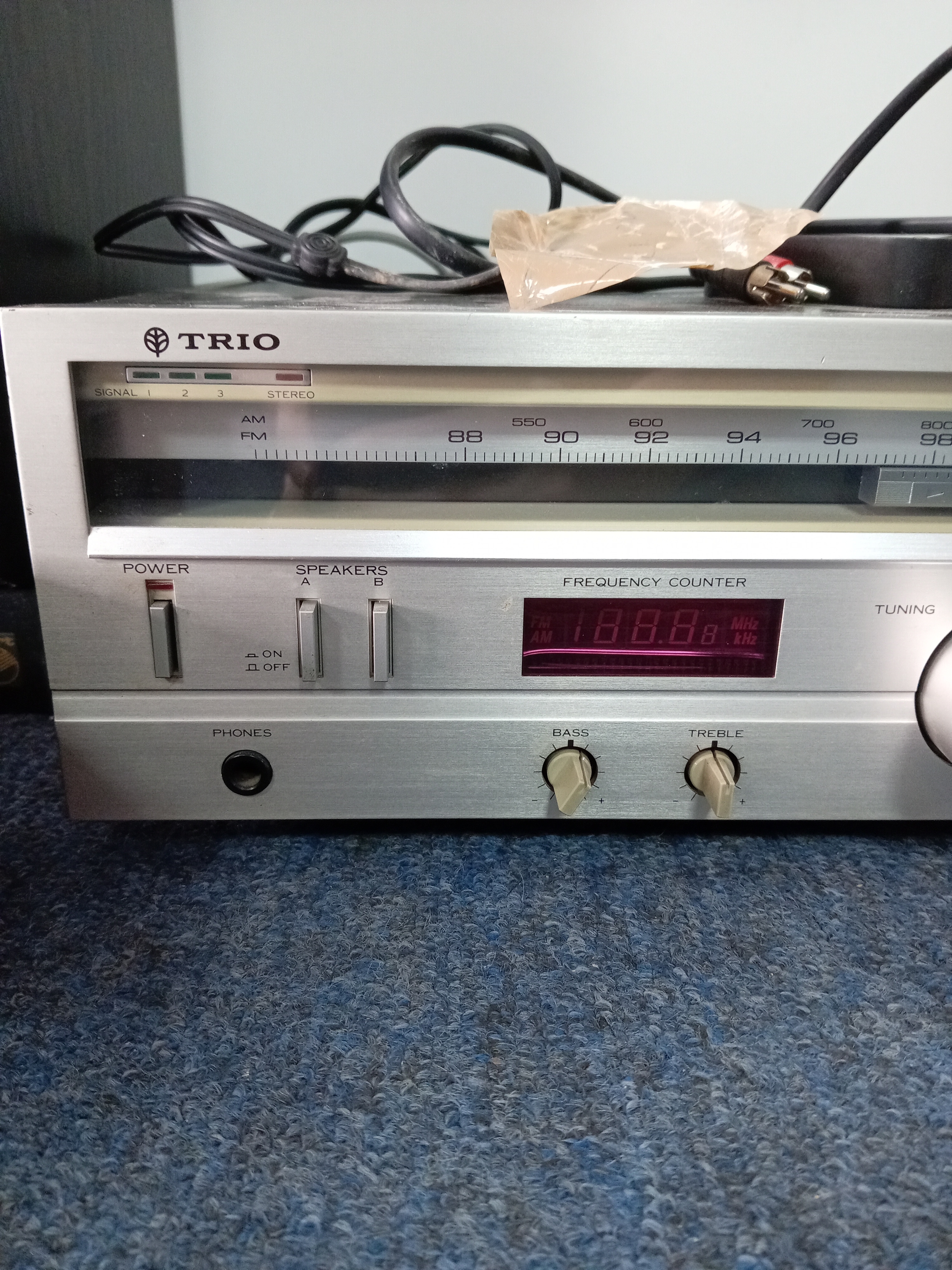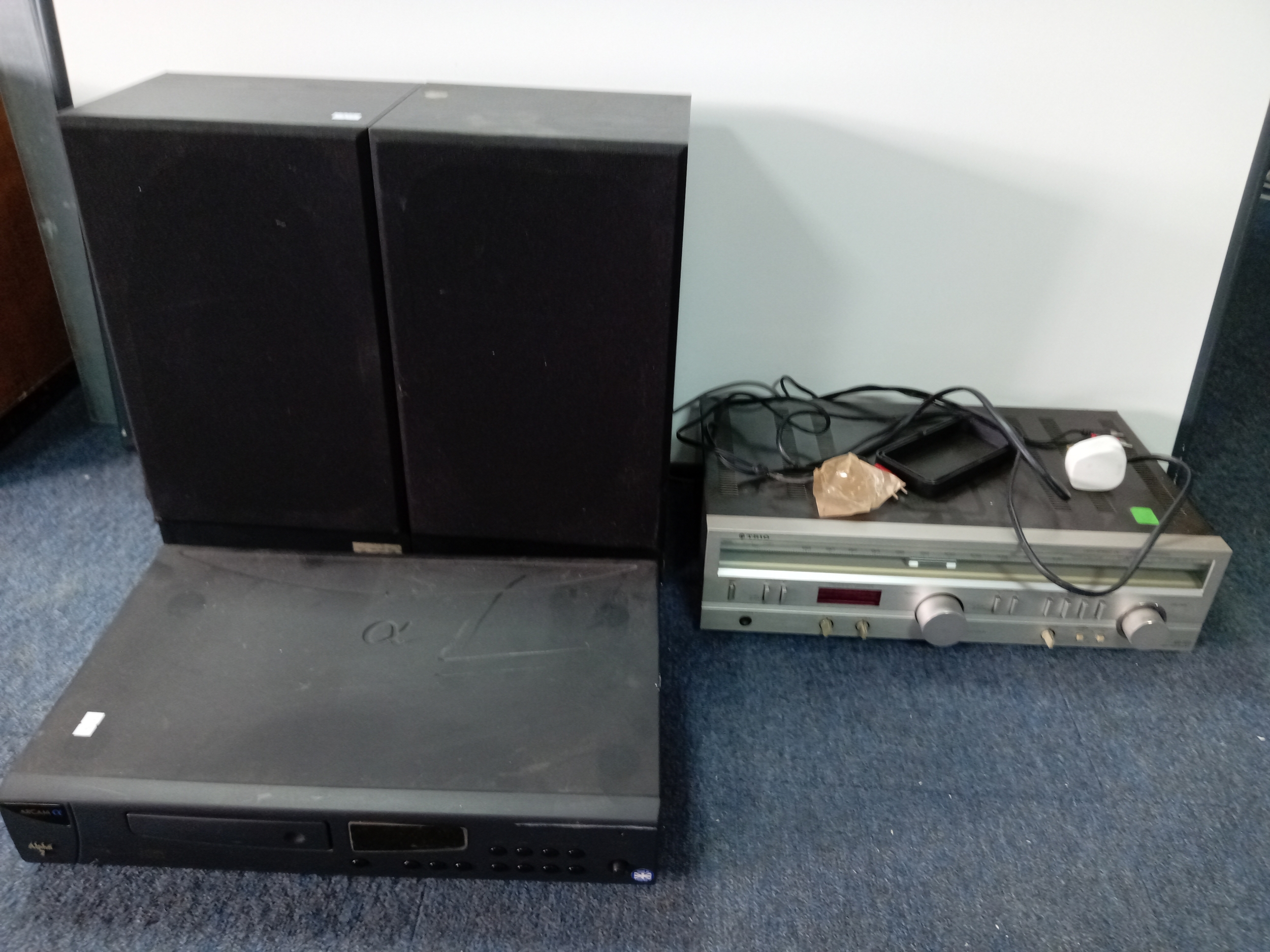 A Trio KR-720 stereo receiver. A mordaunt-short pair of speakers and an air cam alpha 7 CD player.