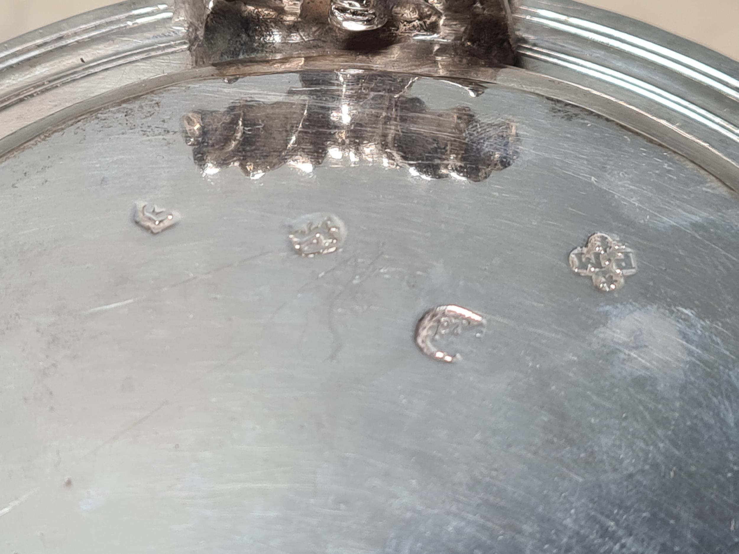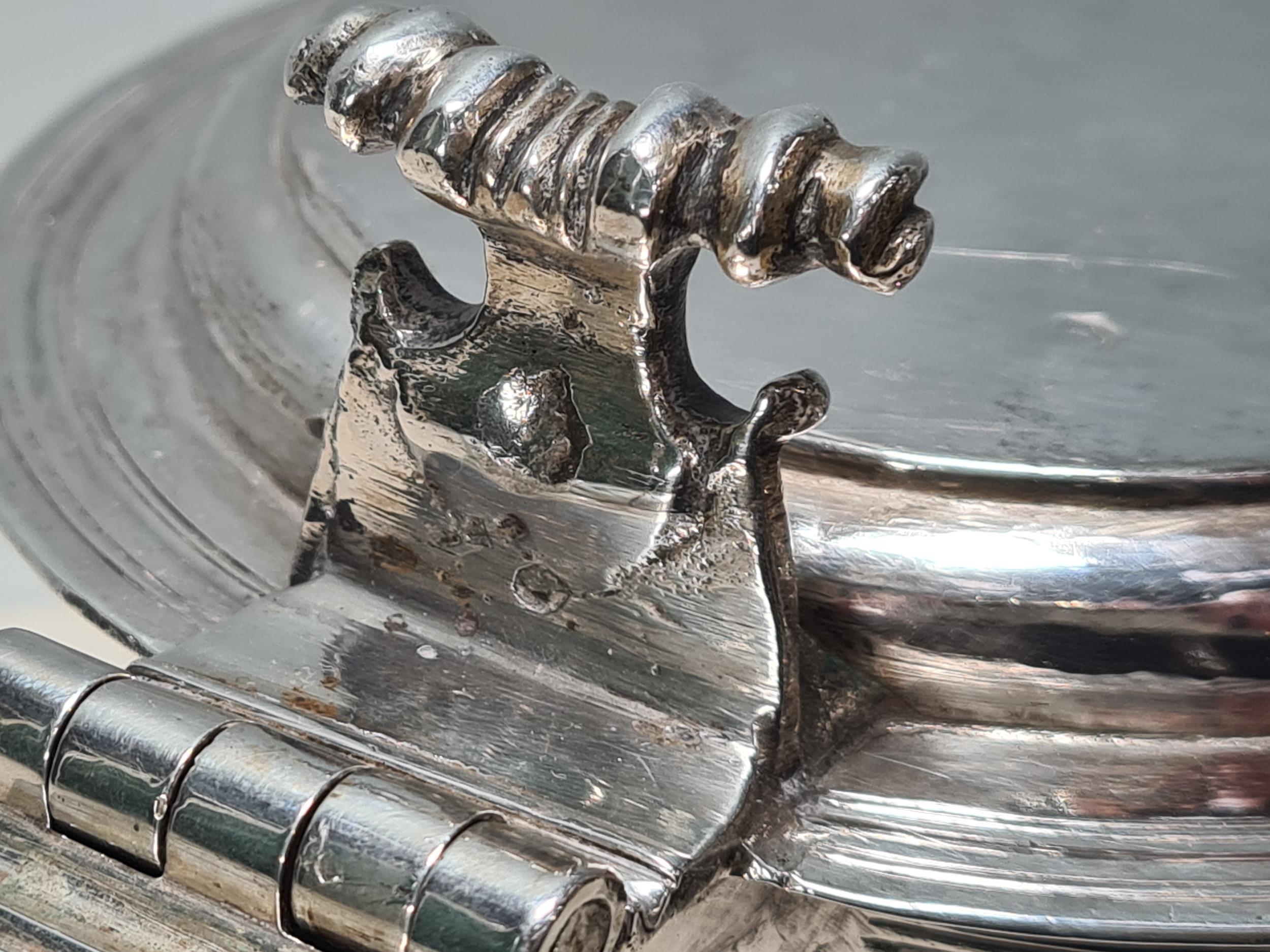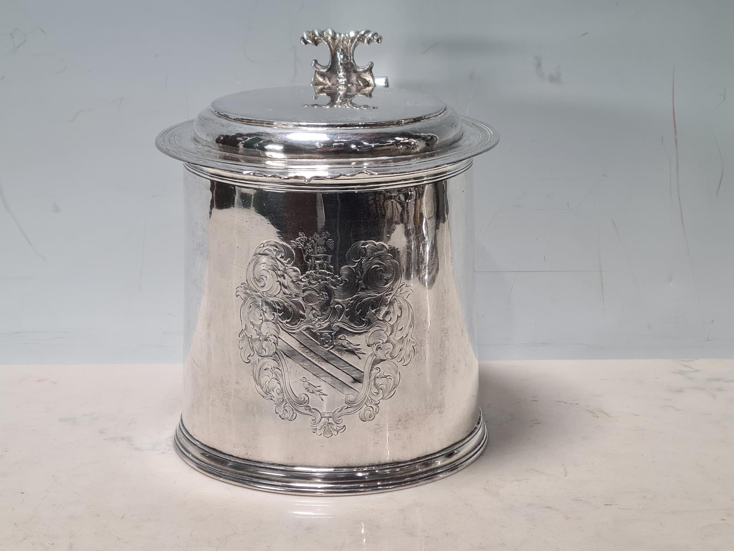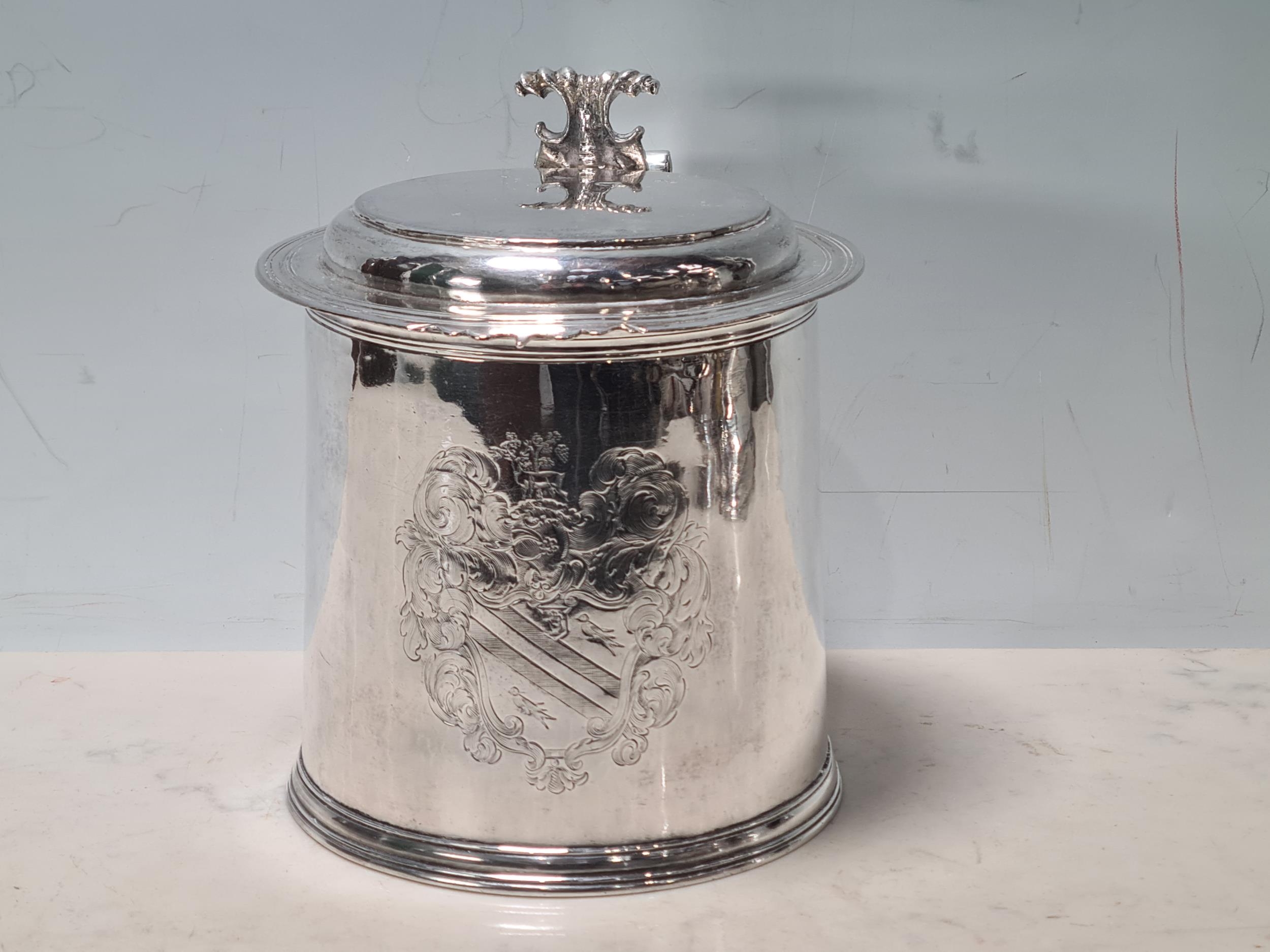 A Charles II silver lidded Tankard with scroll thumb piece, flat section lid, engraved large armorial cartouche, London 1681, maker's mark P . M between two stars, 6 3/4in high, 900gms