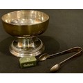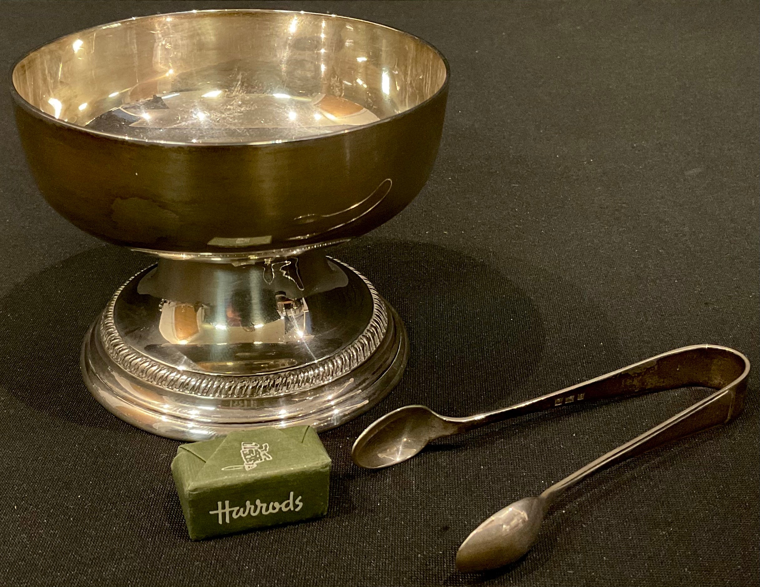 A George V silver pedestal sugar bowl, outswept gadrooned stepped base, 9.5cm diameter, 7cm high, Sheffield 1926, 195g; a pair of silver sugar bows, Birmingham, marks rubbed, 17g (2)