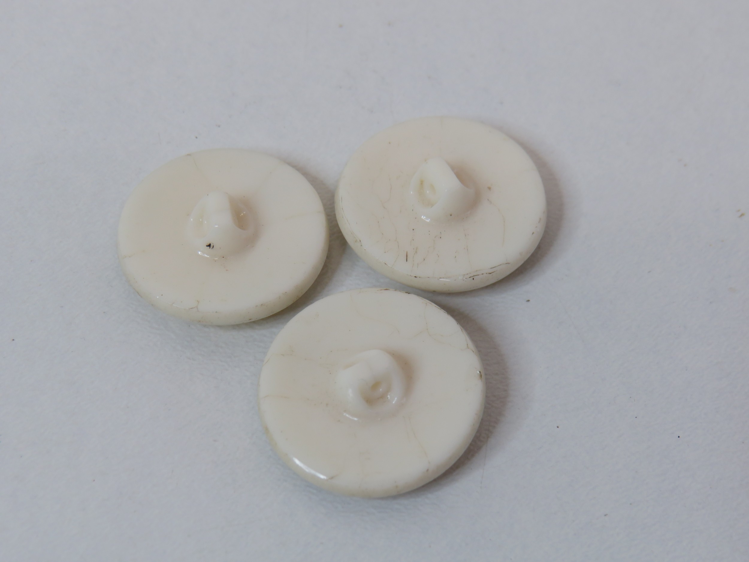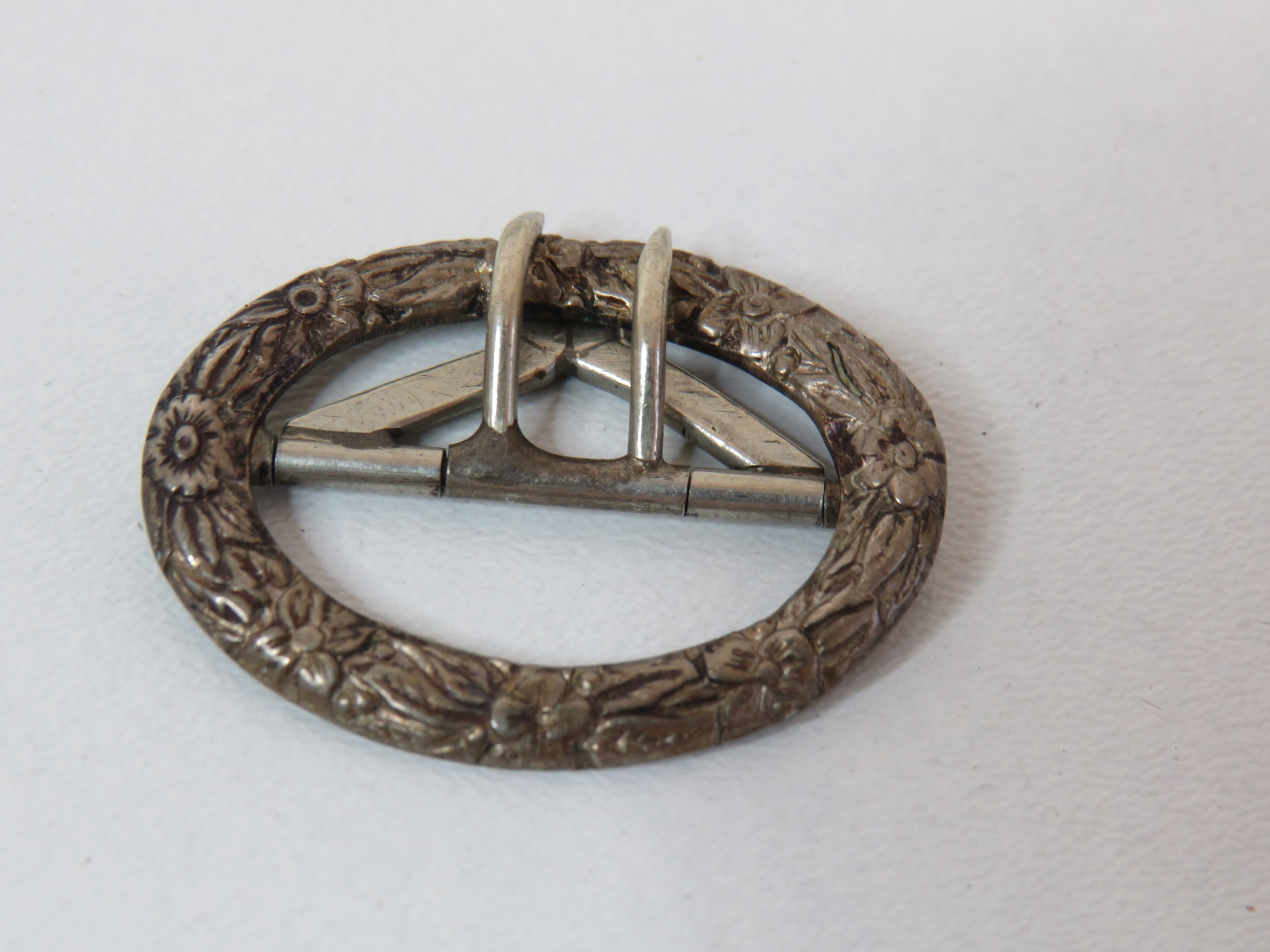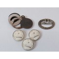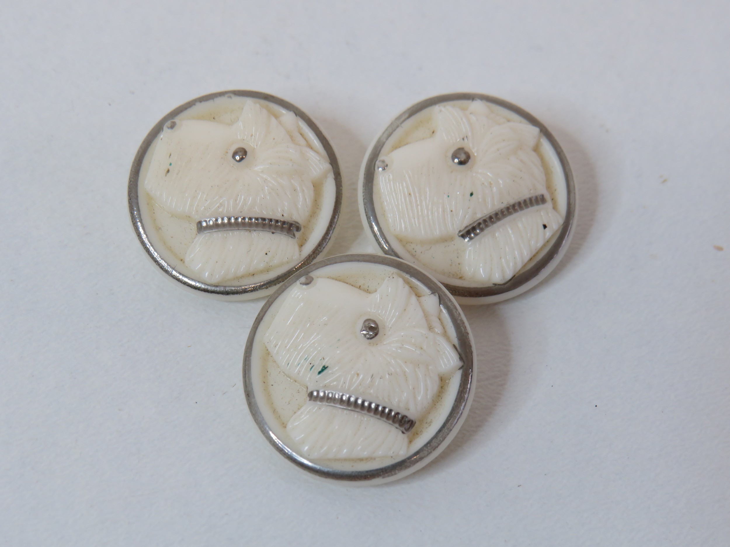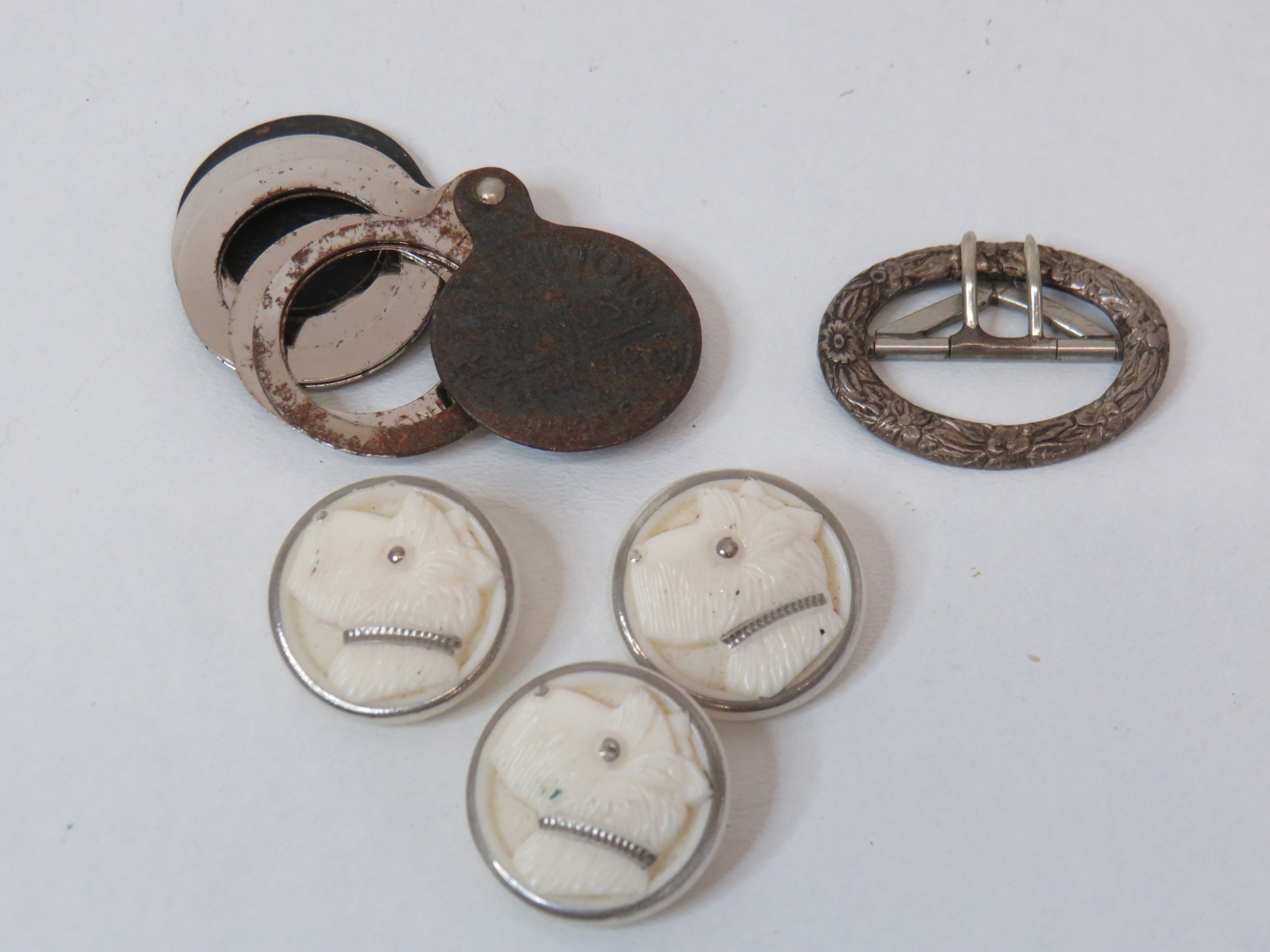 Antique Bravingtons advertising ring sizer, three Art Deco glass Scottie dog buttons and a Victorian shoe buckle.
