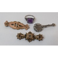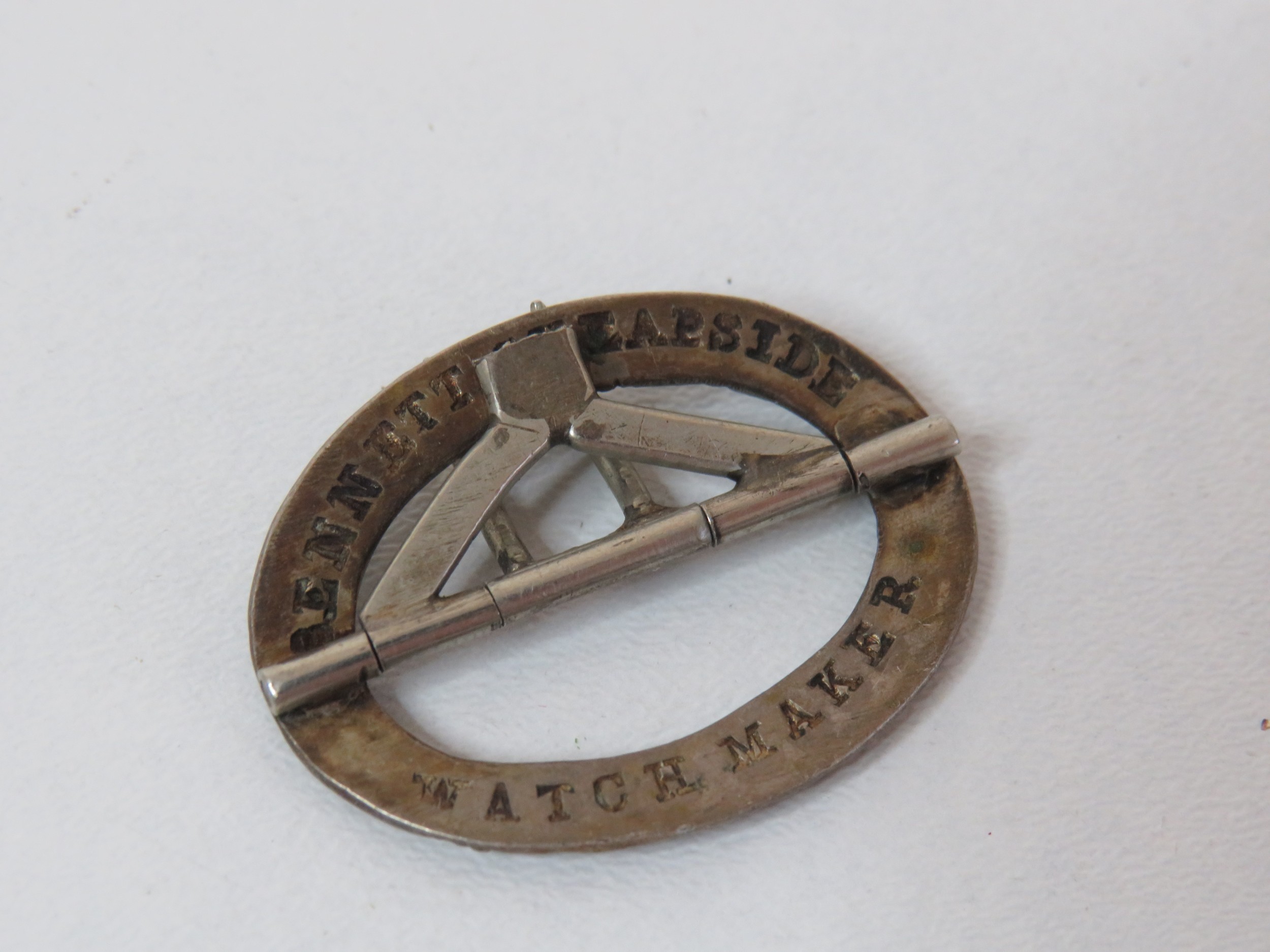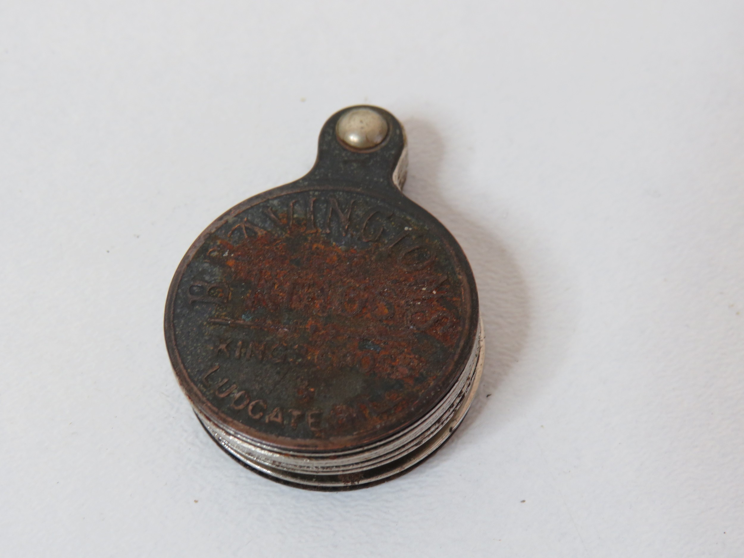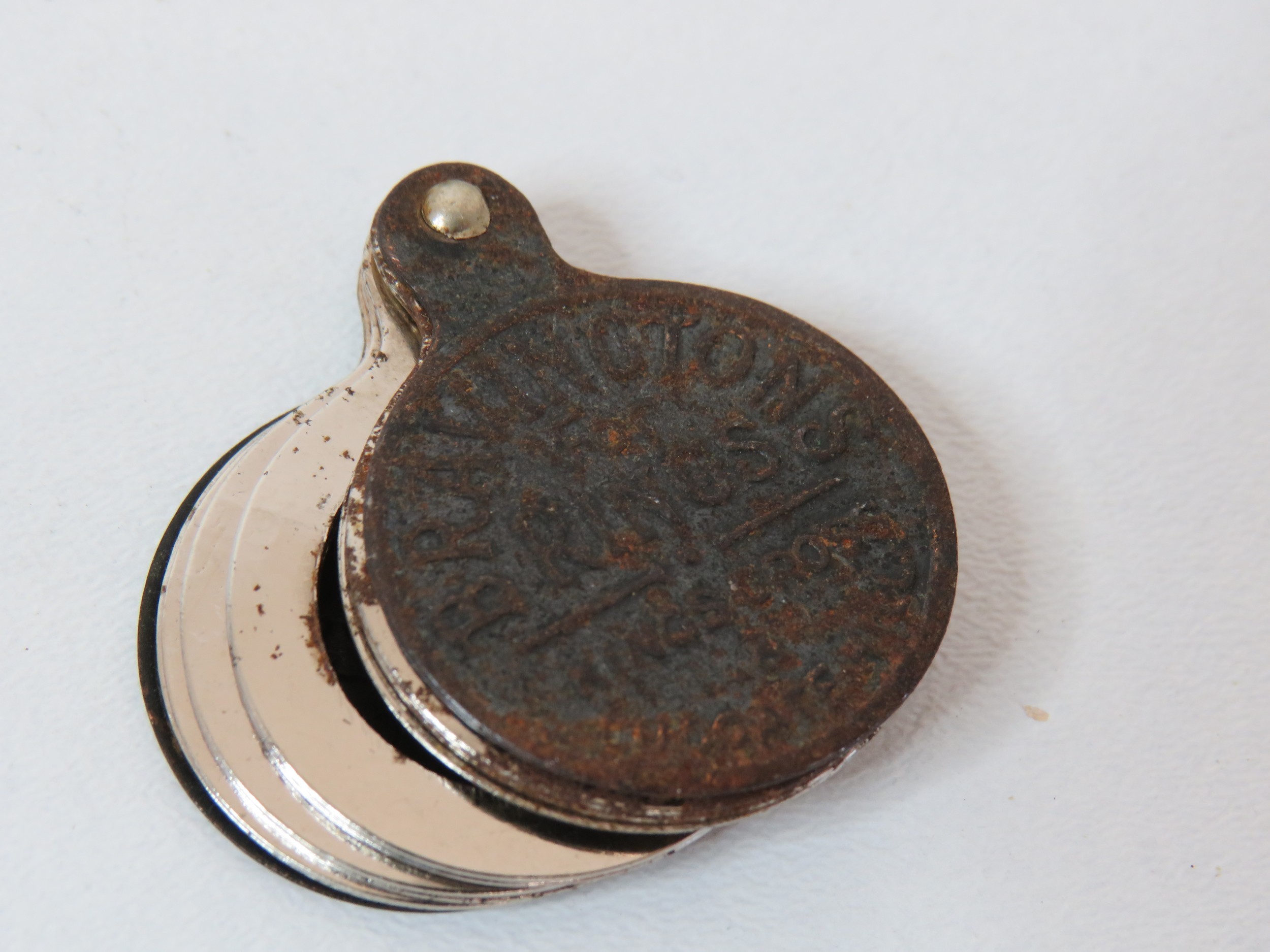Antique Bravingtons advertising ring sizer, three Art Deco glass Scottie dog buttons and a Victorian shoe buckle.