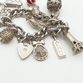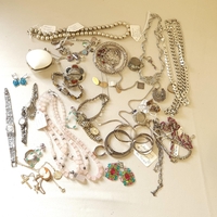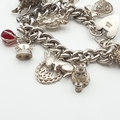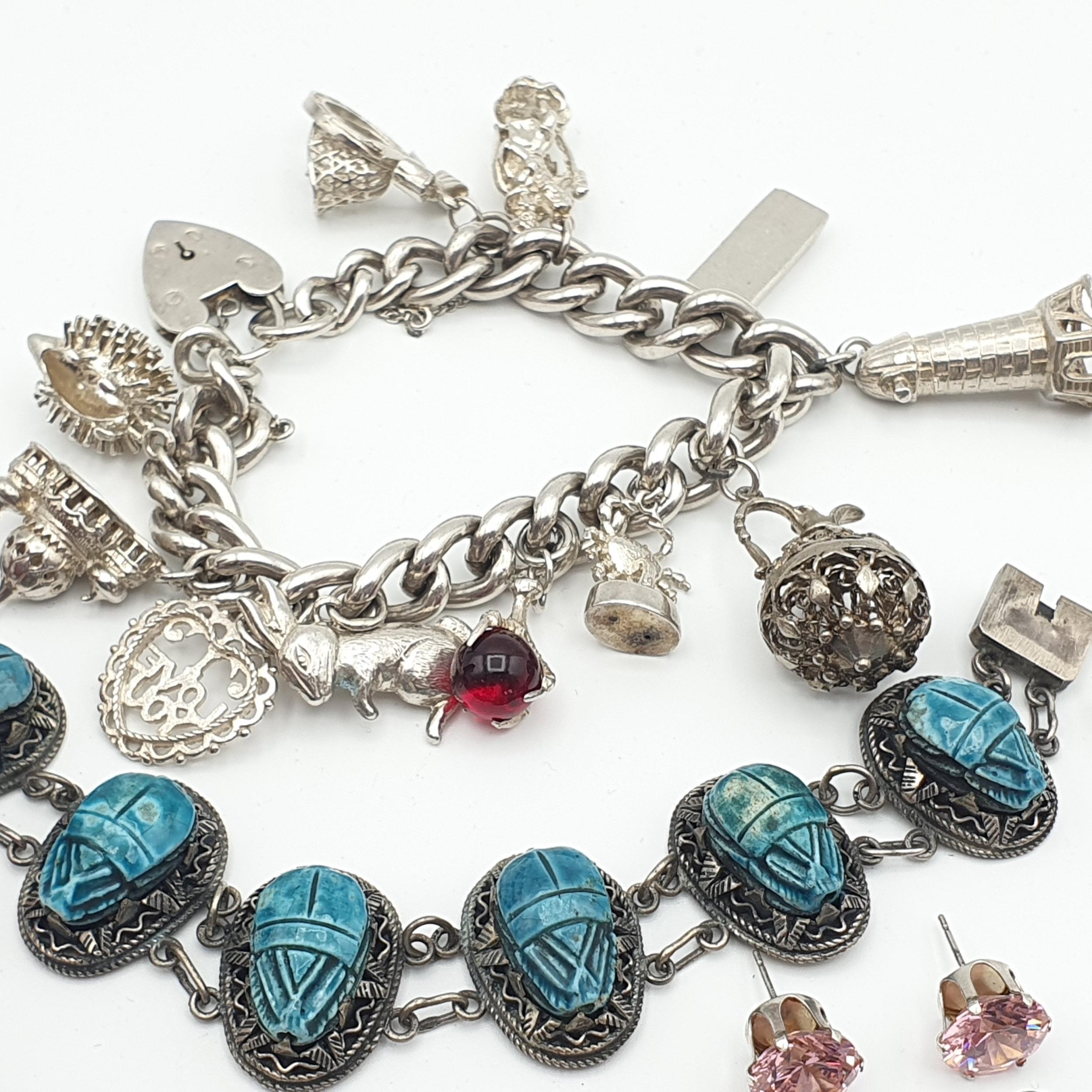 A silver curb link Bracelet with numerous charms, a scarab type Bracelet and a collection of mostly silver Earrings set various gems