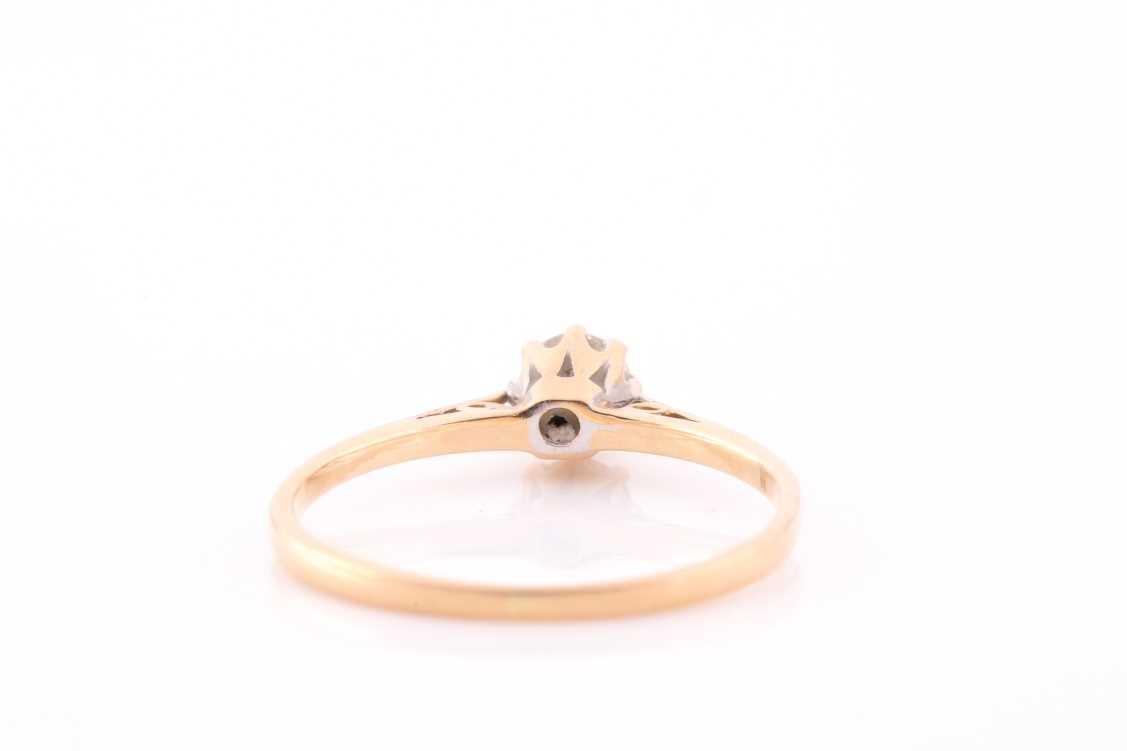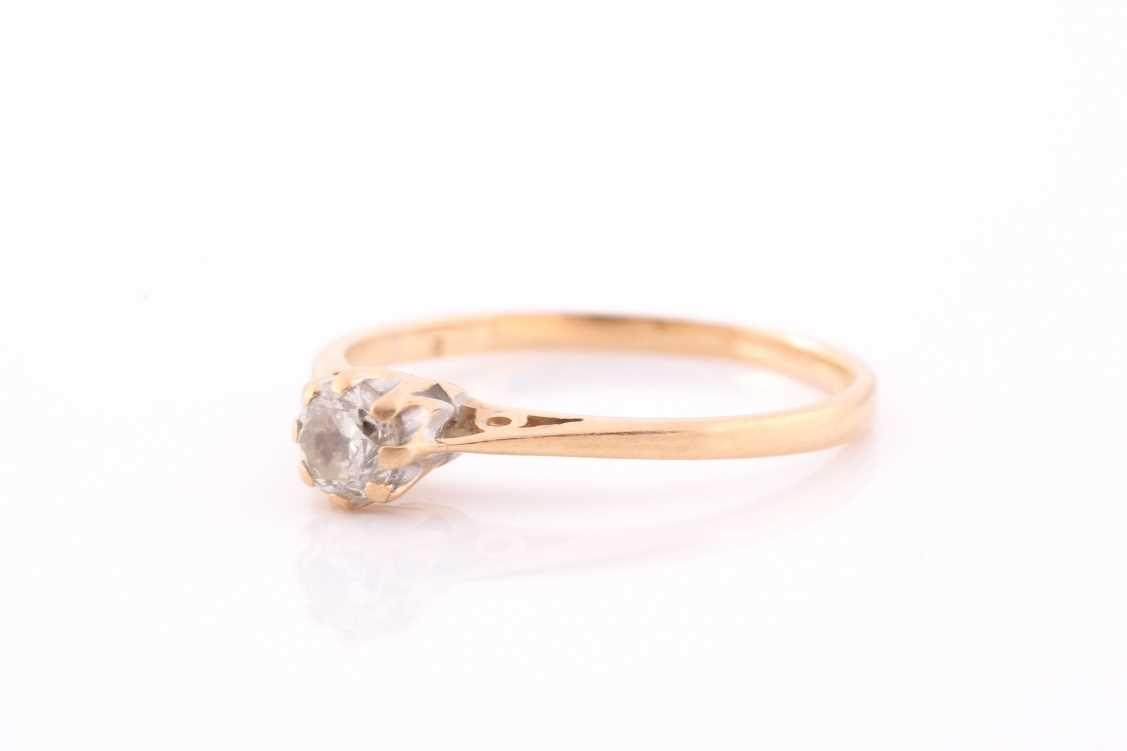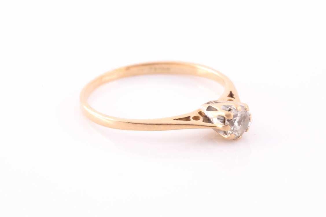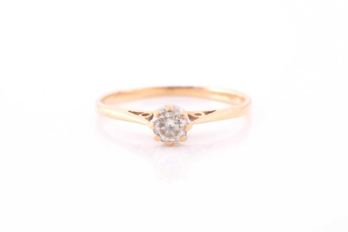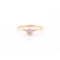 A single stone diamond ring. The round brilliant cut diamond estimated to weigh 0.16ct carat.Plain 18 carat gold shank.1.5 grams. Size P, can be resized.