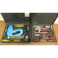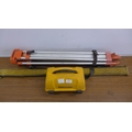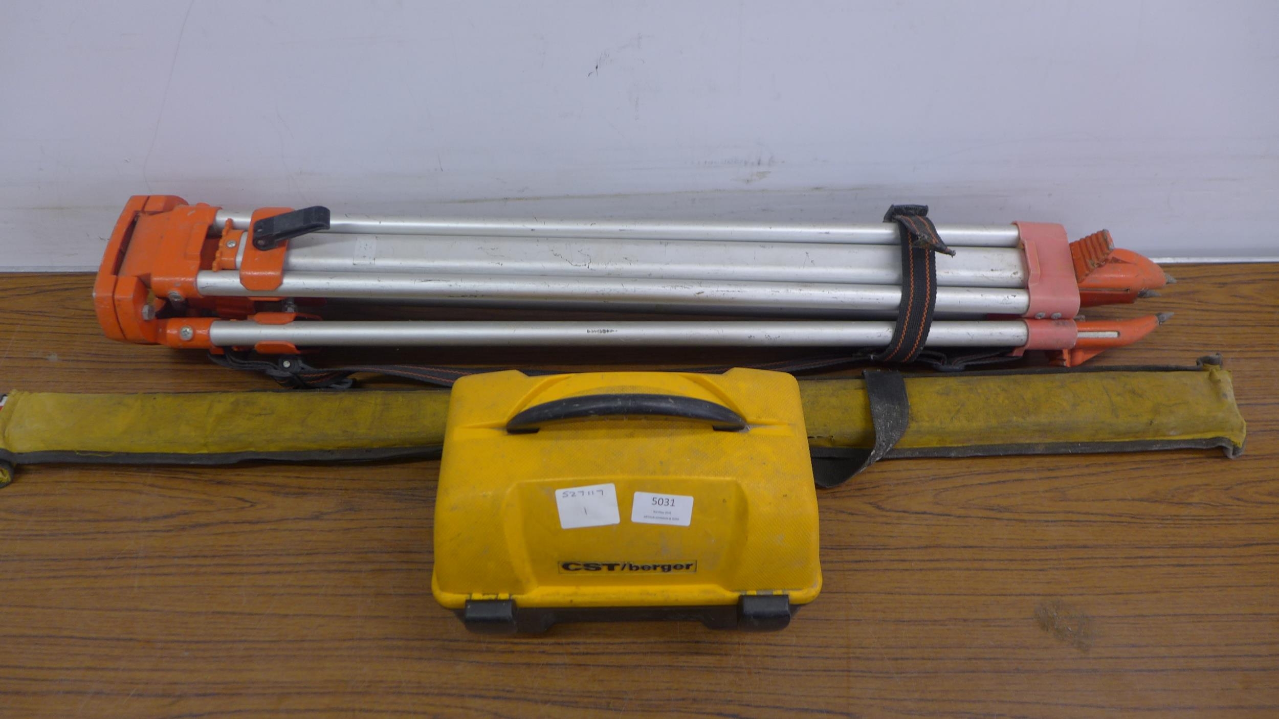A CST/Berger builders dumpy level in case with surveyors tripod and measuring stick