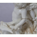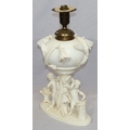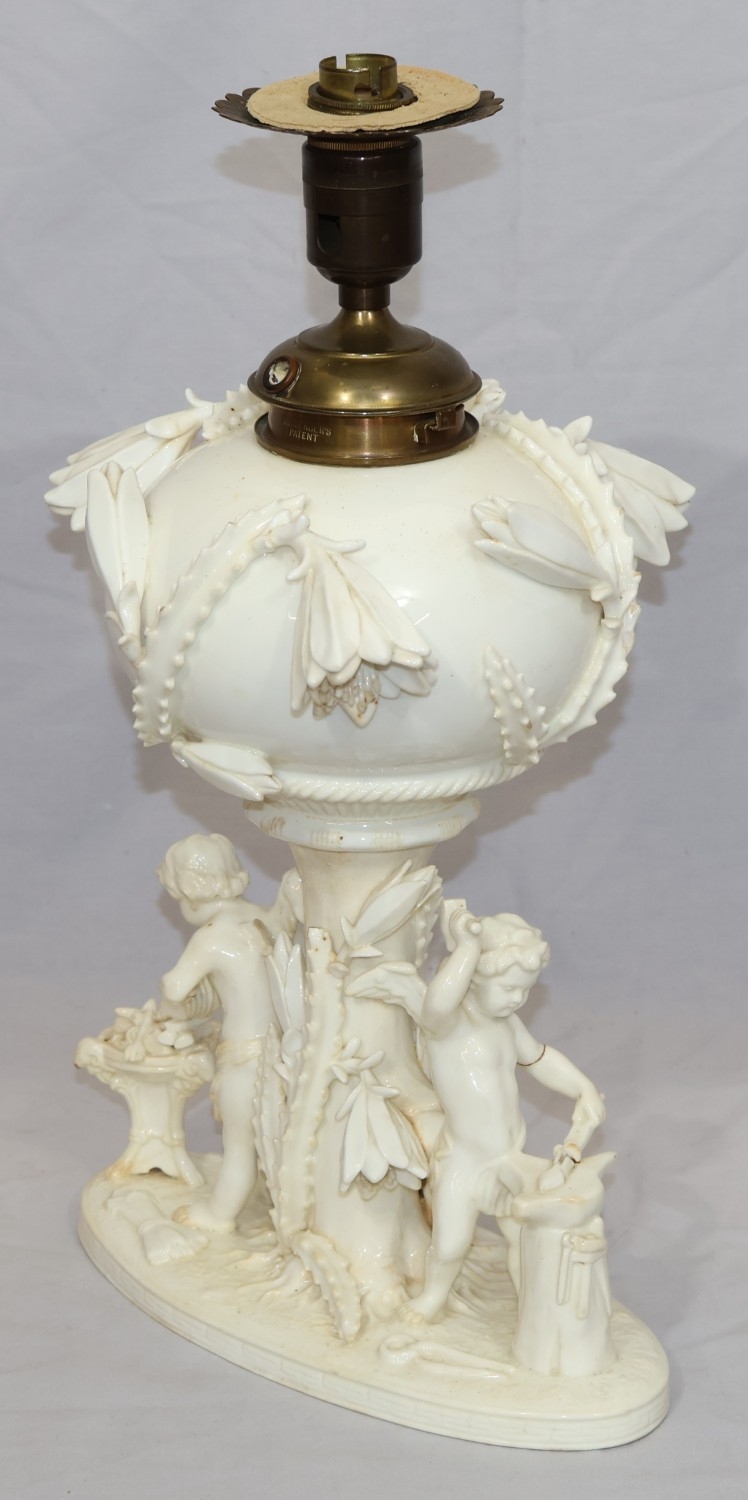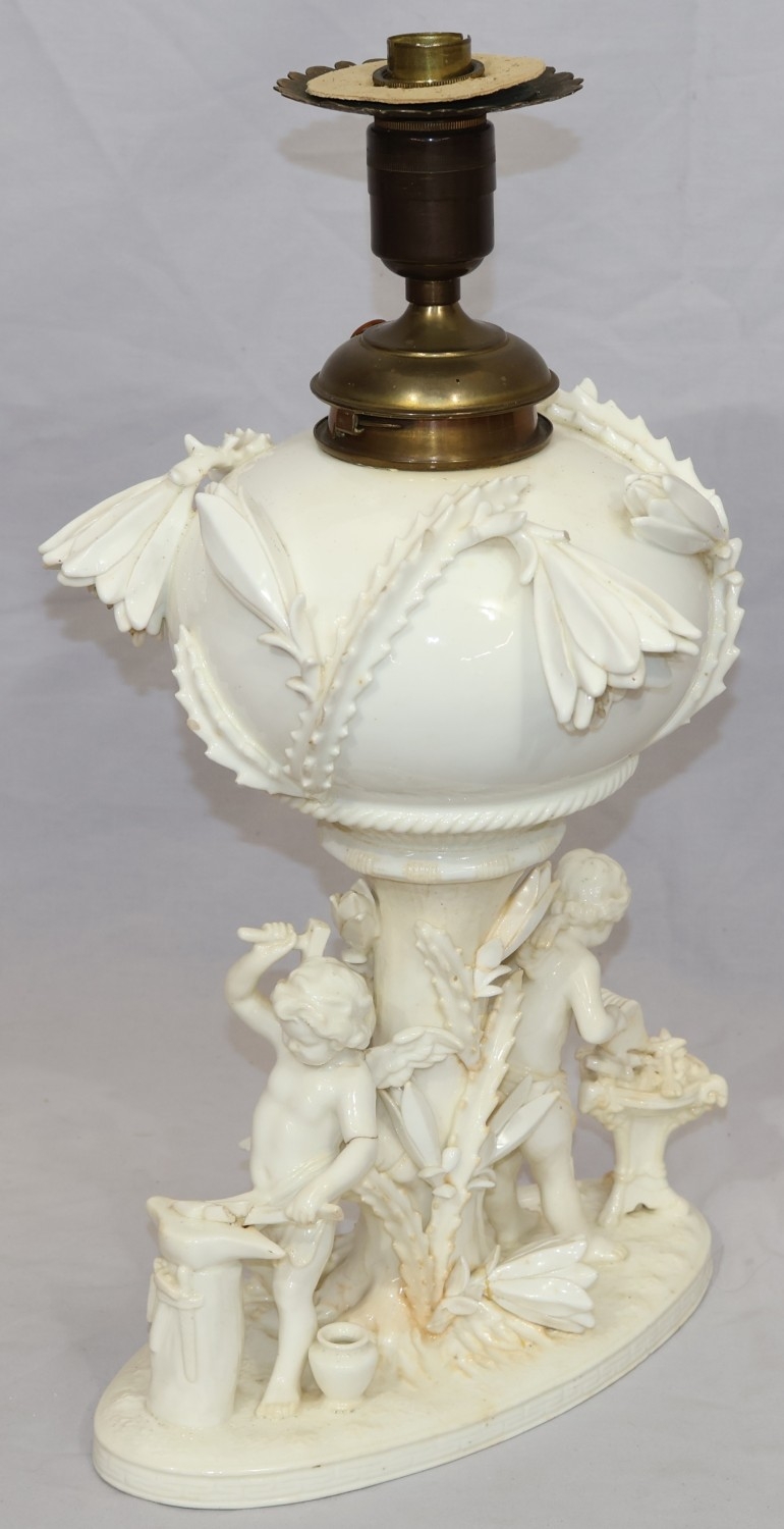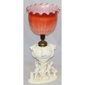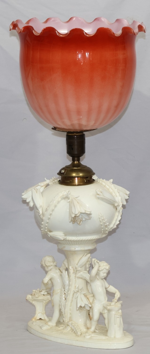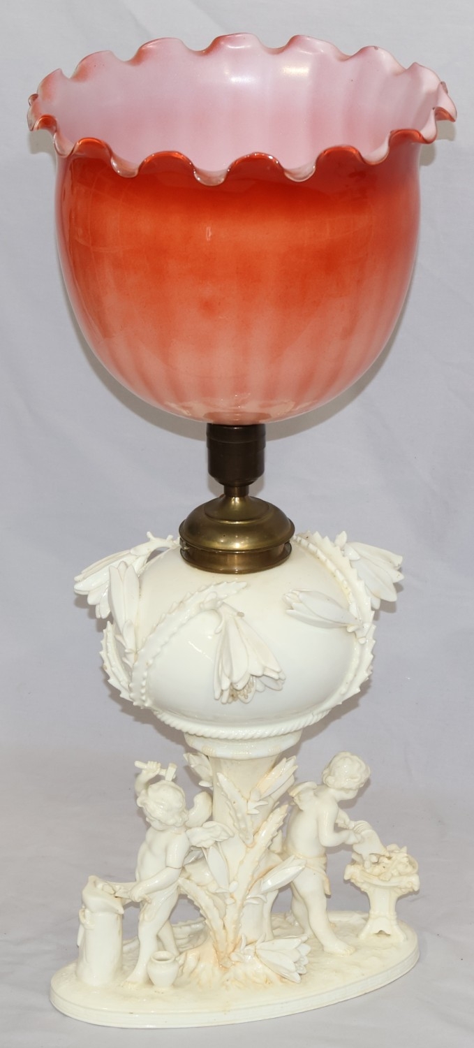 A Moore Brothers white china round bulbous shaped oil lamp with allover raised cupid, floral, leaf and branch decoration, similar orange glass shade with crinkled rim, 60cm high