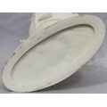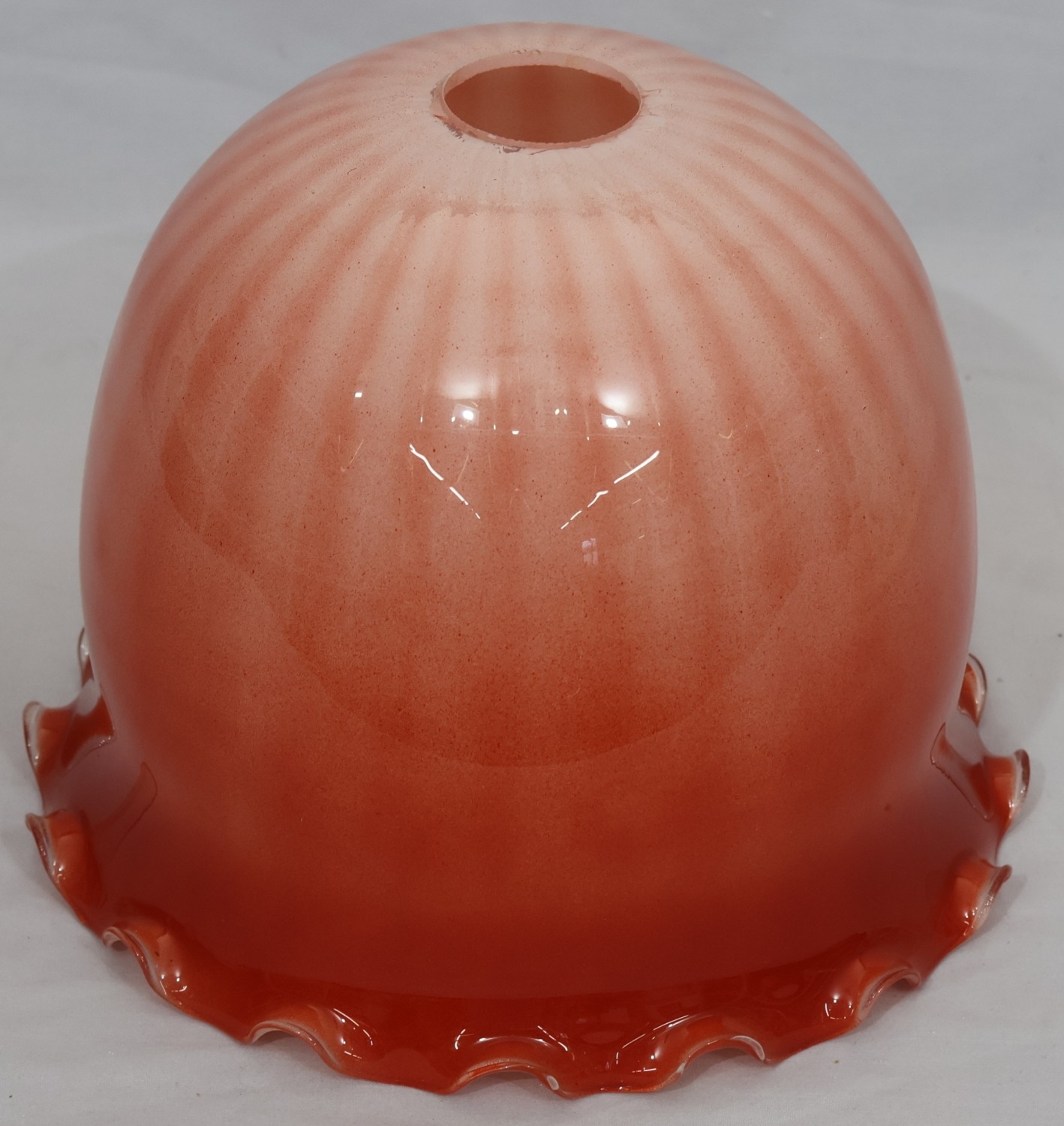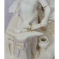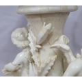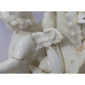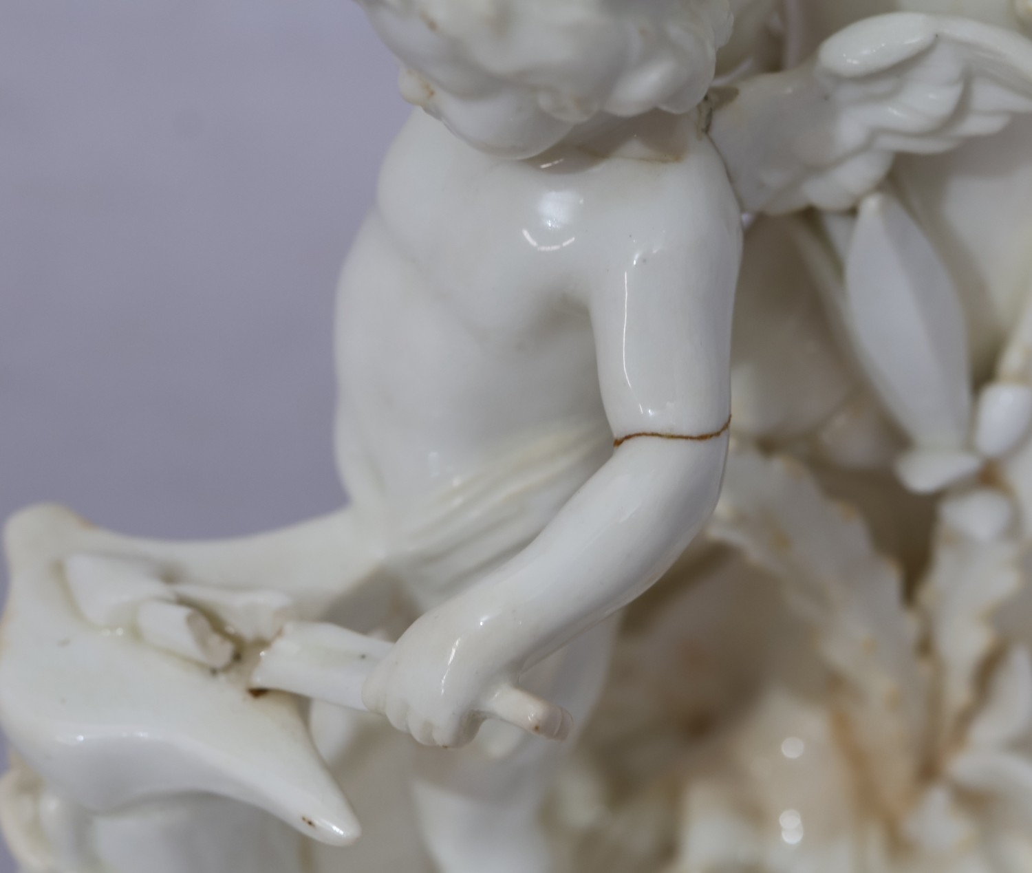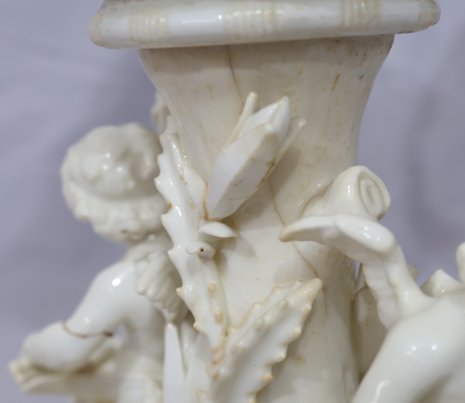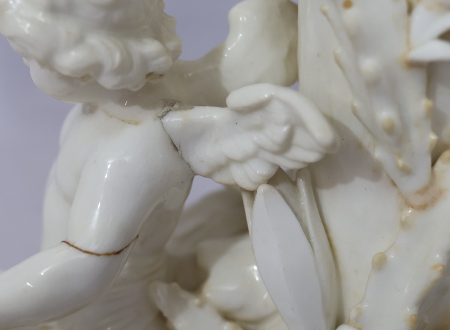 A Moore Brothers white china round bulbous shaped oil lamp with allover raised cupid, floral, leaf and branch decoration, similar orange glass shade with crinkled rim, 60cm high