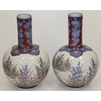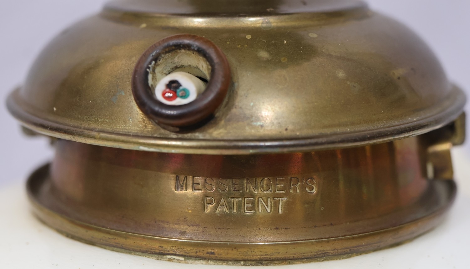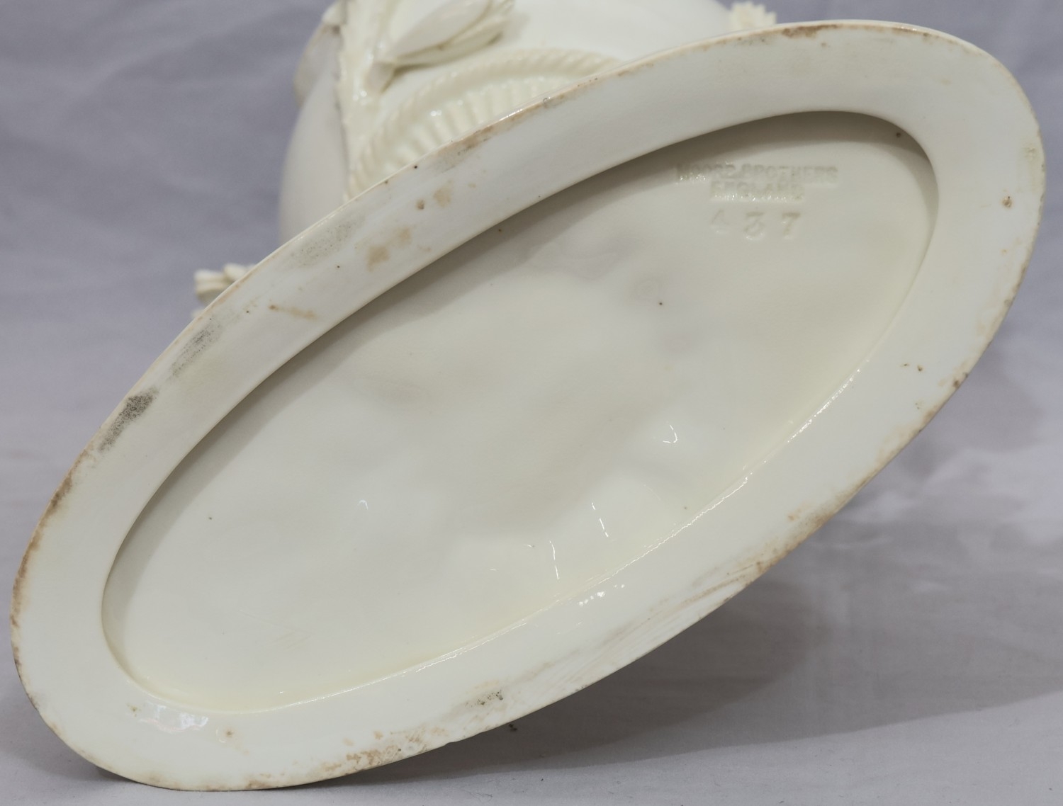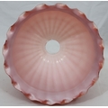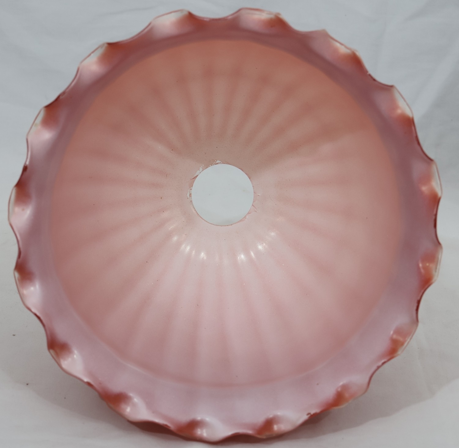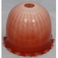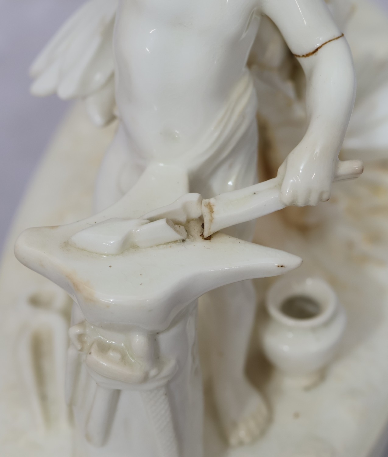 A Moore Brothers white china round bulbous shaped oil lamp with allover raised cupid, floral, leaf and branch decoration, similar orange glass shade with crinkled rim, 60cm high