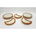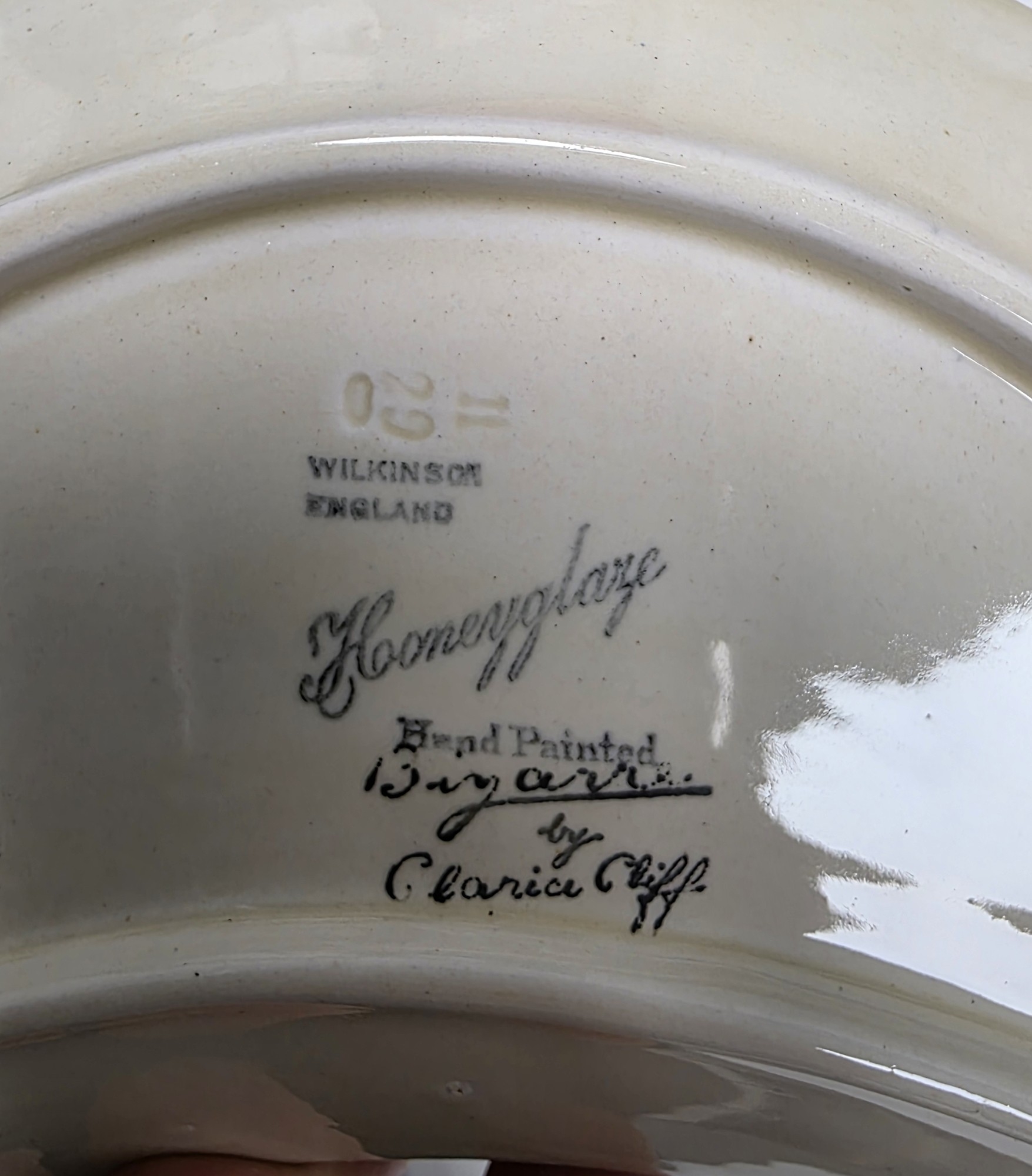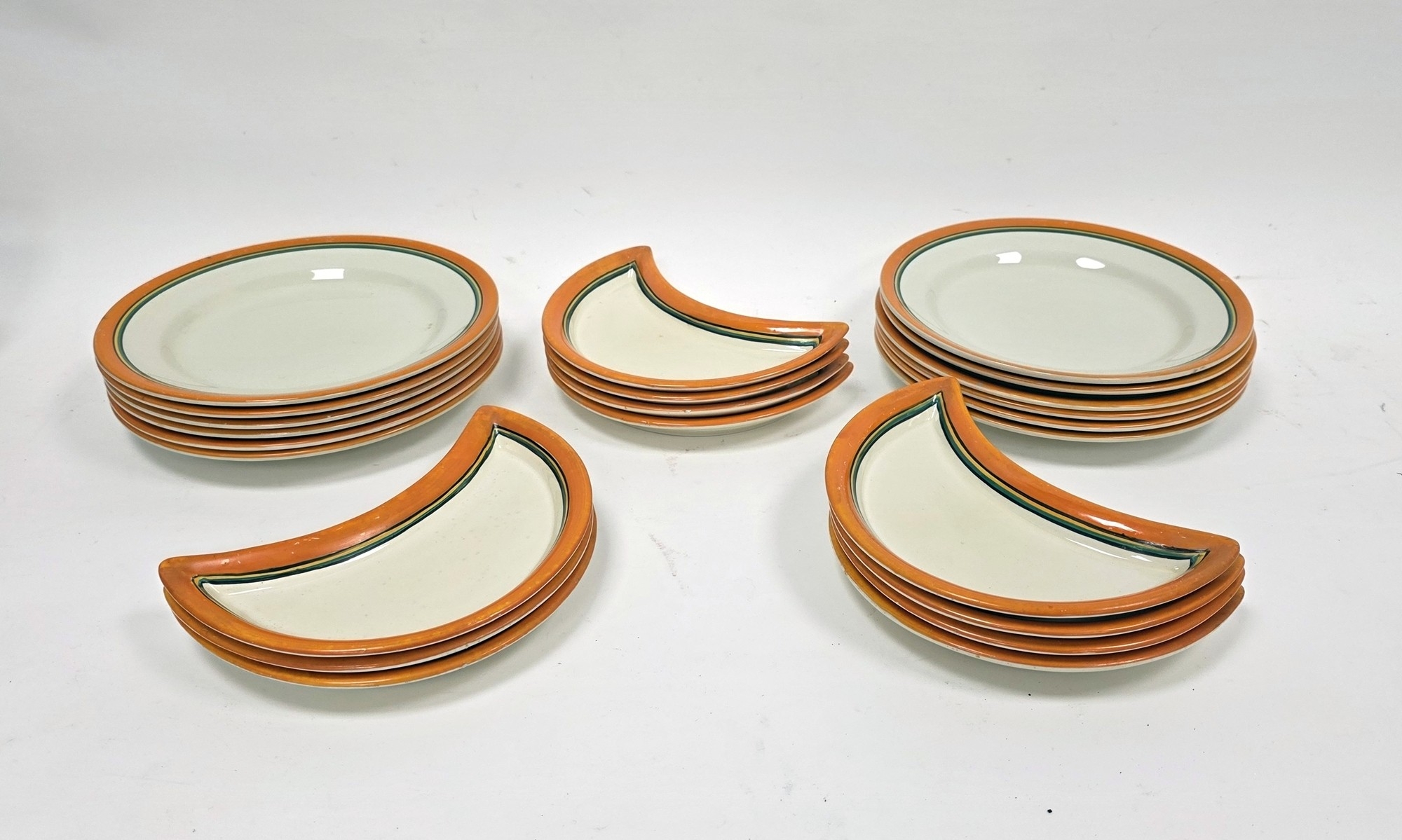Clarice Cliff Honeyglaze Bizarre Art Deco part dinner service for Wilkinson, printed black marks and impressed numerals, painted with orange, green and black striped borders, comprising 12 dinner plates and 11 crescent-shaped supper dishes
