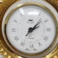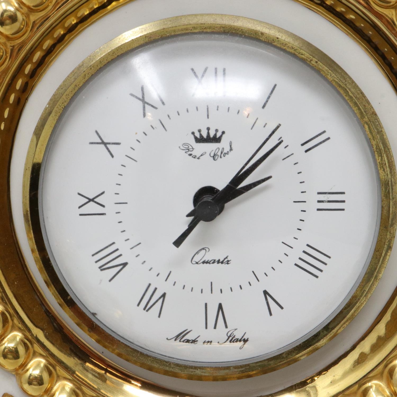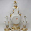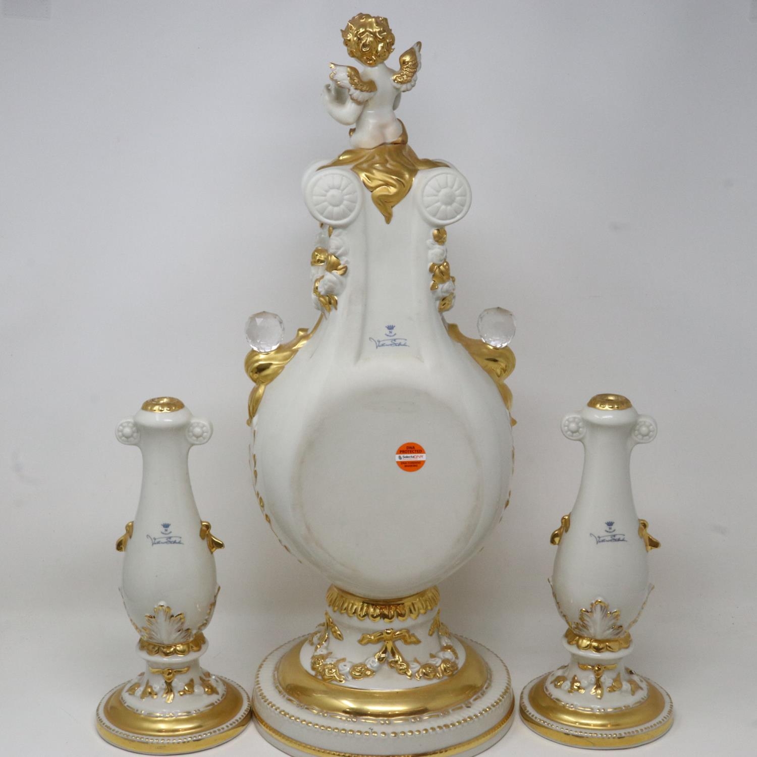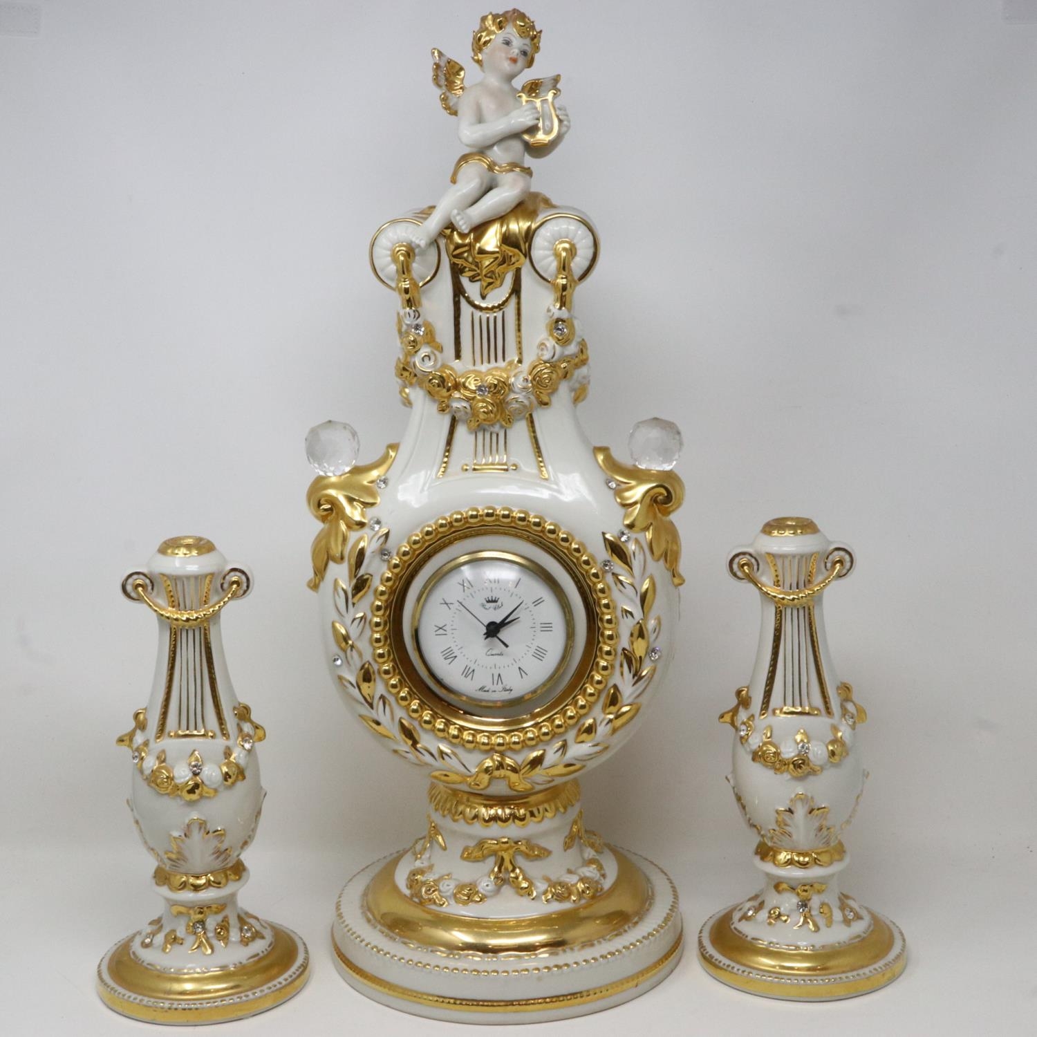 Vittorio Sabadin large gilt table clock with cherub figure and a pair of candlesticks, H: 54 cm. Not available for in-house P&P