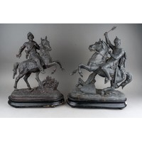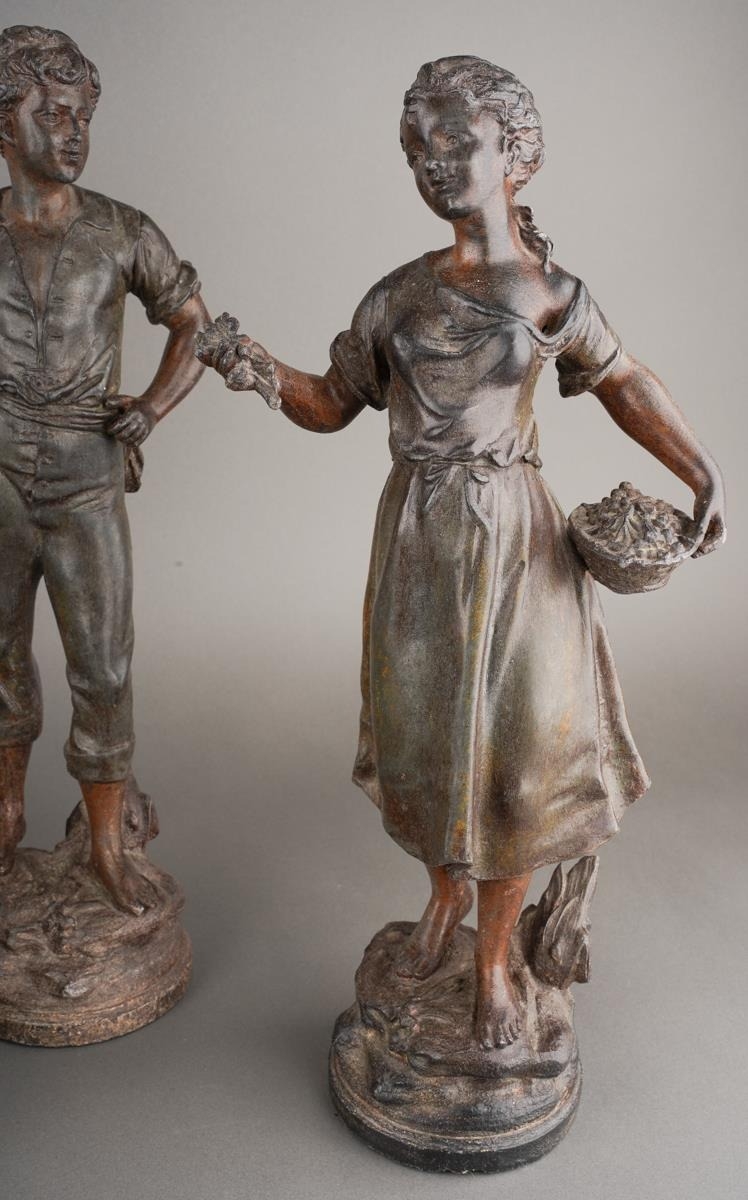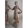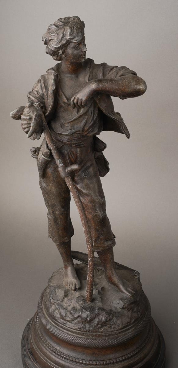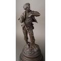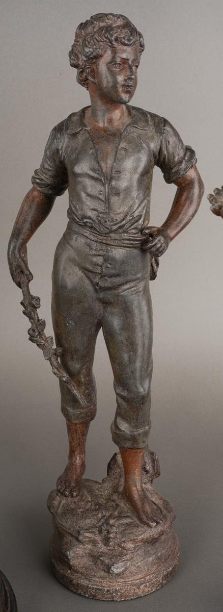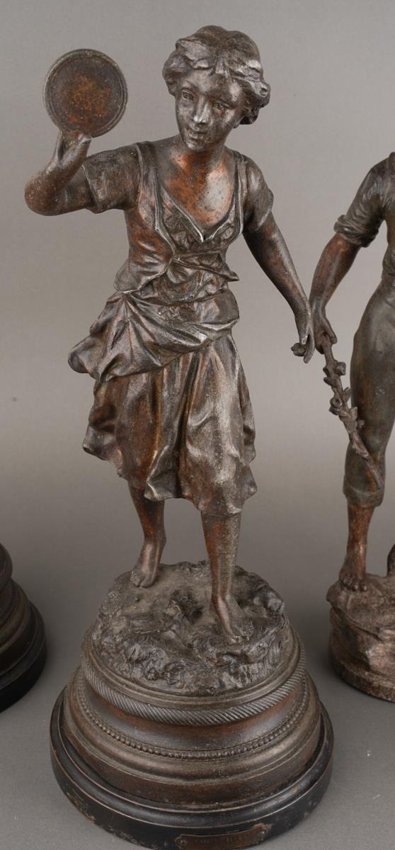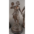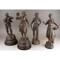After Rancoulet, a pair of spelter figures, a Lady holds a tamborine, the Man a bird [af] both on socle bases, one with title plate "Foot Ball", 38cm high approx together with a pair of French style spelter figures of Flower Sellers, approx 38cm high [4]