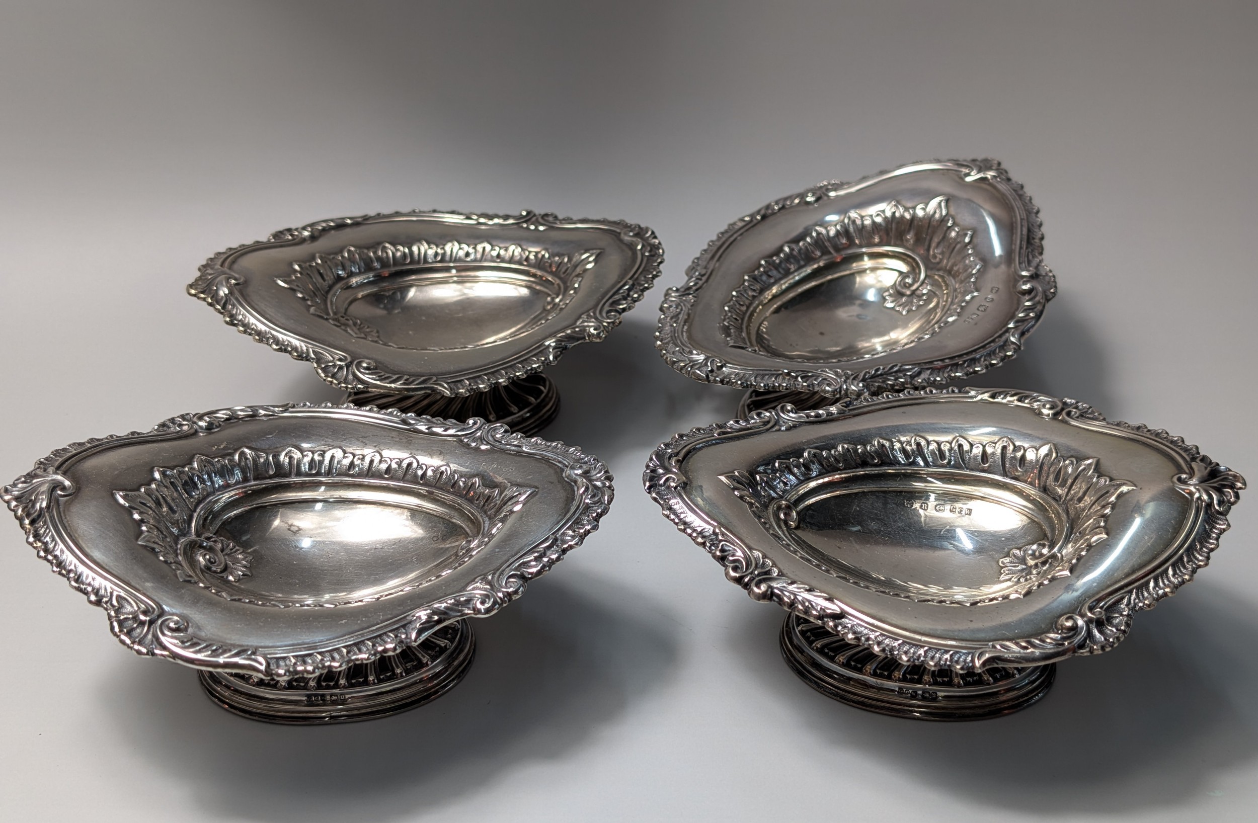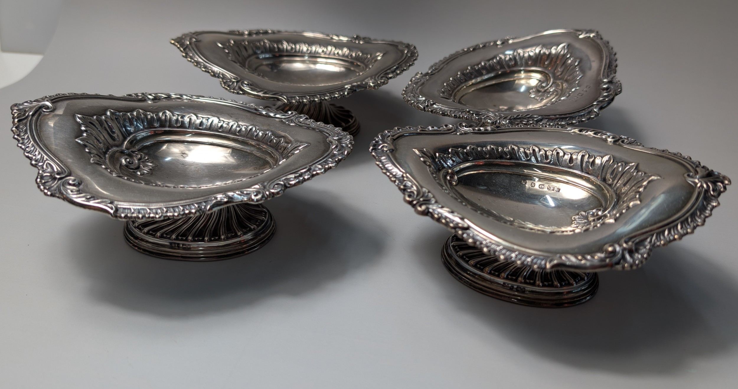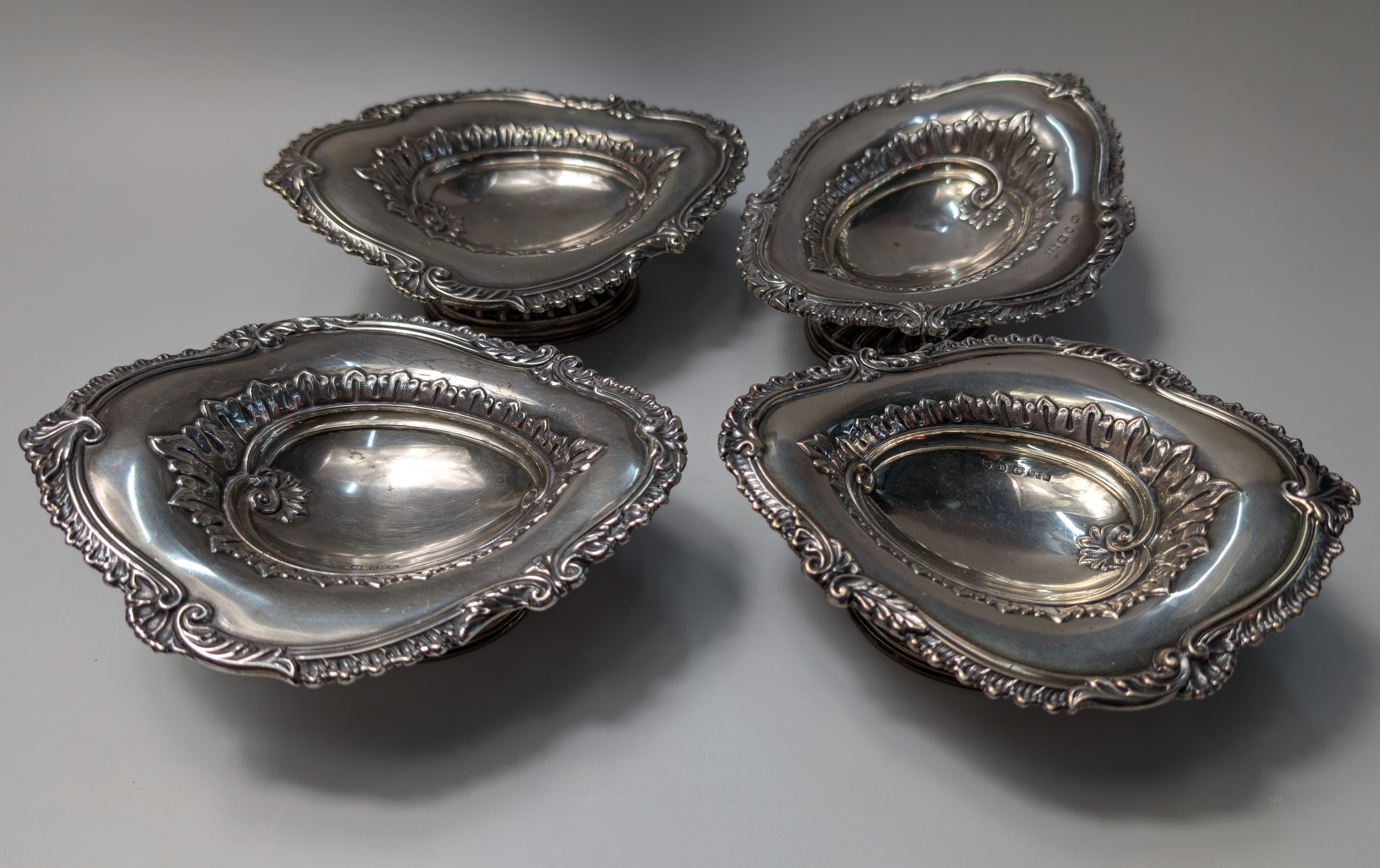 Set of four Late Victorian silver footed bonbon dishes, G C W, Birmingham 1894, length 14.2cm, height 6cm, gross weight 475 grams