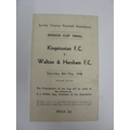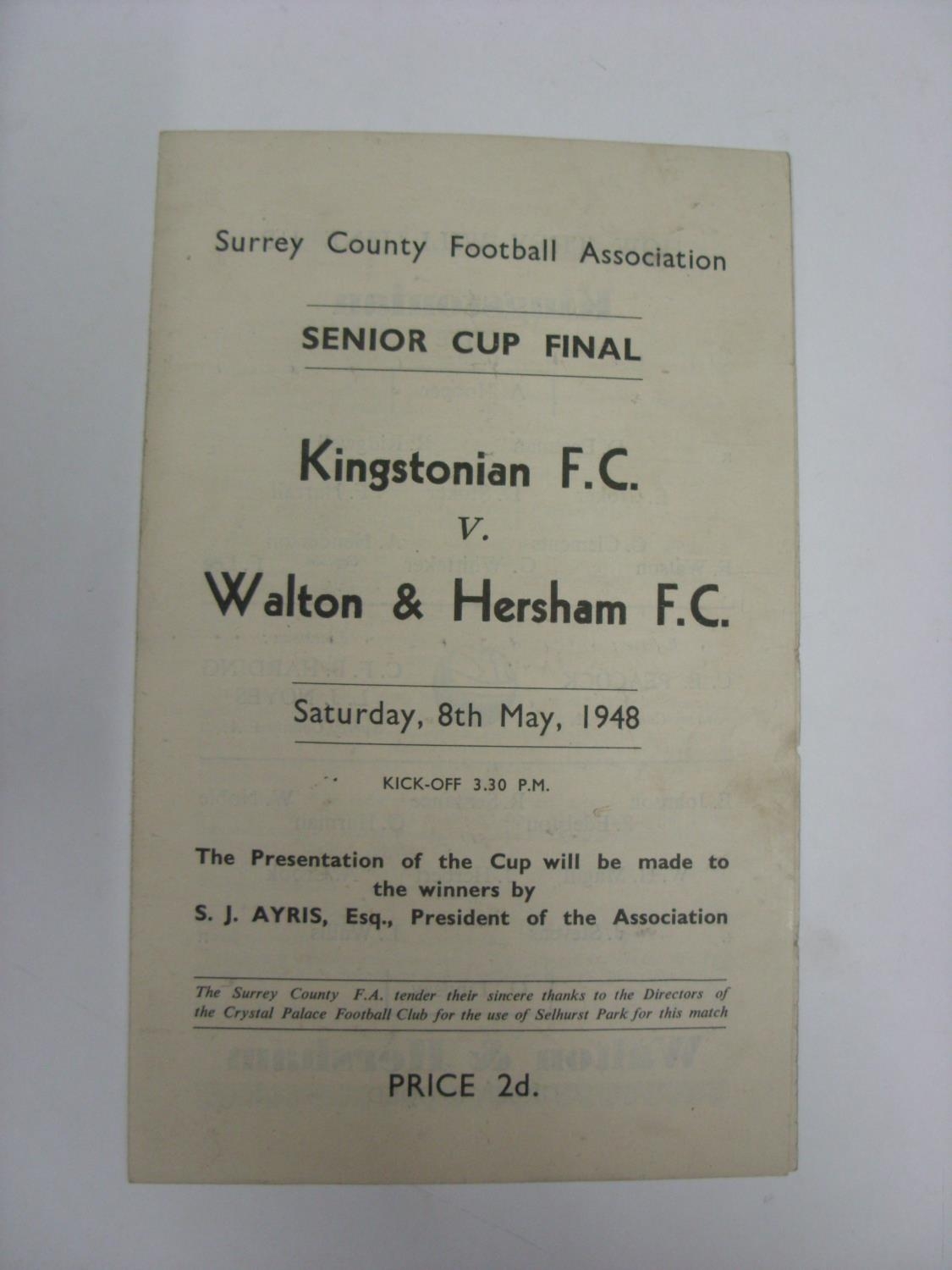 AT CRYSTAL PALACE, 1948, a football programme from the Surrey Senior Cup Final, Kingstonian versus Walton And Hersham, played at Crystal Palace on 08/05/1948 (4 Pages, folded). Estimate: £18/£20 - Opening Bid: £16