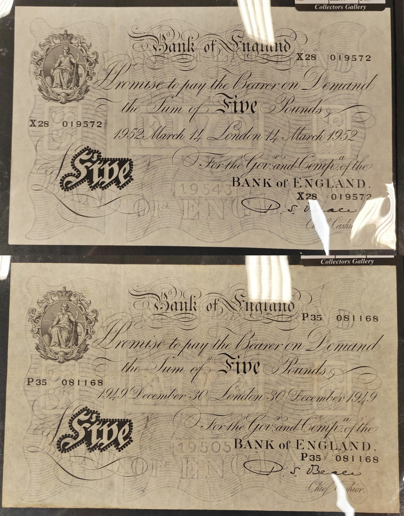 Collection of English banknotes generally very fine to extremely fine (some water damage), includes Beale £5 London 30th December 1949, 14th March 1952, plus £50 (4), £20 (13), £10 (6), £5 (13), £1 (29), 10 shillings (10) ranging from Mahon to Bailey. (½B)