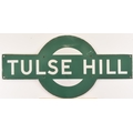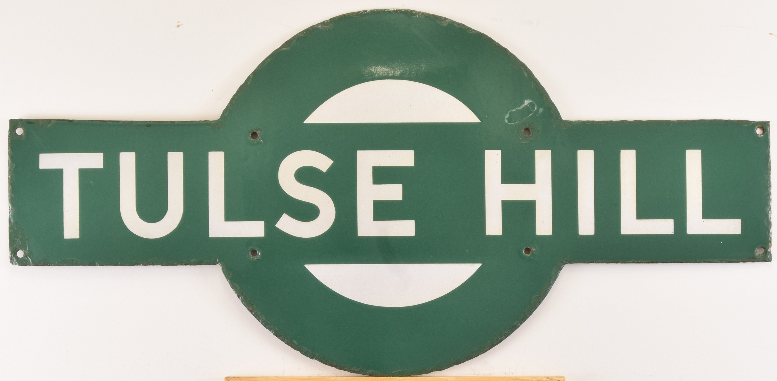 Enamel Southern Railway, target, TULSE HILL, from the station in Lambeth. Good colour and gloss, edges and fixing holes touch up in places, one enamel chip has been glued back on, 27 x 13 inches. Shipping band - D.