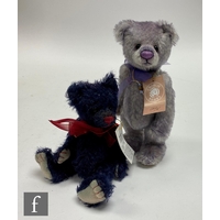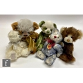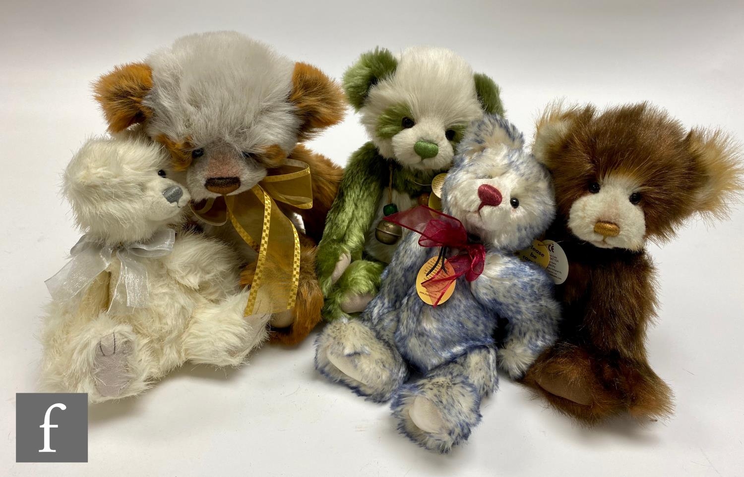 Five Charlie Bears teddy bears and panda bears, Rodley panda bear (CB104717B), green and cream plush, height 33cm, Becky teddy bear (CB104716A), brown and pale grey plush, Jasmine panda bear (CB094062), beige and brown plush with cinnamon tips, Laura teddy bear (CB104693), white plush with violet tips, and Niamh teddy bear (CB094079A), cream plush, all with swing tags. (5)