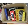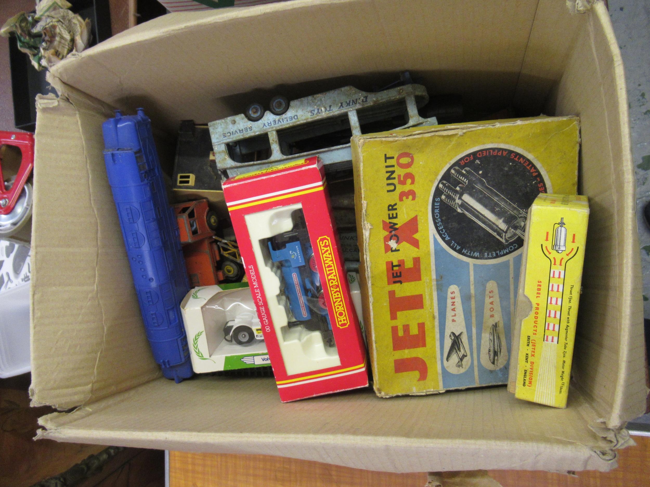 Box containing a quantity of various Diecast metal toys including some Dinky (at fault), two used but boxed Jetex engines etc