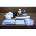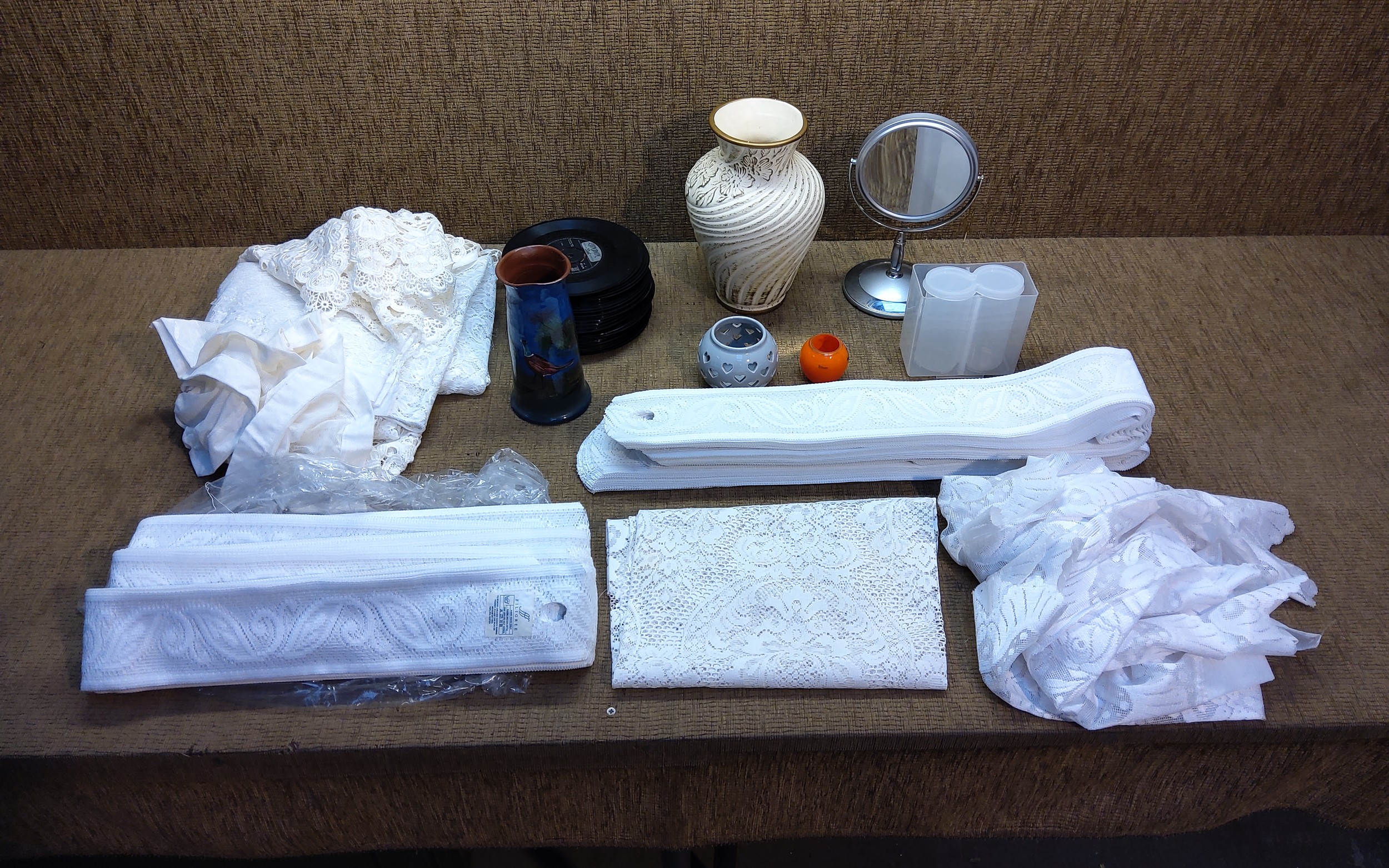 Assorted items including a selection of 45 vinyl records, handcrafted vase and curtain nets