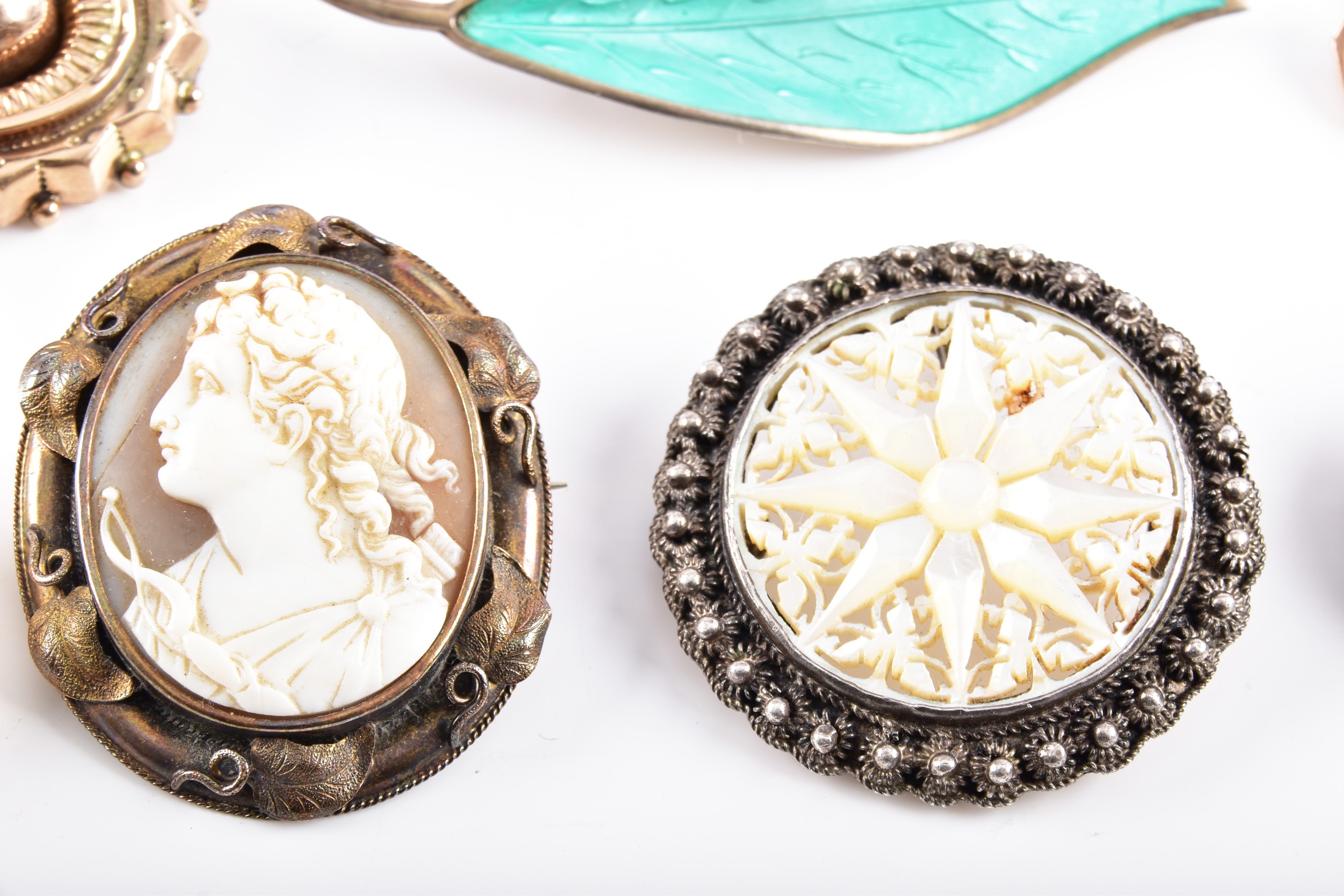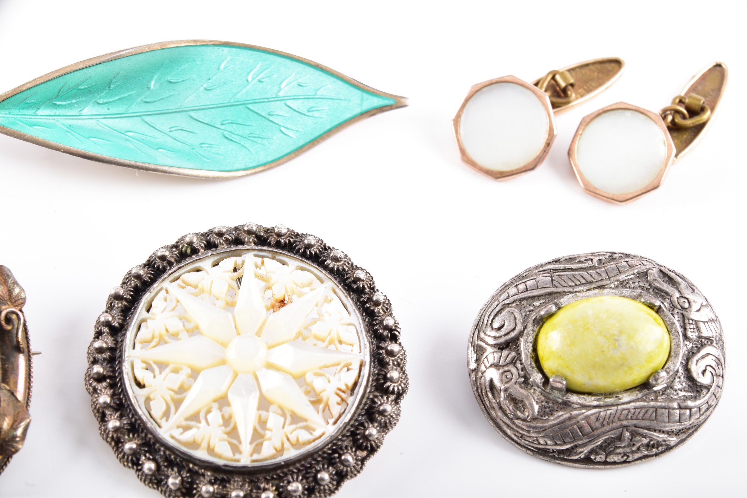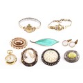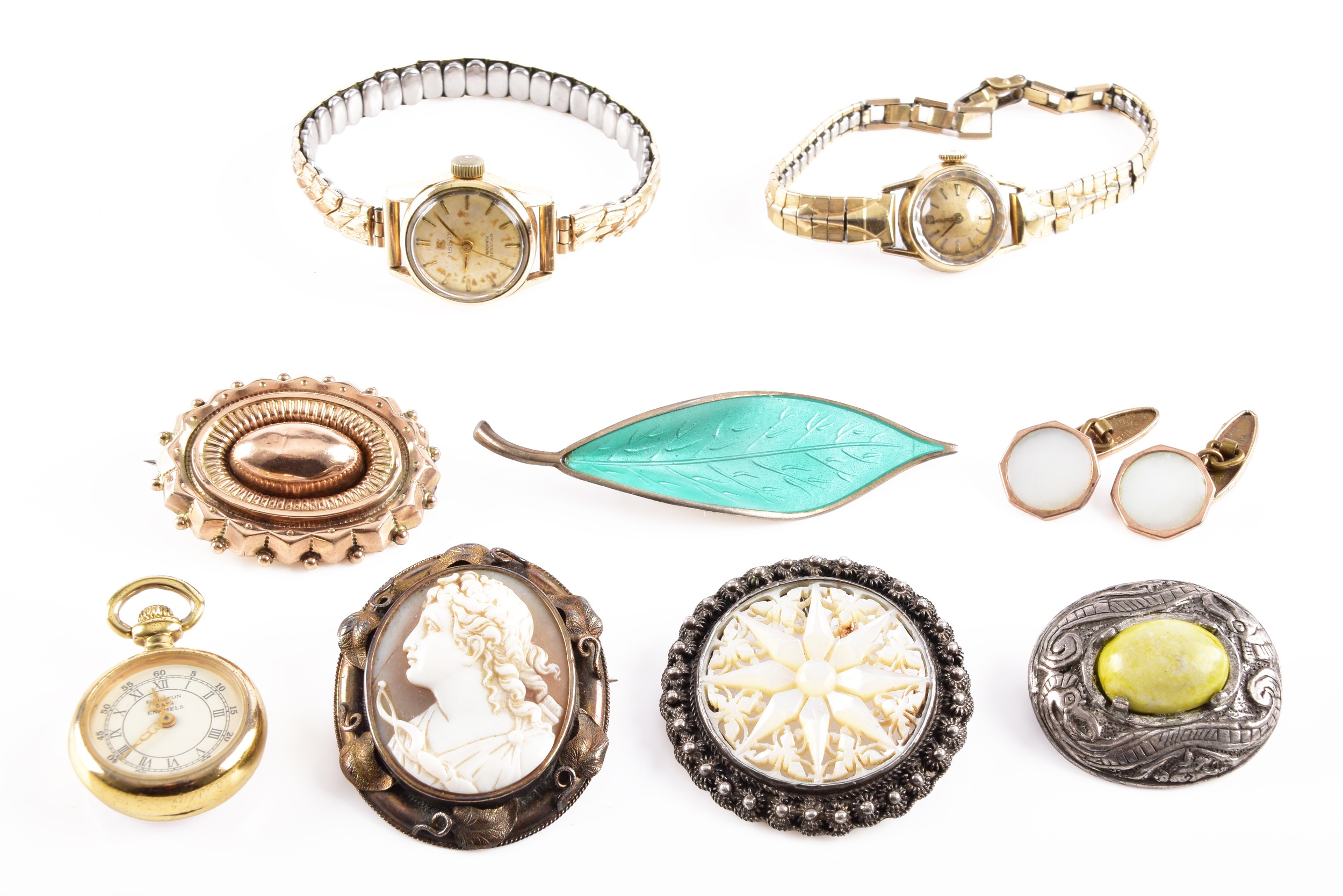 A David Anderson green enamel leaf brooch, Victorian style yellow metal brooch, a pair of yellow metal cufflinks, two Tissot ladies wristwatches, three brooches, and a Halcyon Days enamel Winnie The Pooh pocket watch.