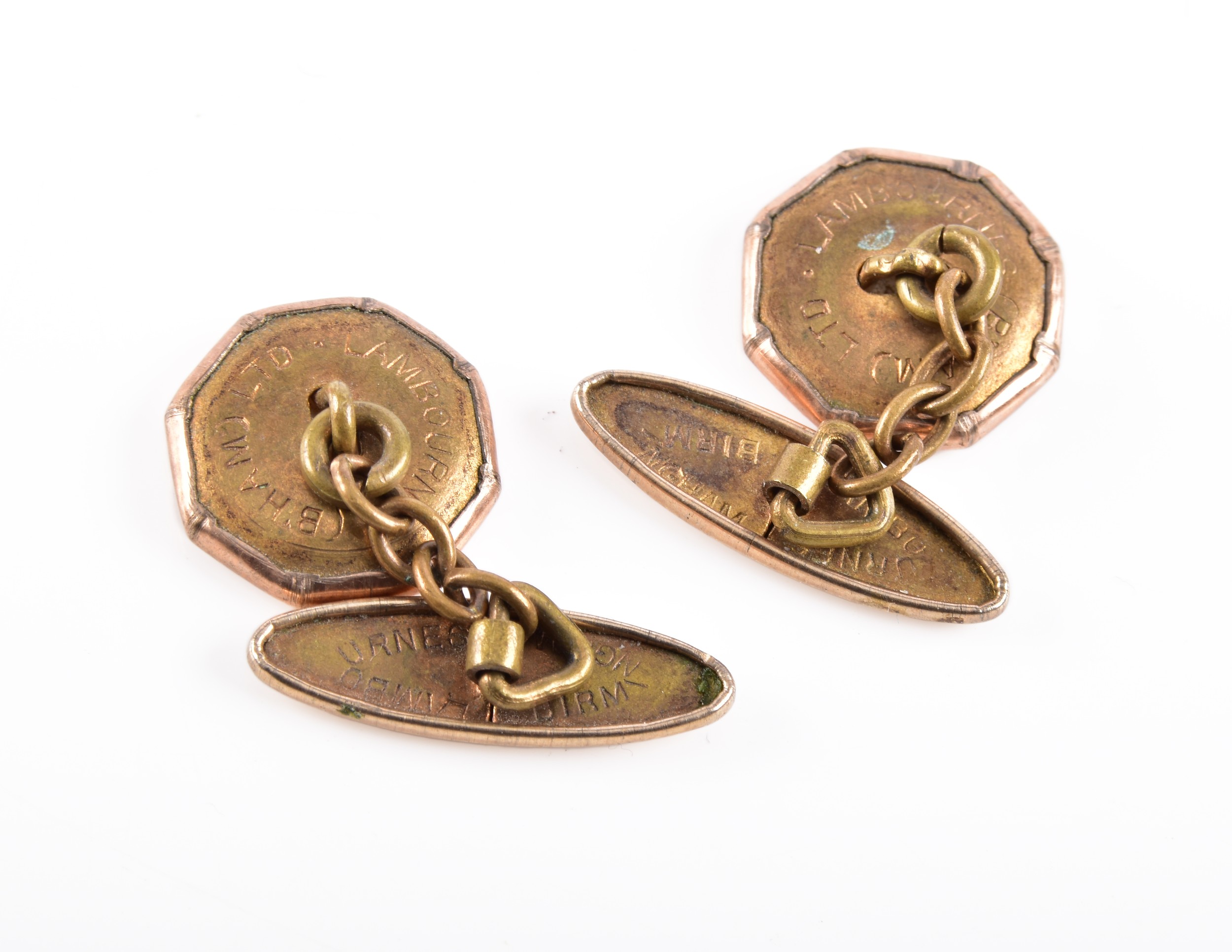 Cufflinks unmarked, front tests as gold, reverse as base metal, total weight; 4.4 grams.