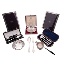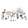 A mixed lot of silver & plate, to include a silver plated expanding toast rack and the following silver items; 4 brushes, a hand mirror, 6 napkin rings, an oval salt, a small bowl, an egg cup, a vesta case, 2 pendants and a mounted glass smelling salts bottle, some of the above initialled, mixed makers & dates; the mirror 9.8'' (25.2cm) long; 6.25ozt weighable silver (lot)