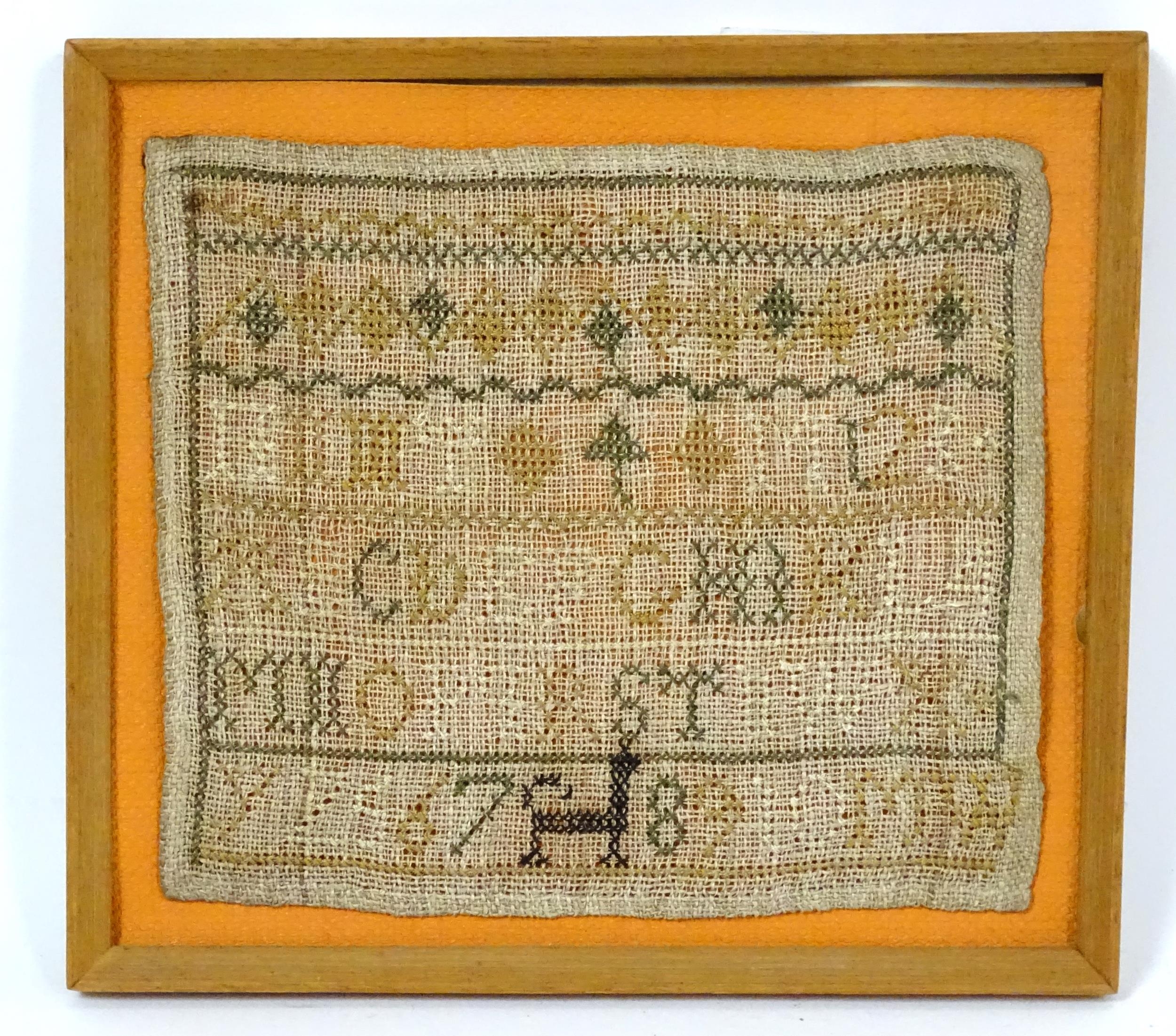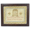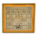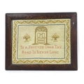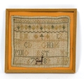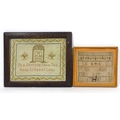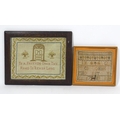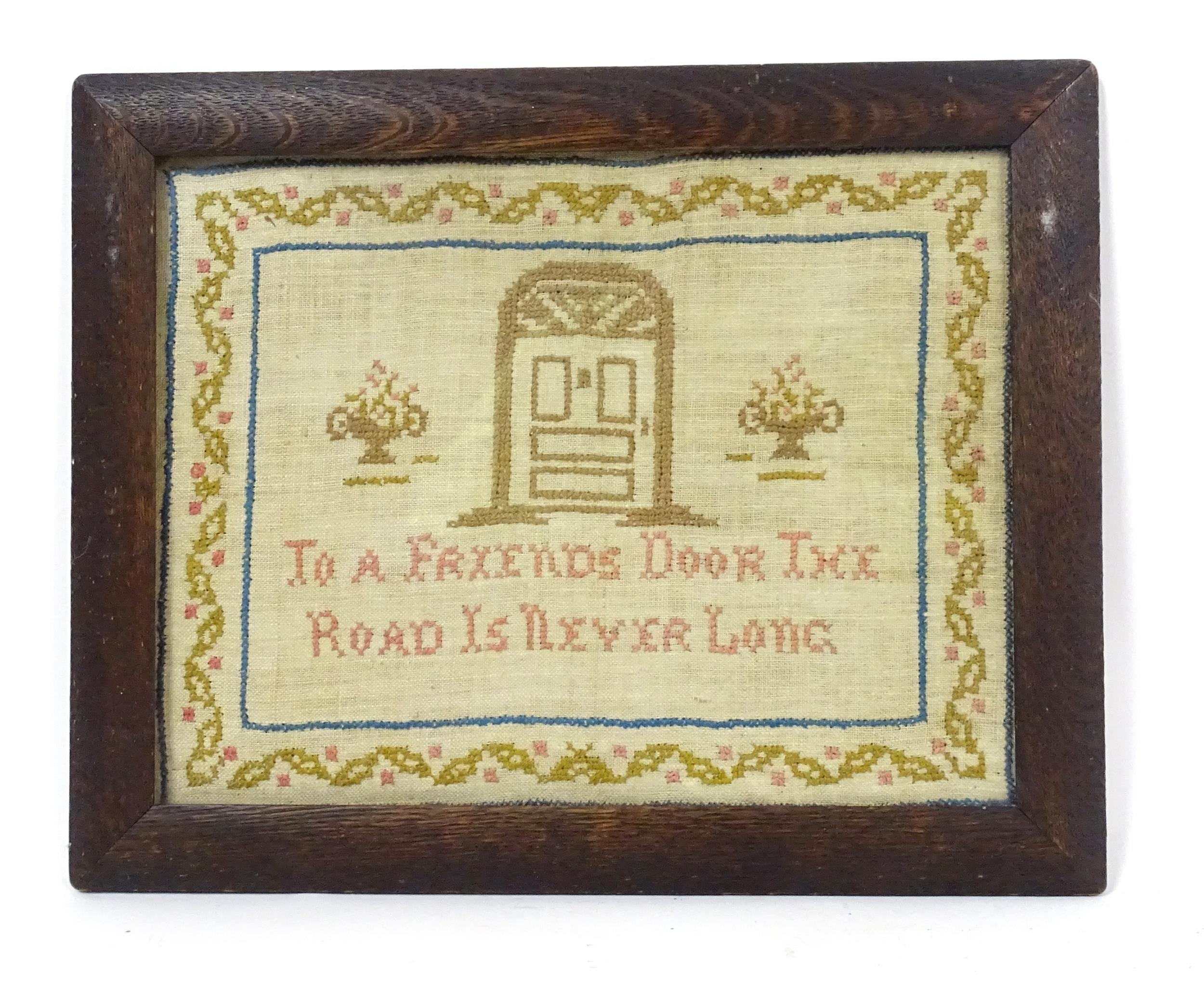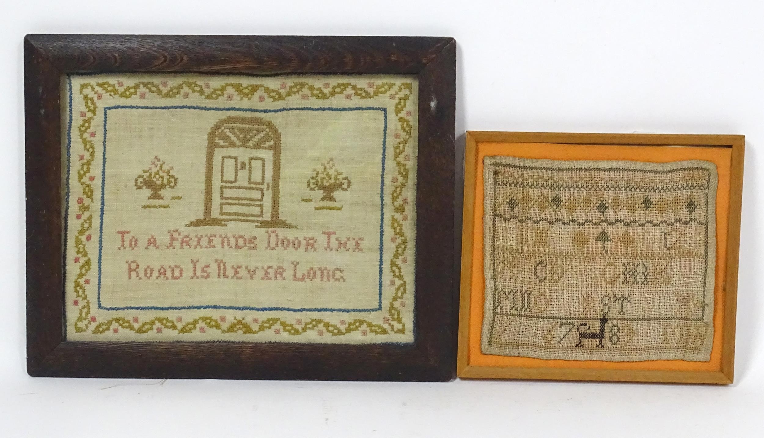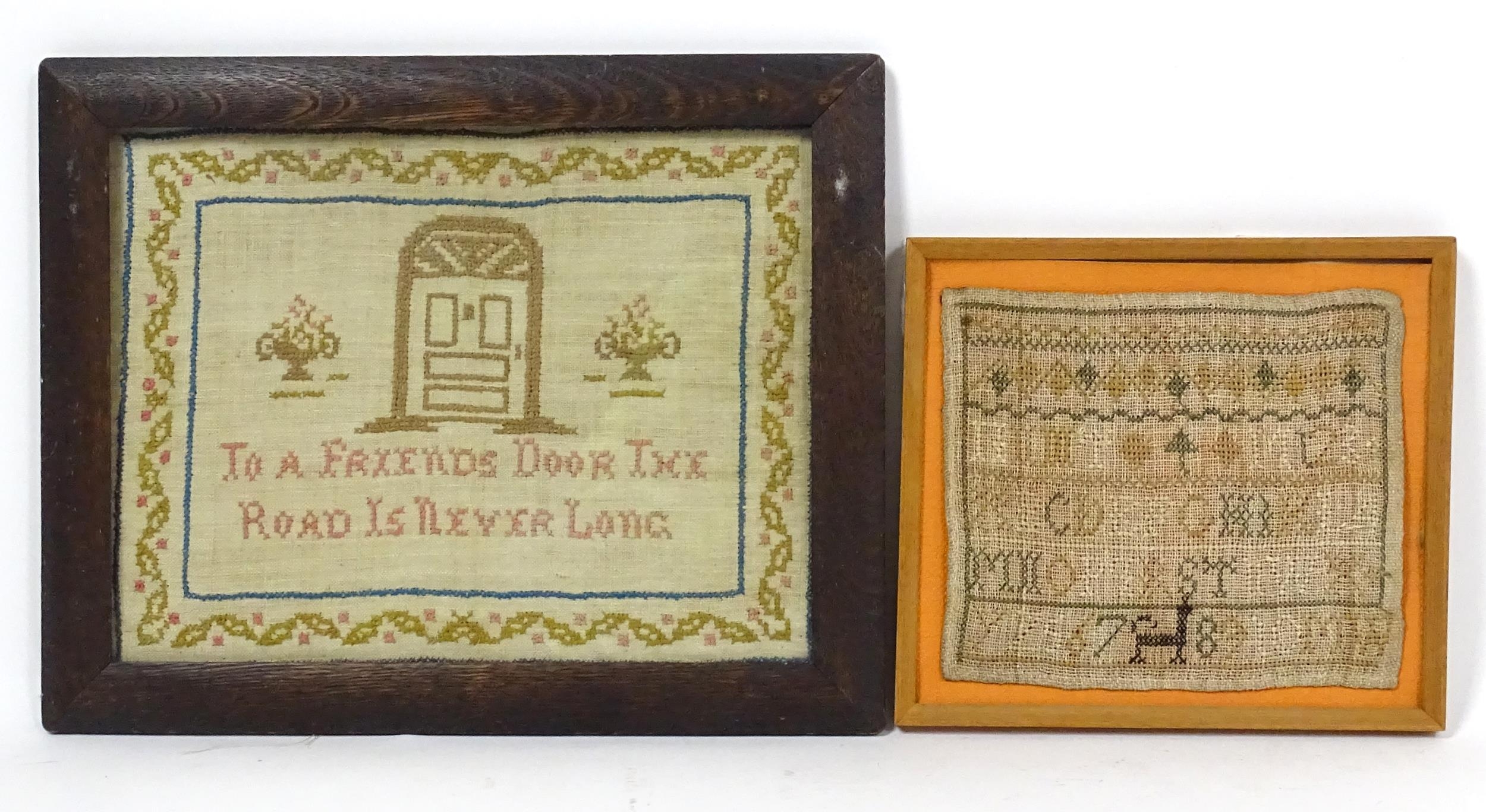 A 19thC needlework sampler embroidered with door and plant detail titled 'To a Friend's Door the Road is Never Long'. Together with another embroidery with letters and numbers. Largest approx. 9 1/2" x 12 1/2" (2)