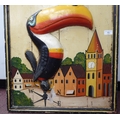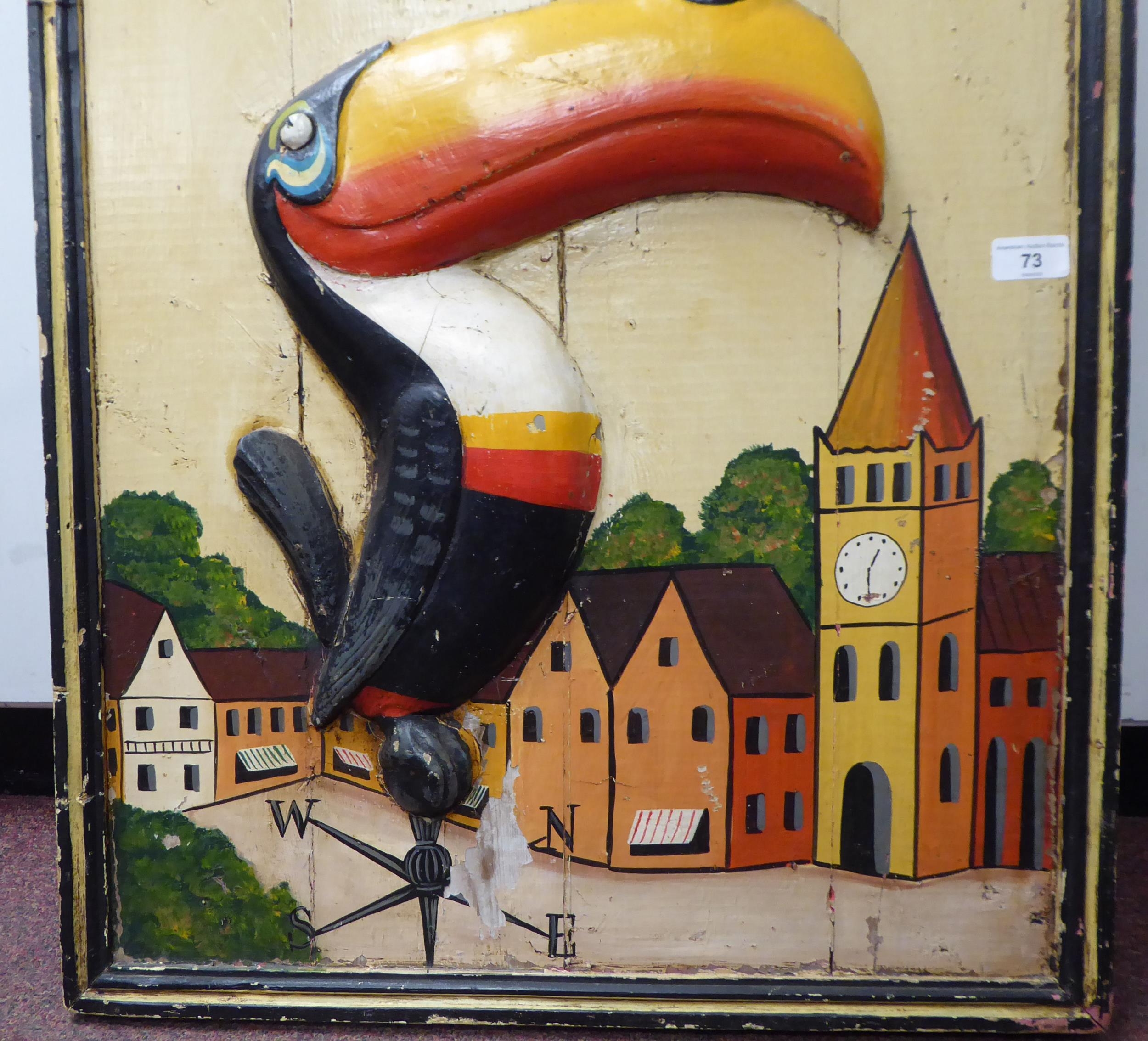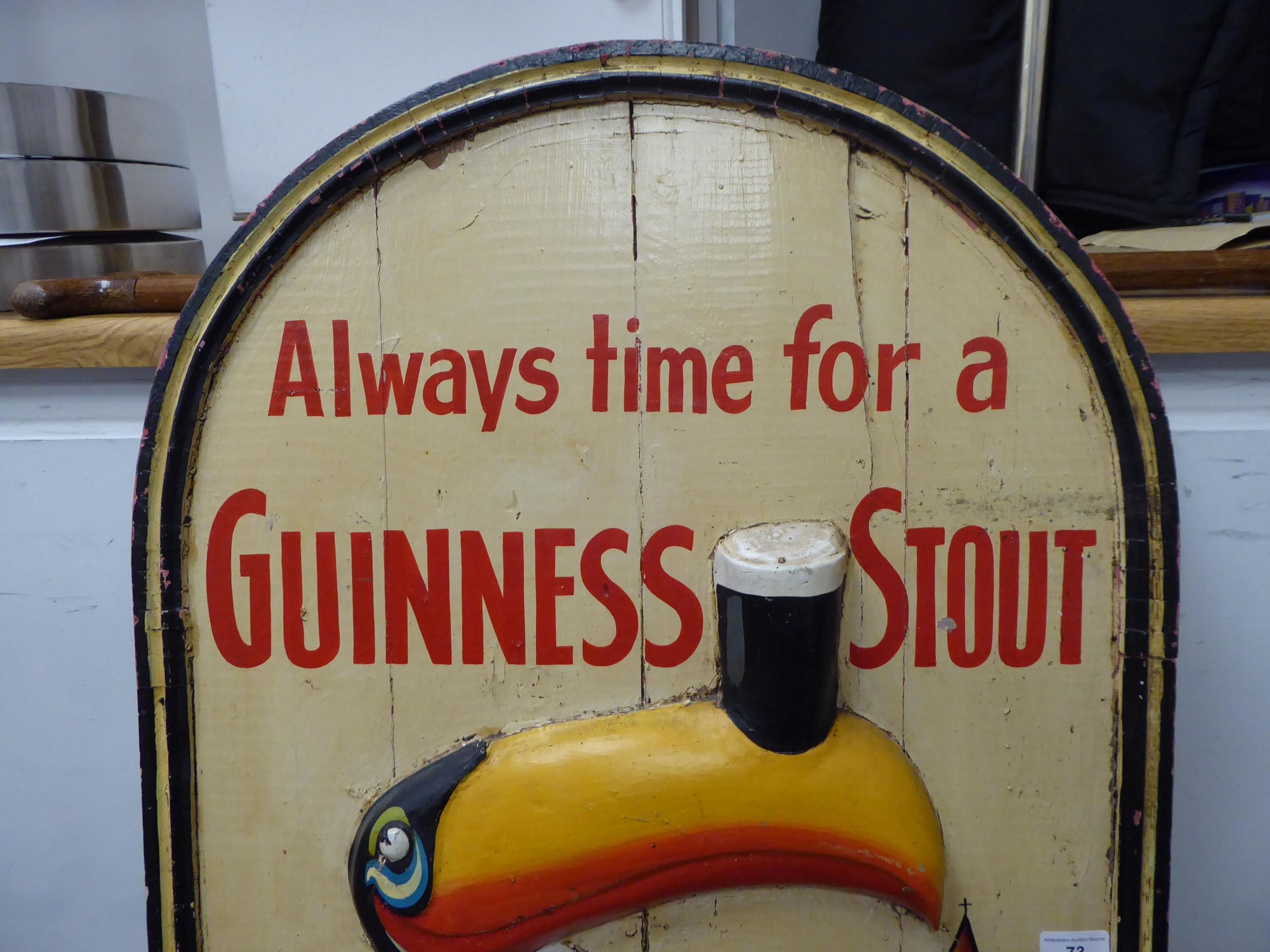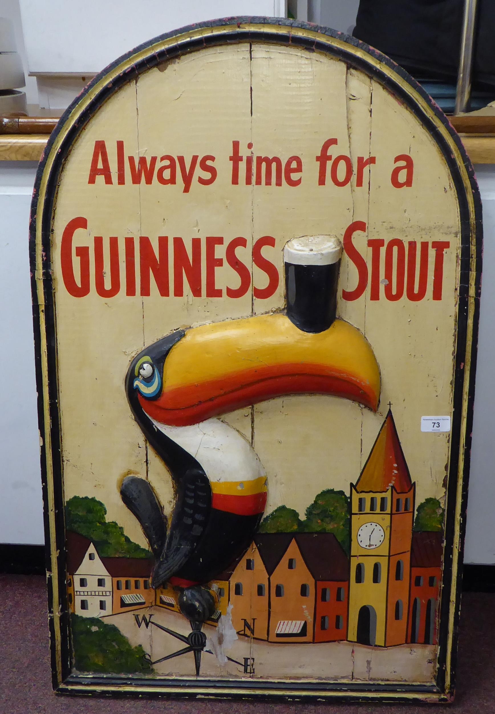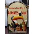 A vintage advertising sign, inscribed 'Always Time for a Guinness Stout' featuring a Toucan, in an arched, painted and moulded wooden board 36"h 22"w