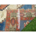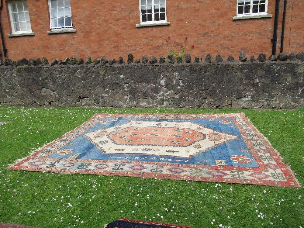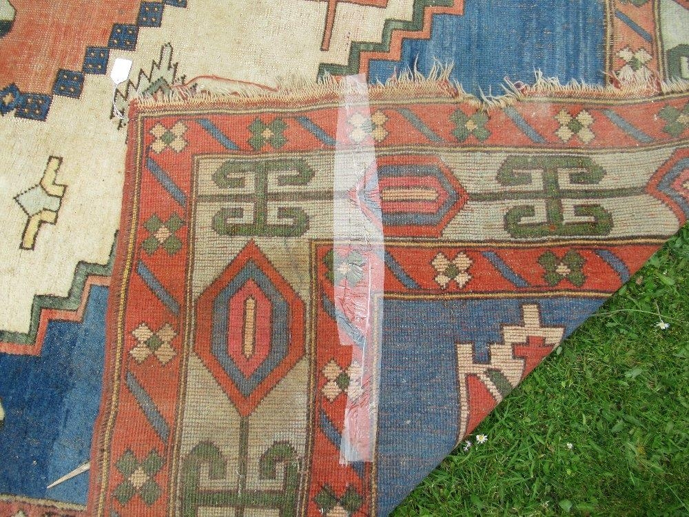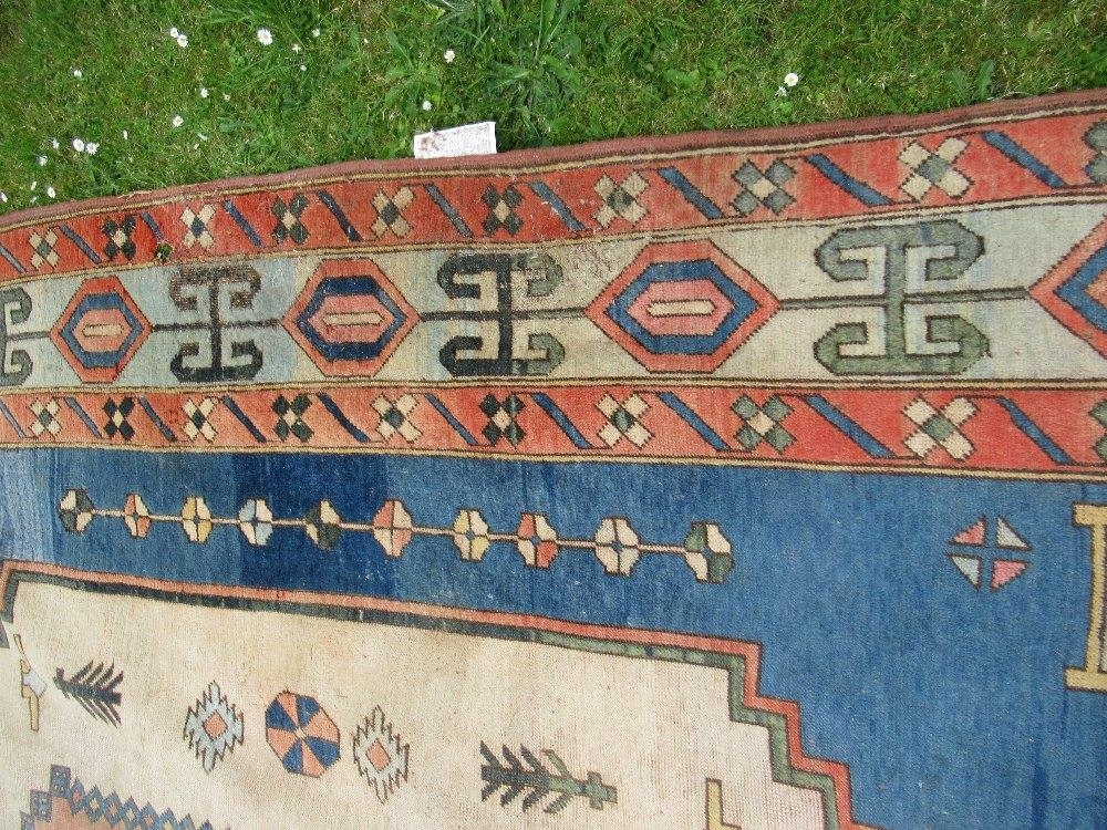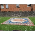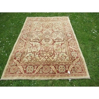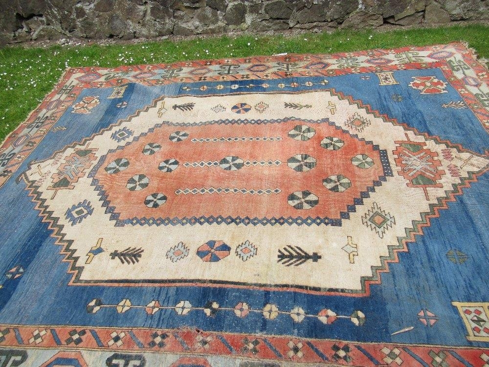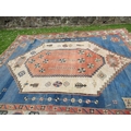 A large carpet with a central blue, salmon pink and beige ground decorated with motifs with a similar boarder approx 142ins x 116ins