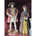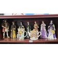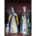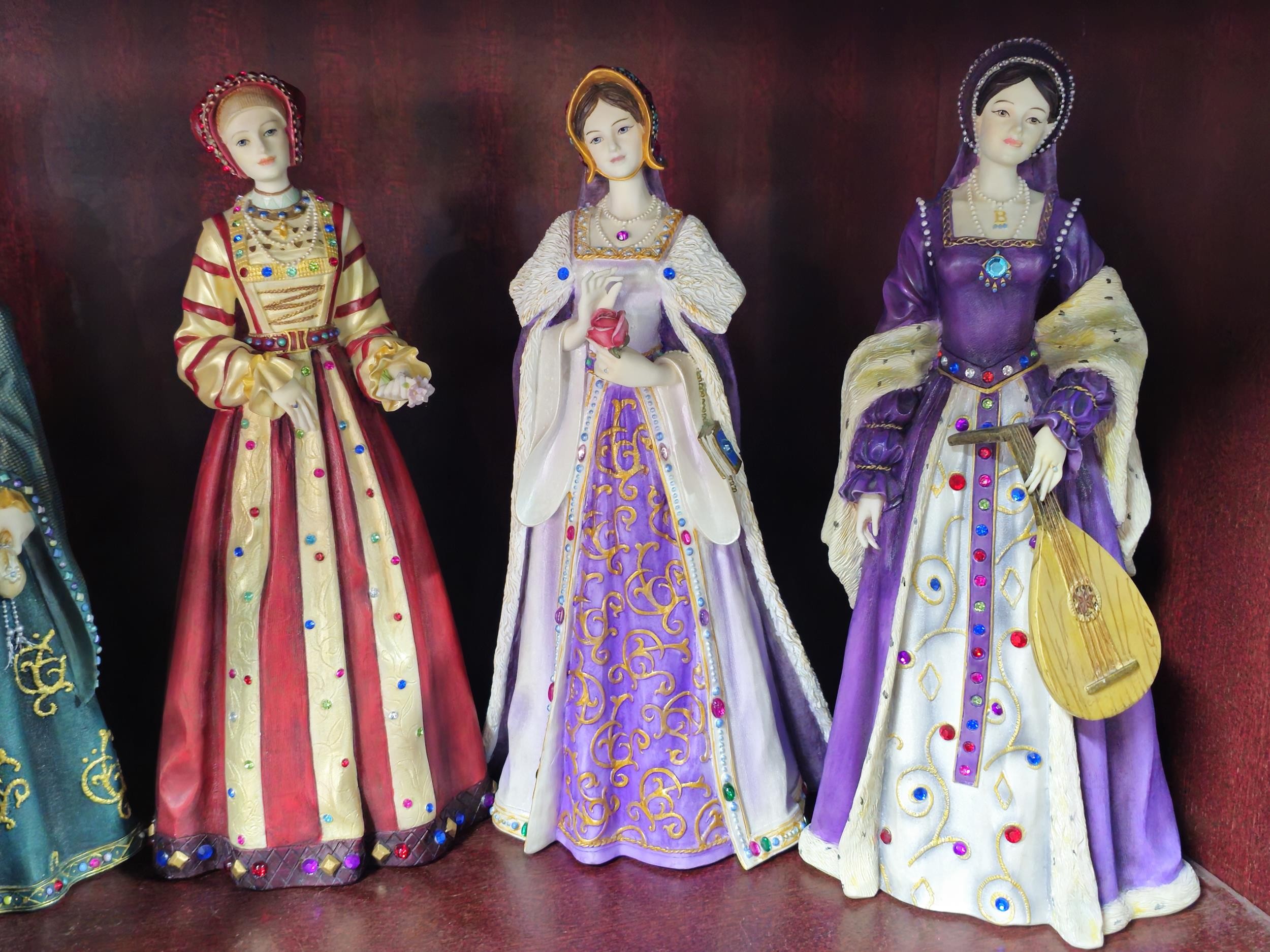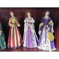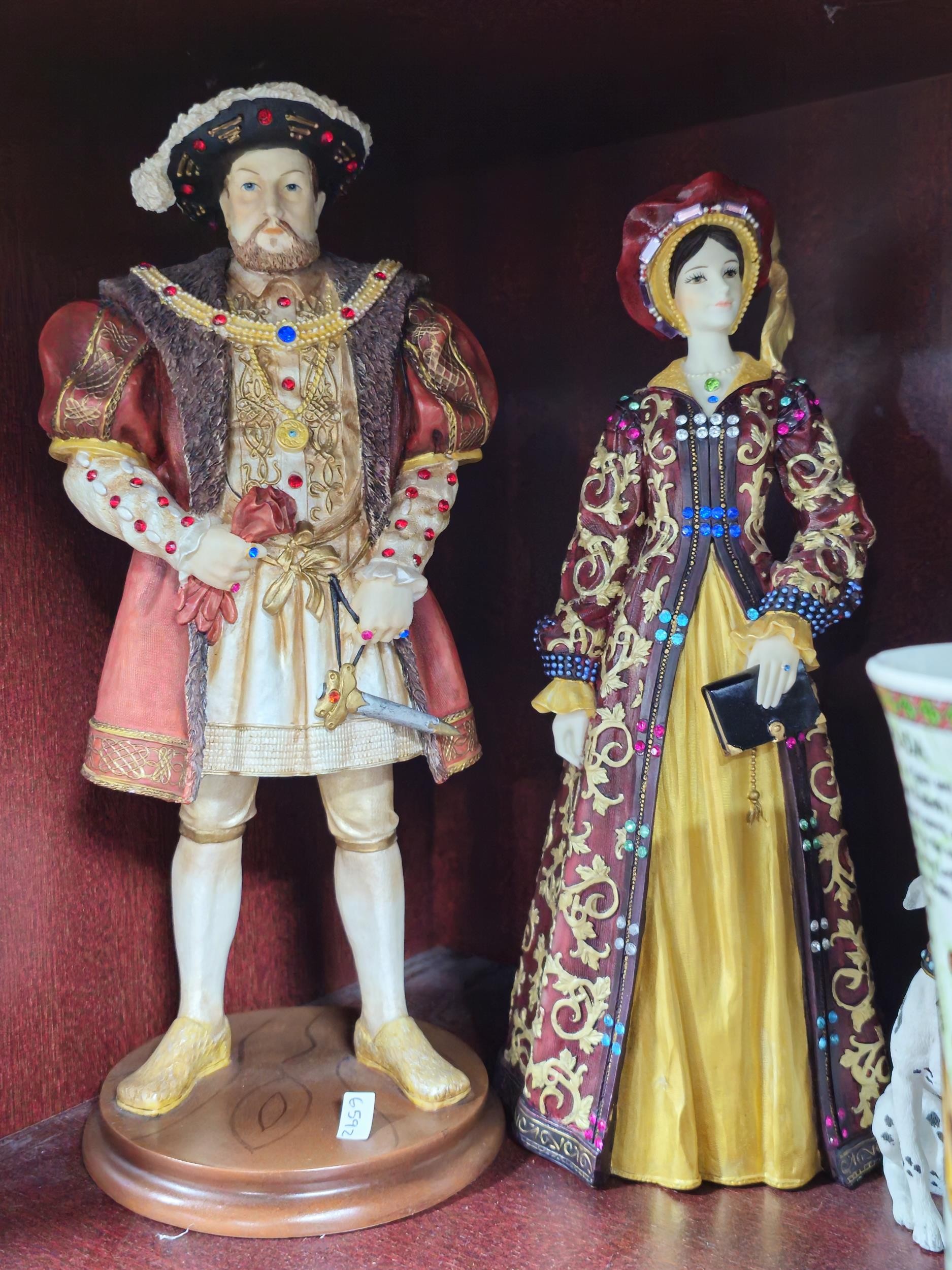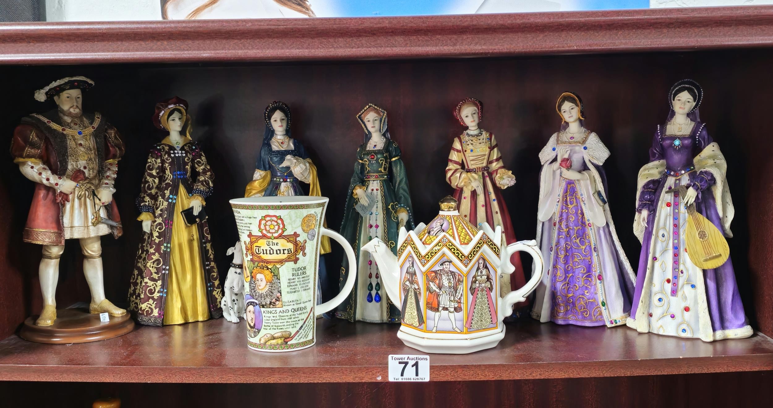 Collection of resin figurines by Regency Fine Arts to include Henry the VIII and his 6 wives, all are in good order in their period dress all with their names to the base, along with a Tudor mug and a Henry VIII themed teapot, The Henry figure measures 28cm high
