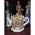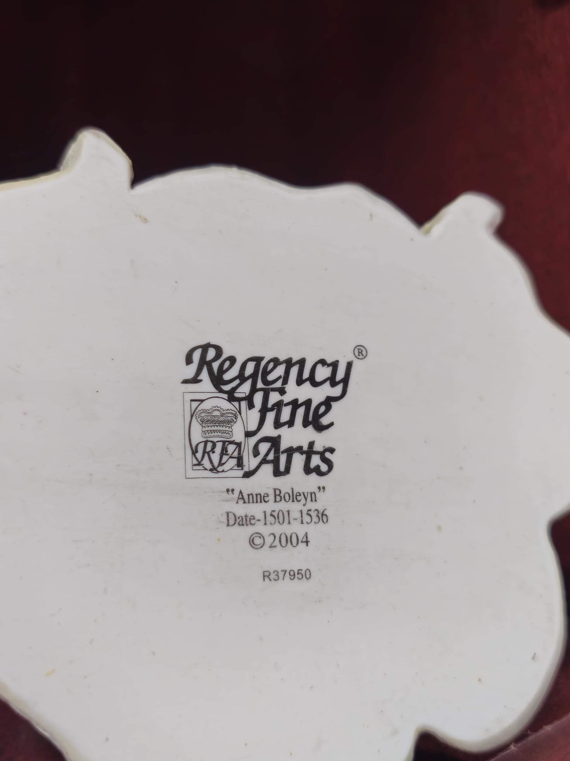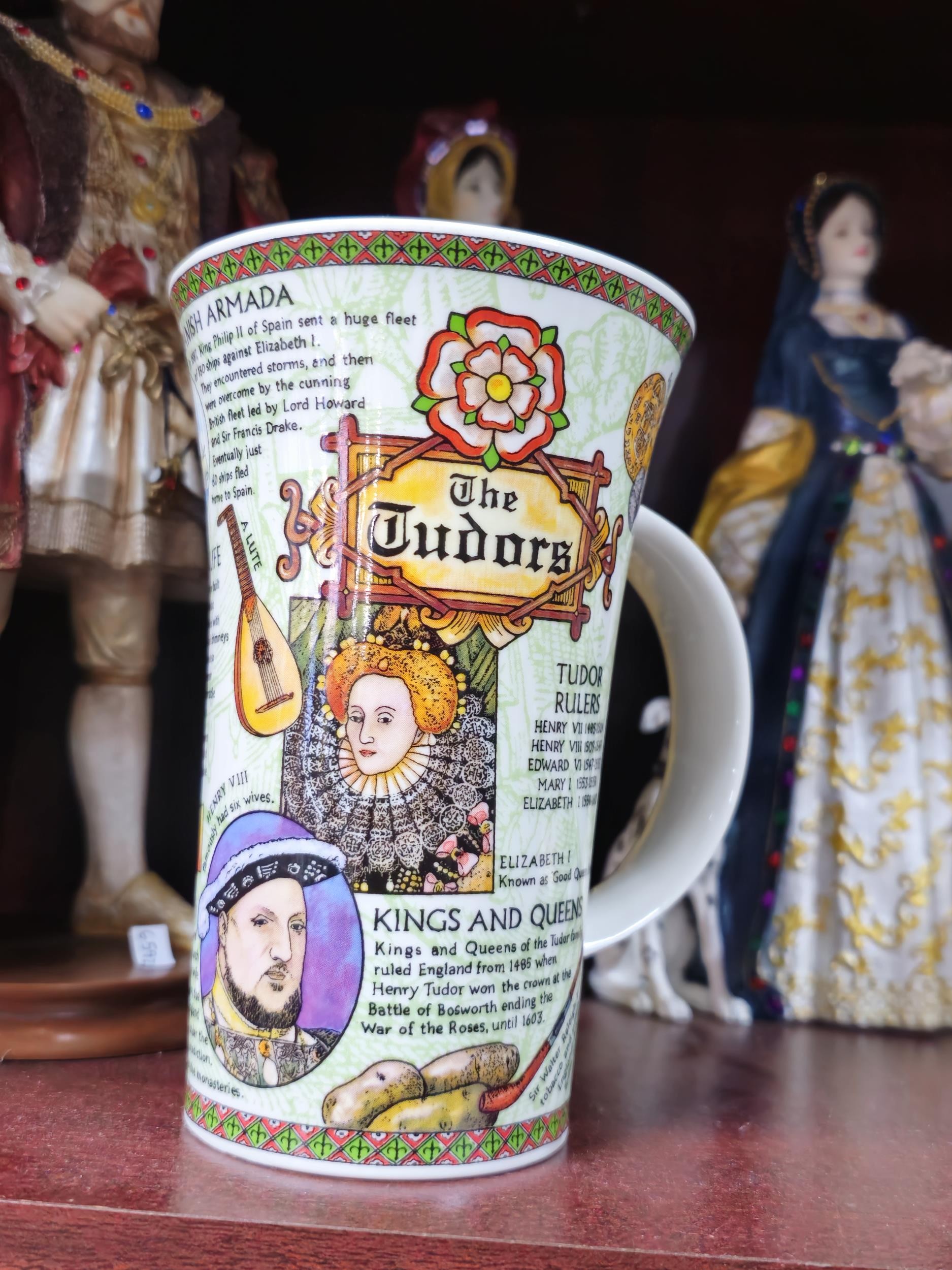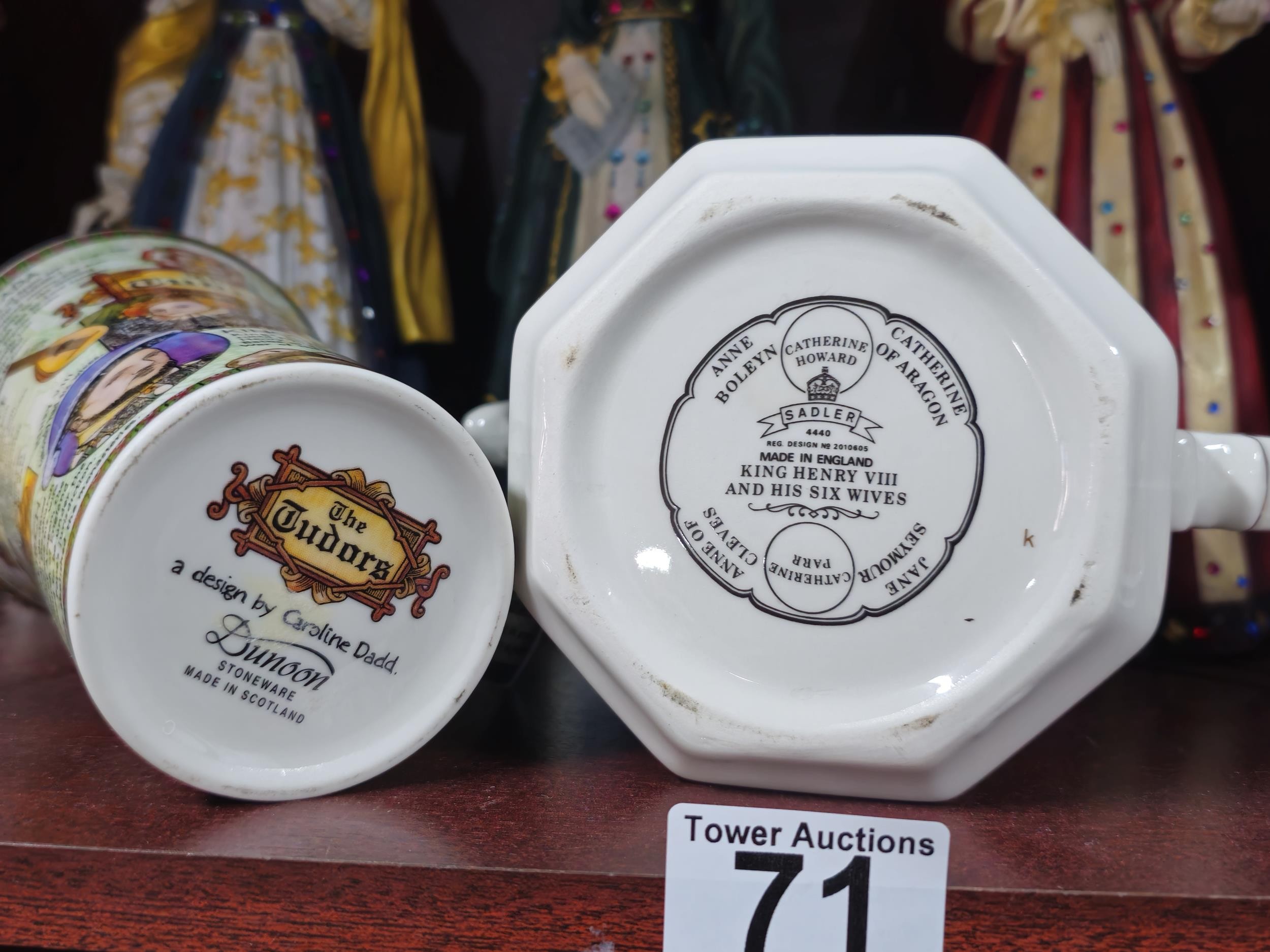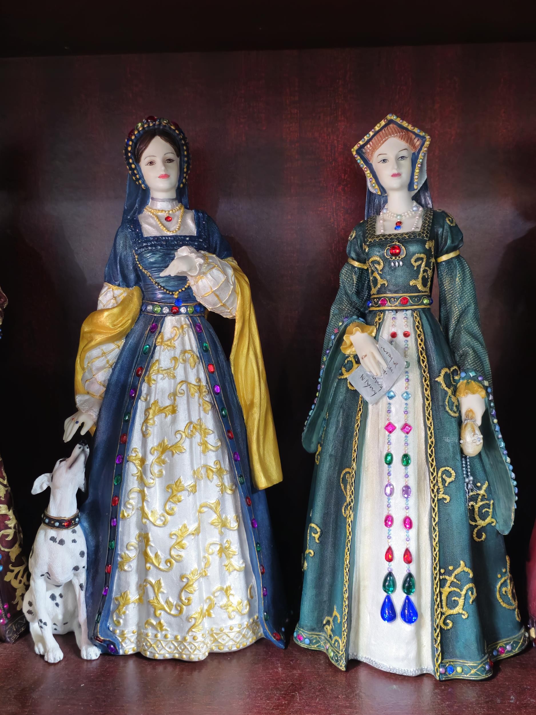 Collection of resin figurines by Regency Fine Arts to include Henry the VIII and his 6 wives, all are in good order in their period dress all with their names to the base, along with a Tudor mug and a Henry VIII themed teapot, The Henry figure measures 28cm high