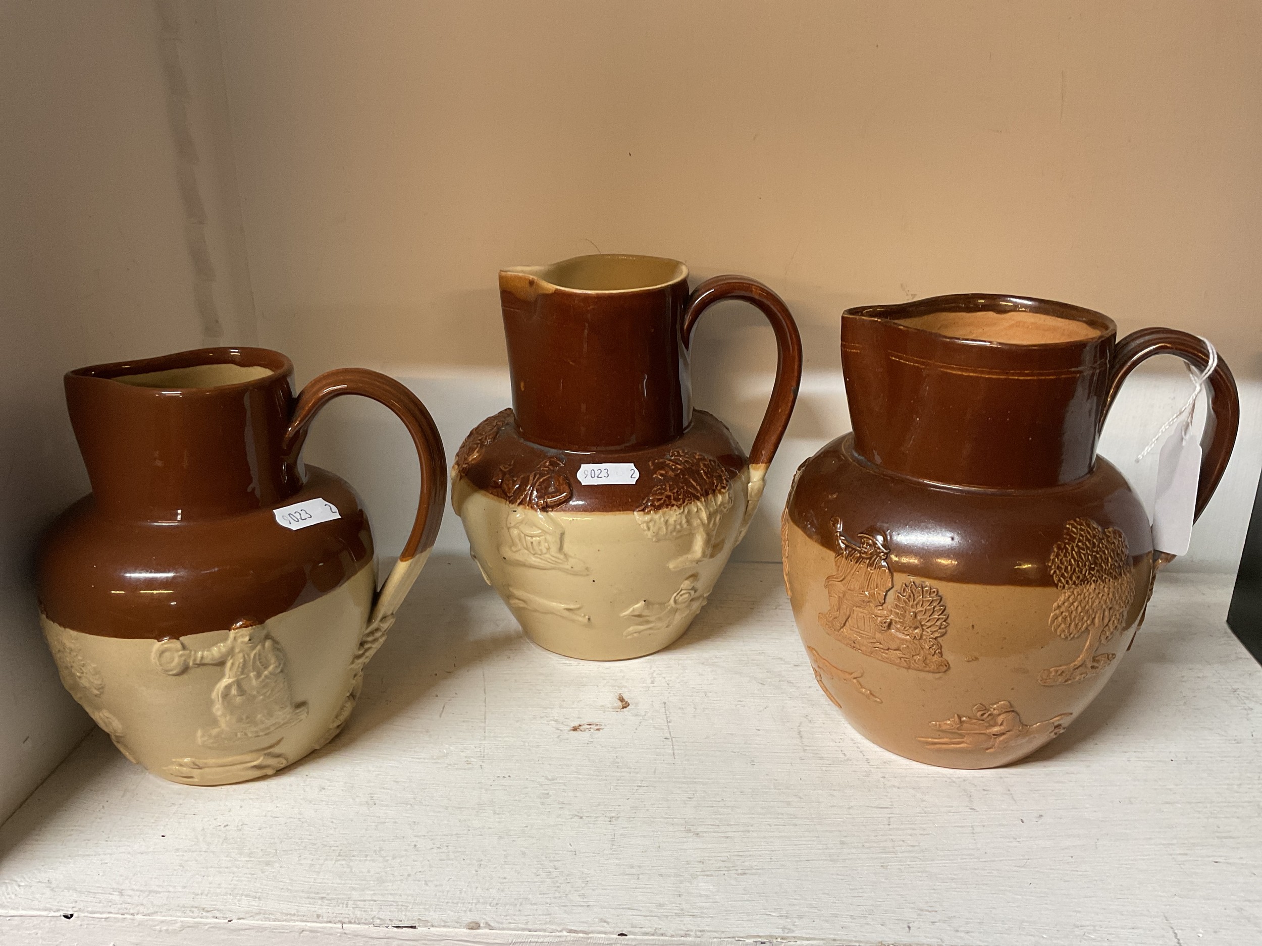 Three Doulton Lambeth stone-ware jugs with toper decoration